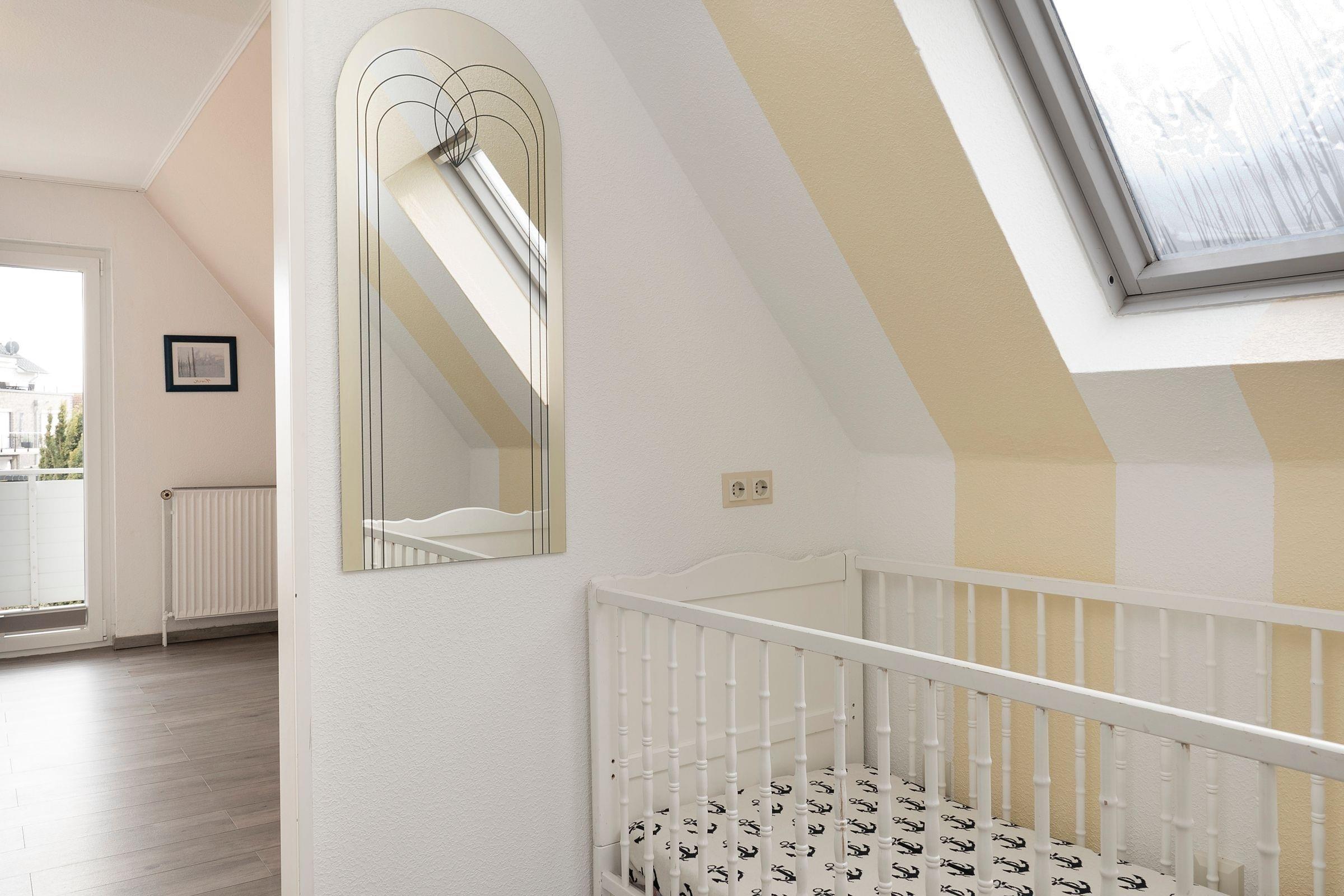 Schlafzimmer 2 im OG: 1 Doppelbett (2 x90x200cm), Kleiderschrank, Verdunkelung: Plissee, Platz für Babybett vorhanden