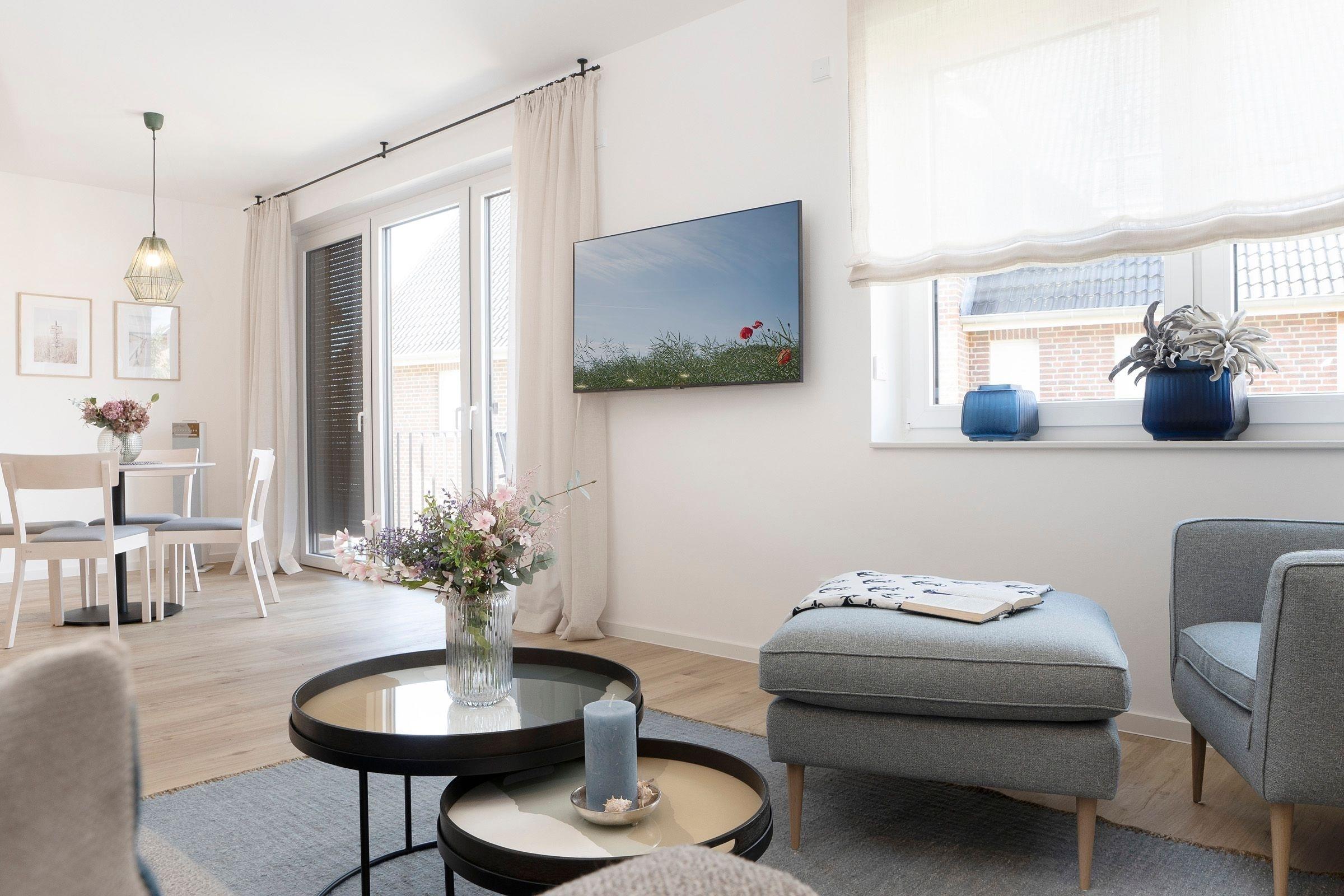 Mit dem Fahrstuhl erreichen Sie bequem Ihr Urlaubsdomizil in der 1. Etage. Vom Flur aus gelangen Sie in den hellen Wohn-/Essbereich mit gemütlicher Schlafcouch (140x200 cm) und Zugang auf den möblierten Südwest-Balkon mit elektrischer Markise. Die zum Wohnzimmer offen gestaltete Küche ist mit nahezu allen Annehmlichkeiten ausgestattet, am angrenzenden Esstisch können Sie Ihre Mahlzeiten gemeinsam einnehmen.