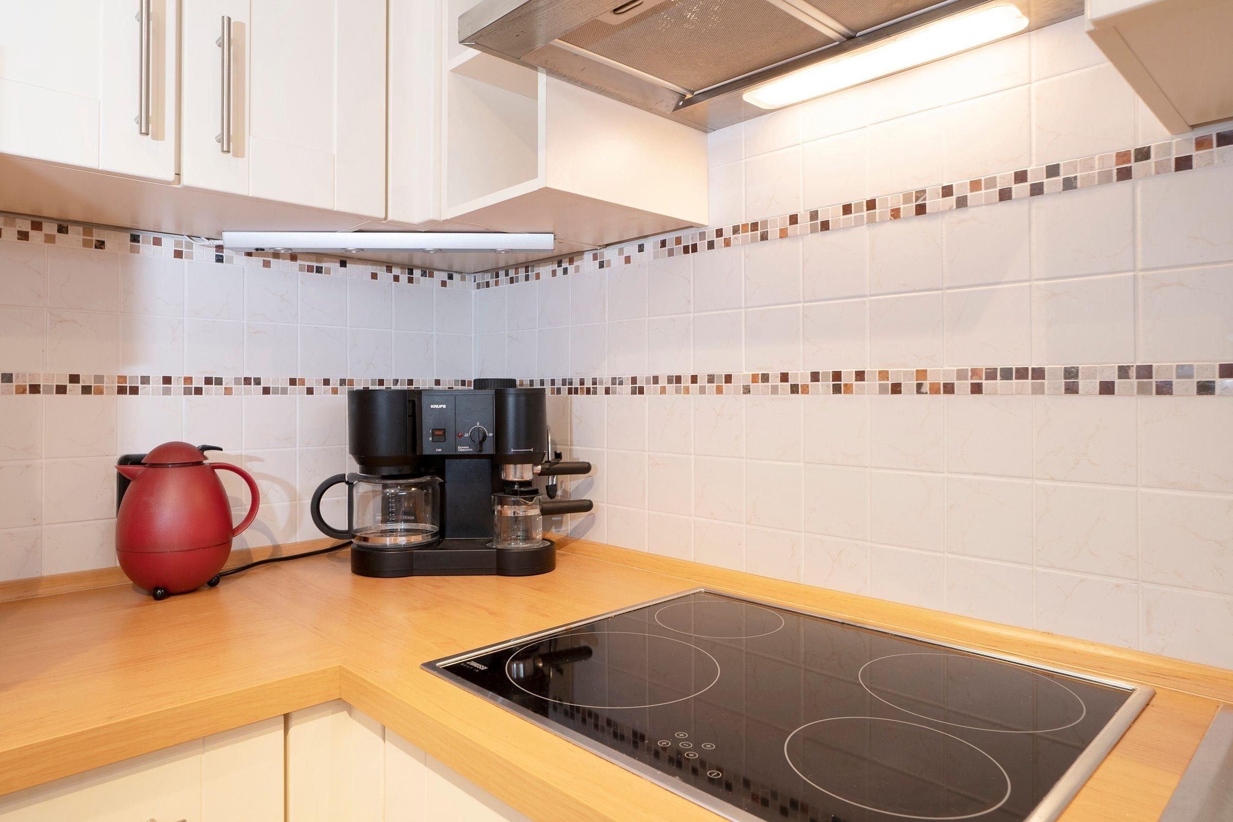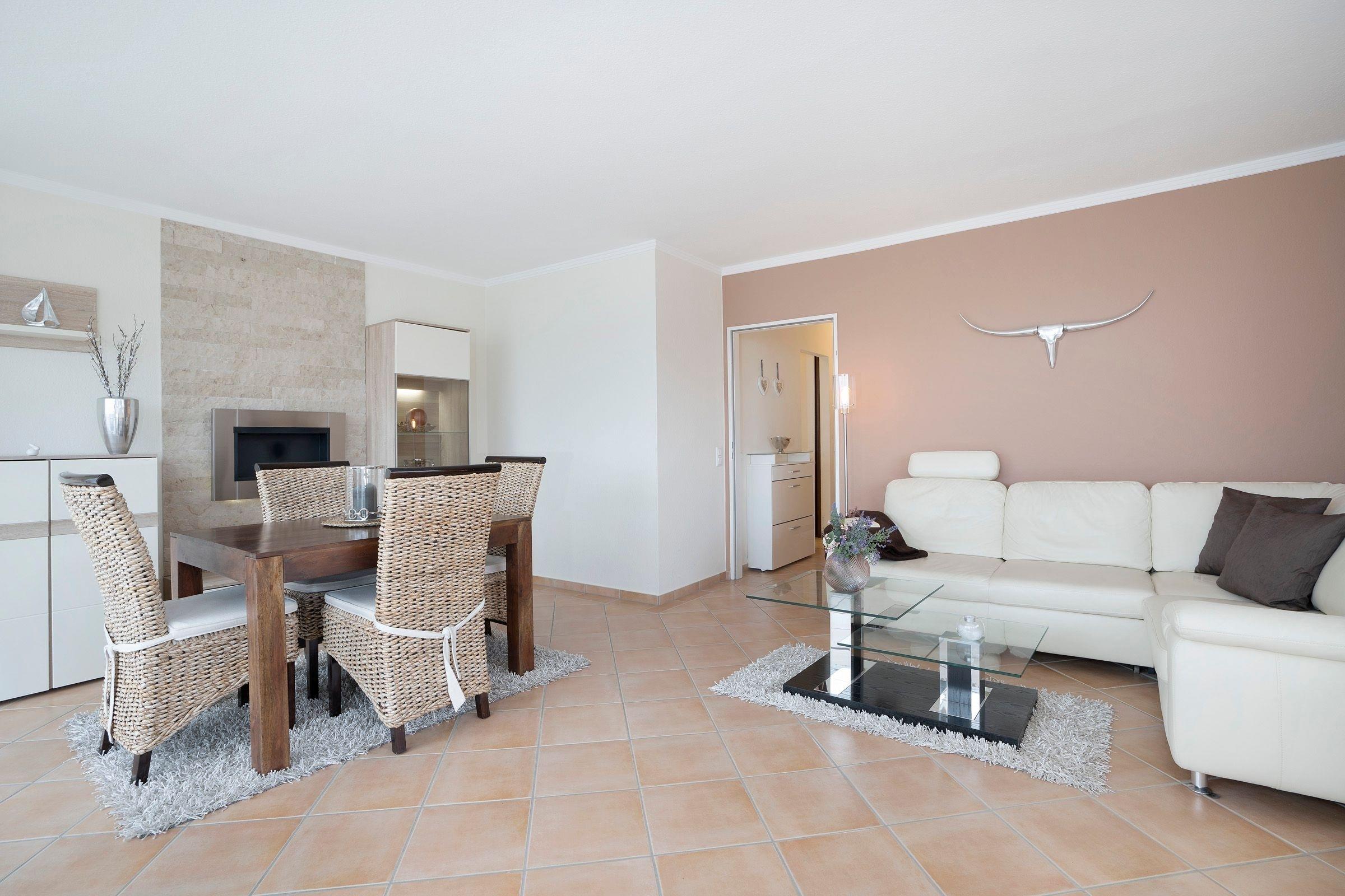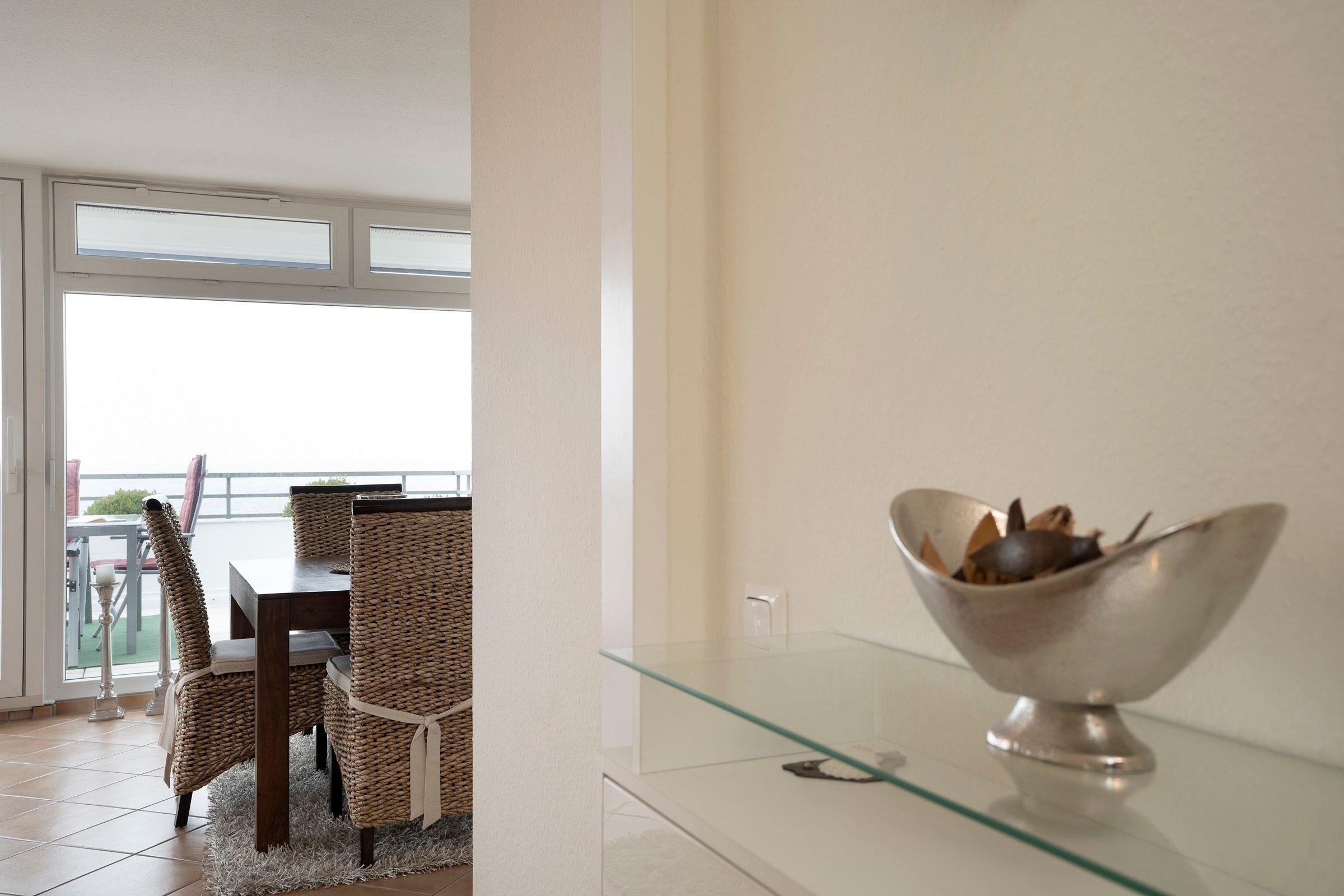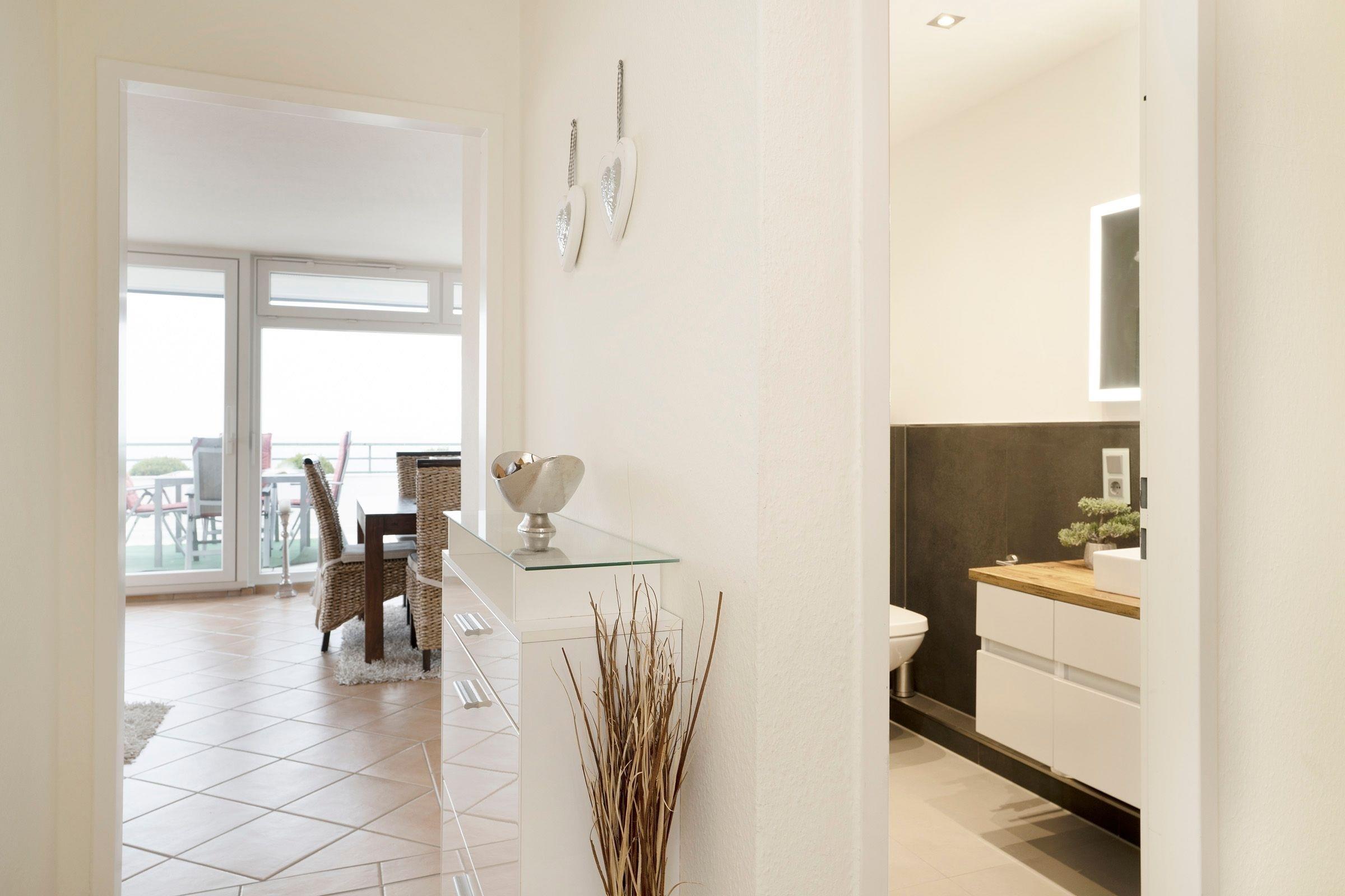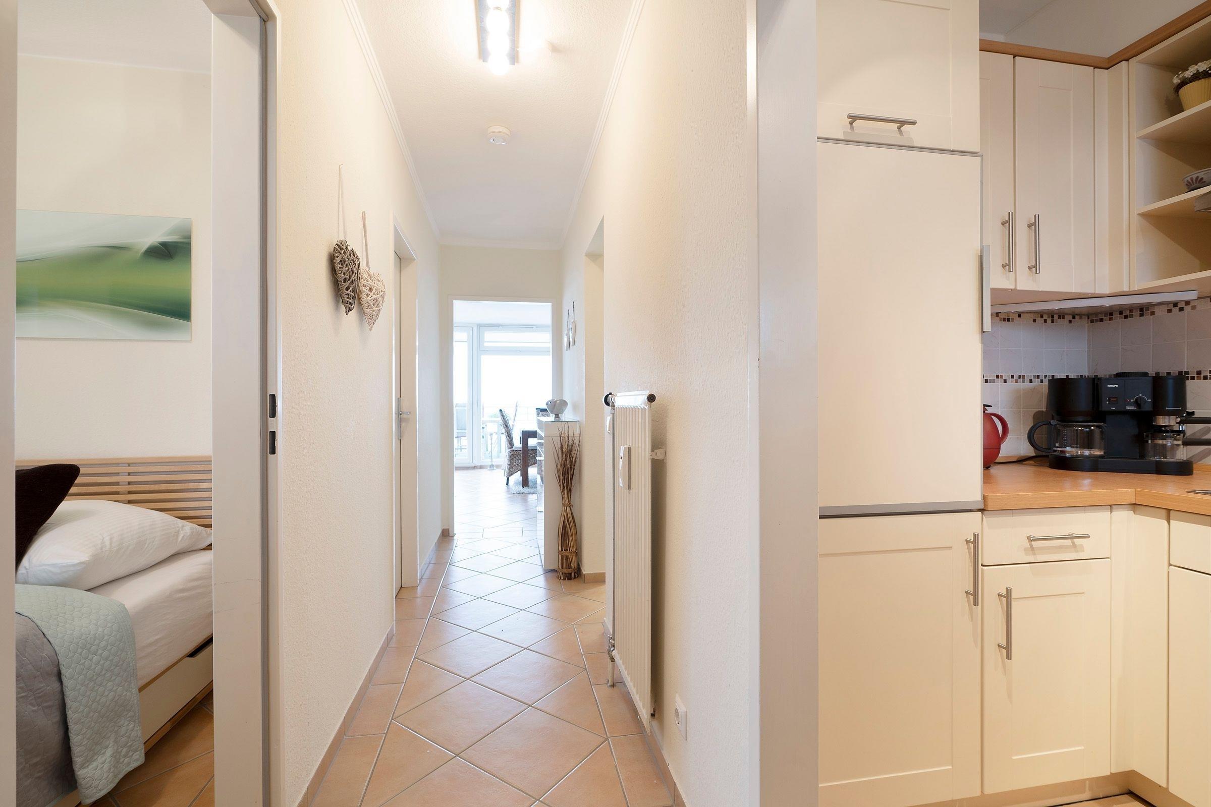 Mit dem Fahrstuhl erreichen Sie bequem Ihr Urlaubsdomizil in der 6. Etage. Vom Flur aus gelangen Sie in den Wohn-/Essbereich mit gemütlichem Sofa und Zugang auf den 25 m² großen, möblierten Südost-Balkon. In der mit vielen Annehmlichkeiten ausgestatteten Küche können Sie Ihre Urlaubsmahlzeiten zubereiten und anschließend gemeinsam am Esstisch einnehmen.