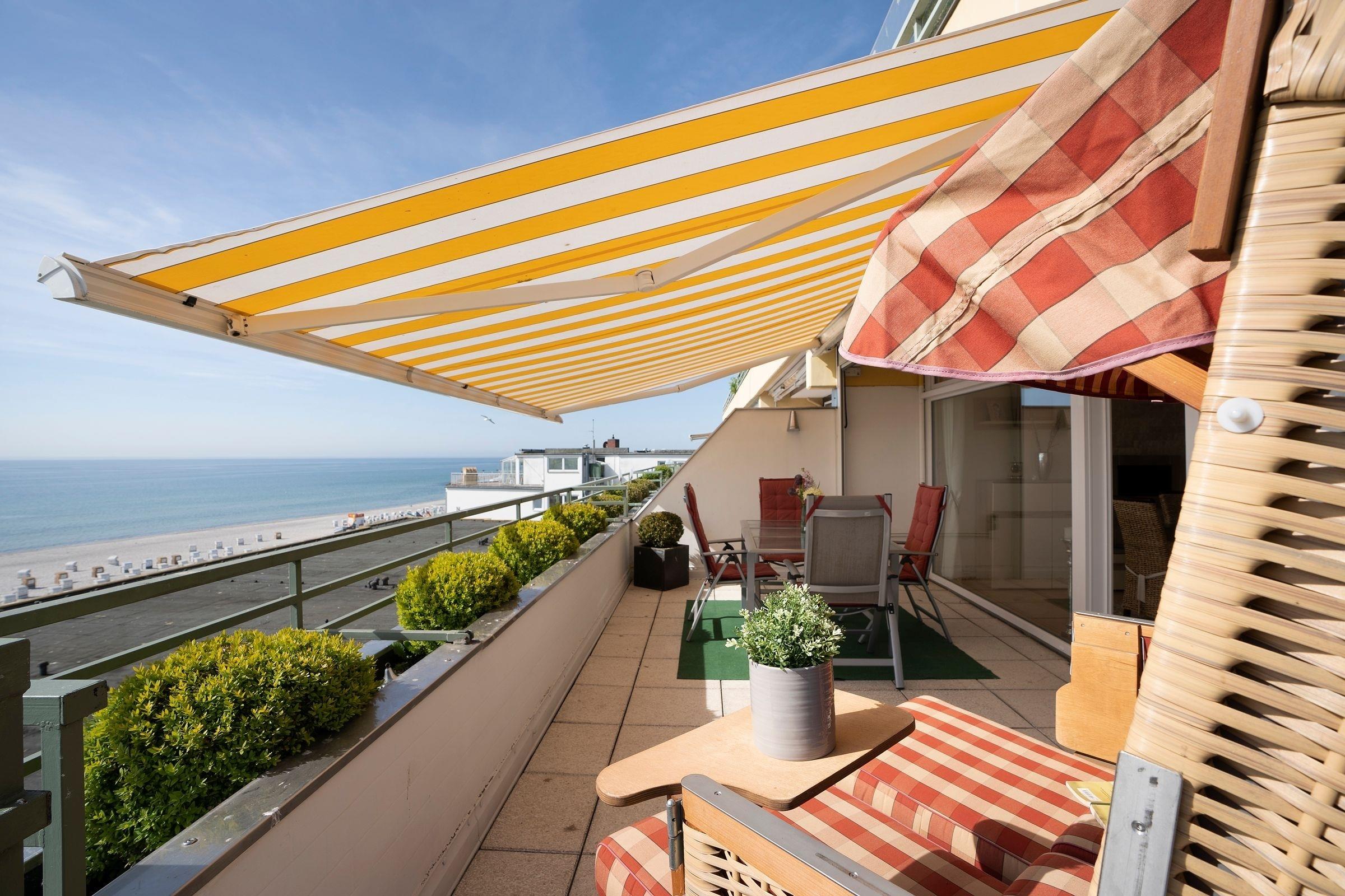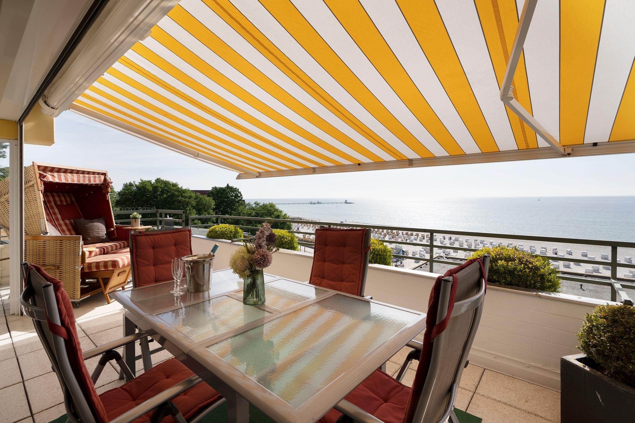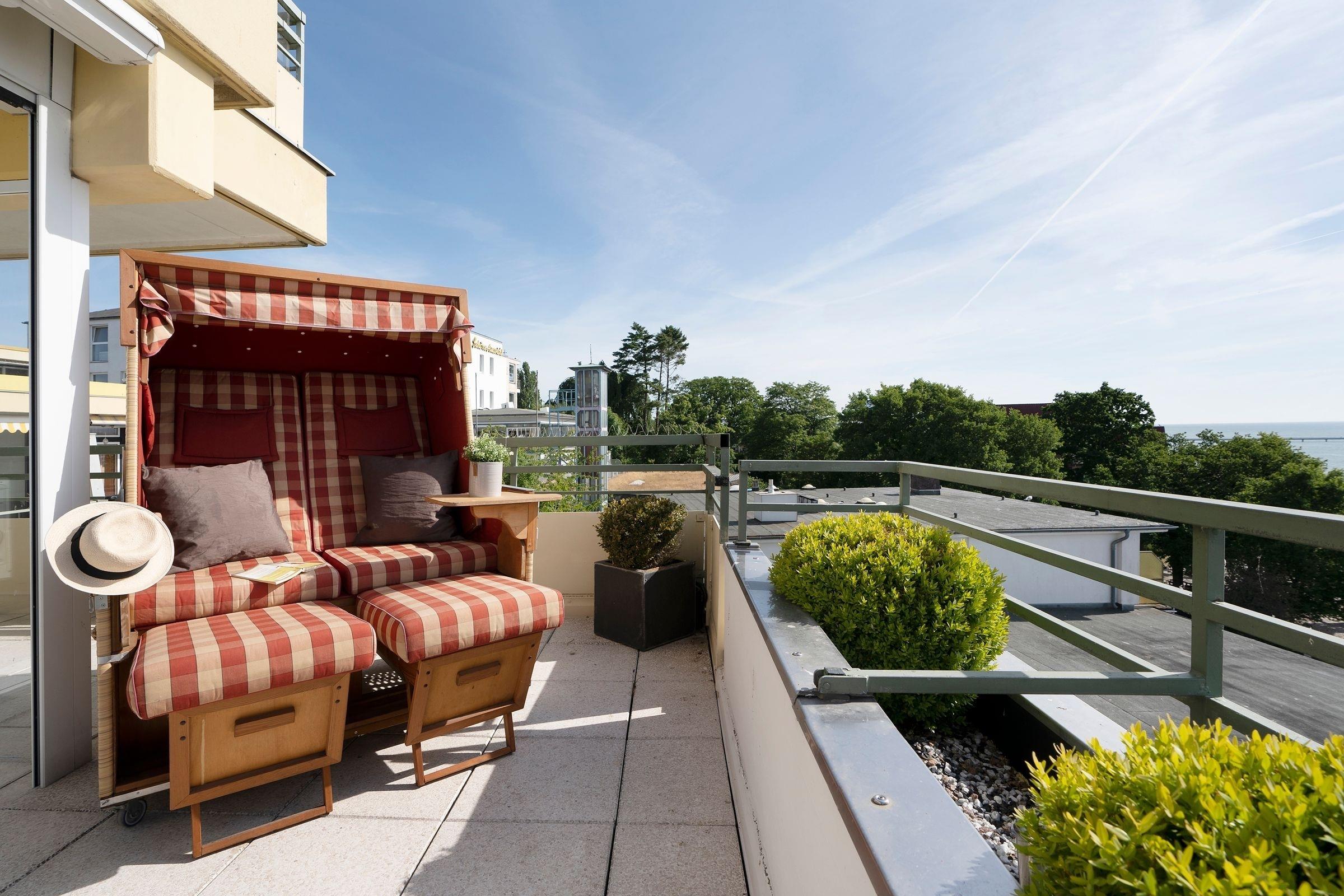Lassen Sie den Tag auf der Terrasse mit eigenem Strandkorb entspannt ausklingen.
