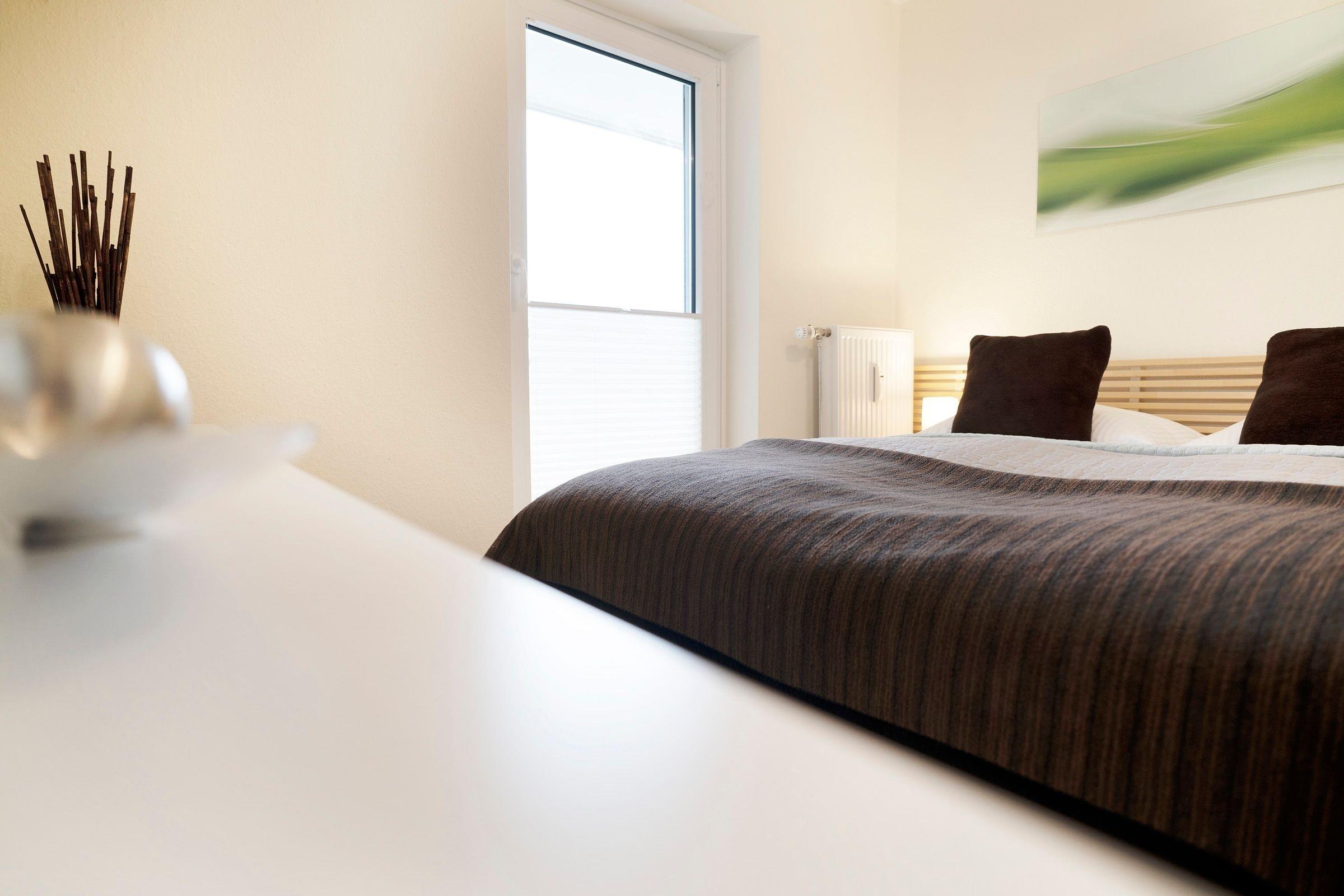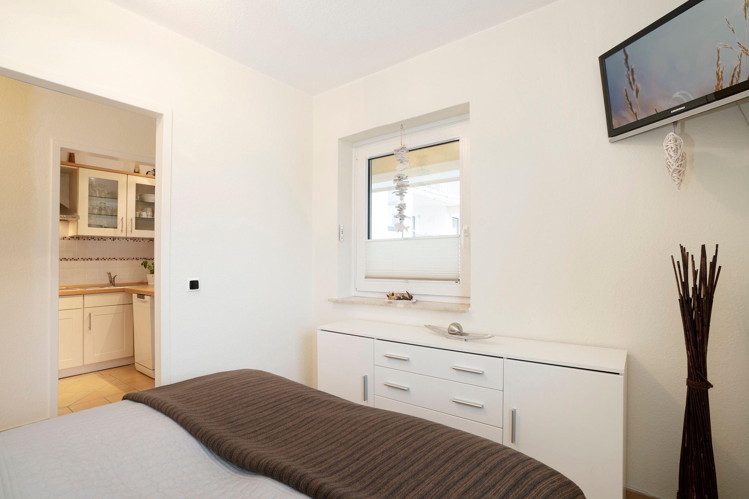 Geruhsame Nächte verbringen Sie im separaten Schlafzimmer mit gemütlichem Doppelbett mit durchgehender Matratze (160x200 cm), Ihre Urlaubsgarderobe können Sie im geräumigen Sideboard bequem verstauen. Das moderne Badezimmer erwartet Sie mit einer Dusche, Föhn sowie einem beheizbaren Handtuchhalter. Die gesamte Wohnung lässt sich durch Außenjalousien angenehm abdunkeln.