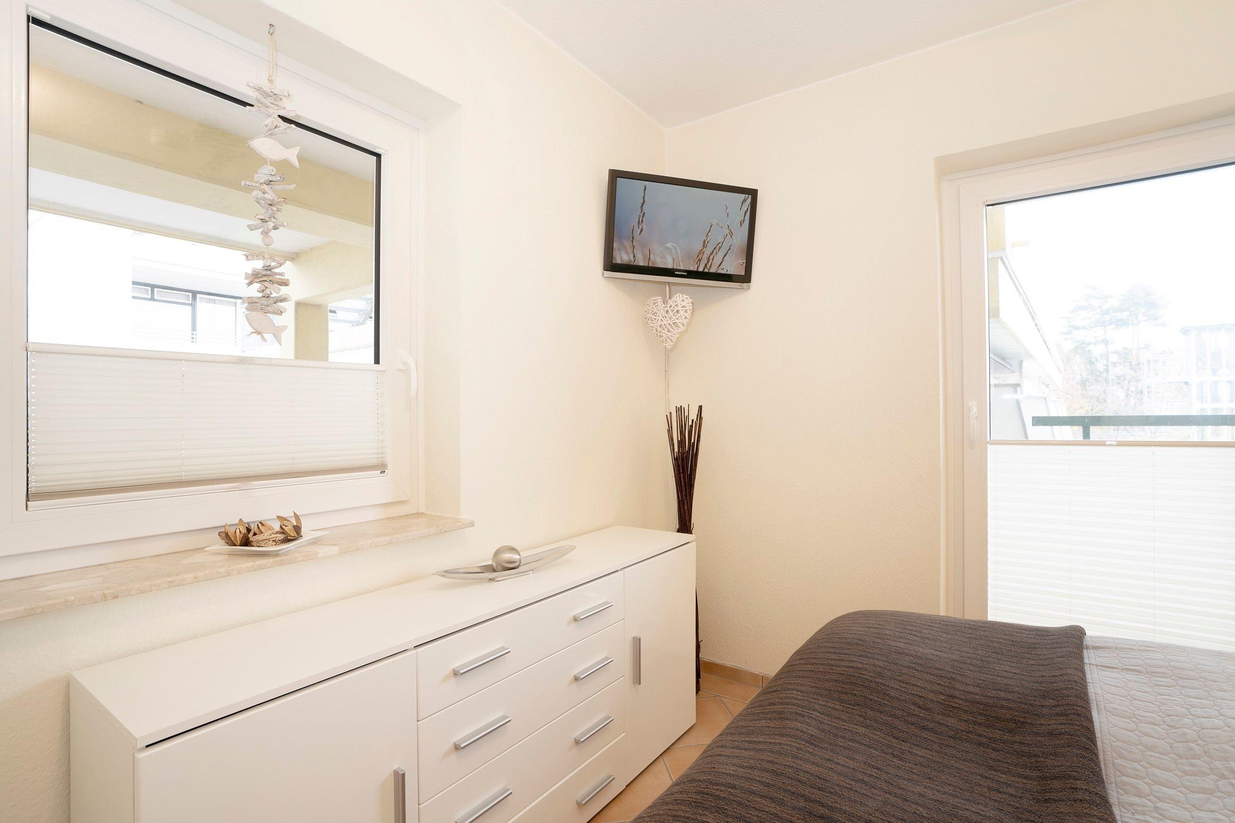 Schlafzimmer: 1 Doppelbett (160x200 cm), TV, Kleiderschrank, Verdunkelung: Außenrolladen, kein Platz für ein Babybett