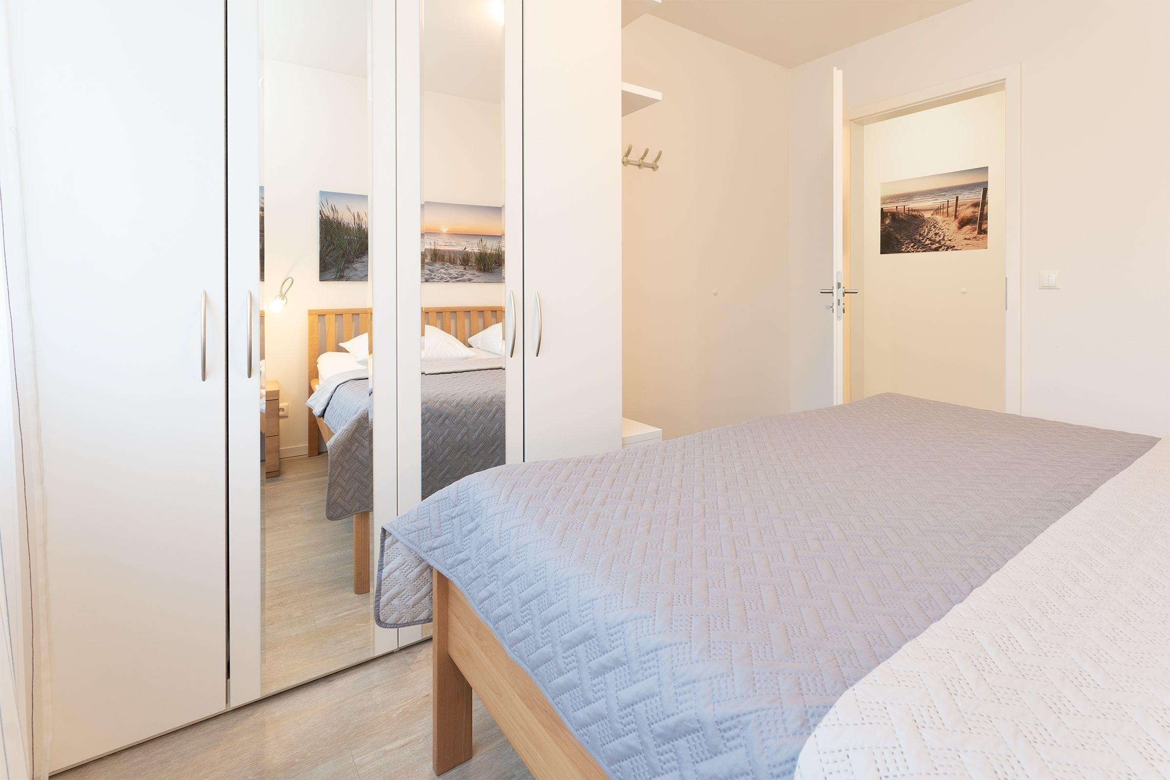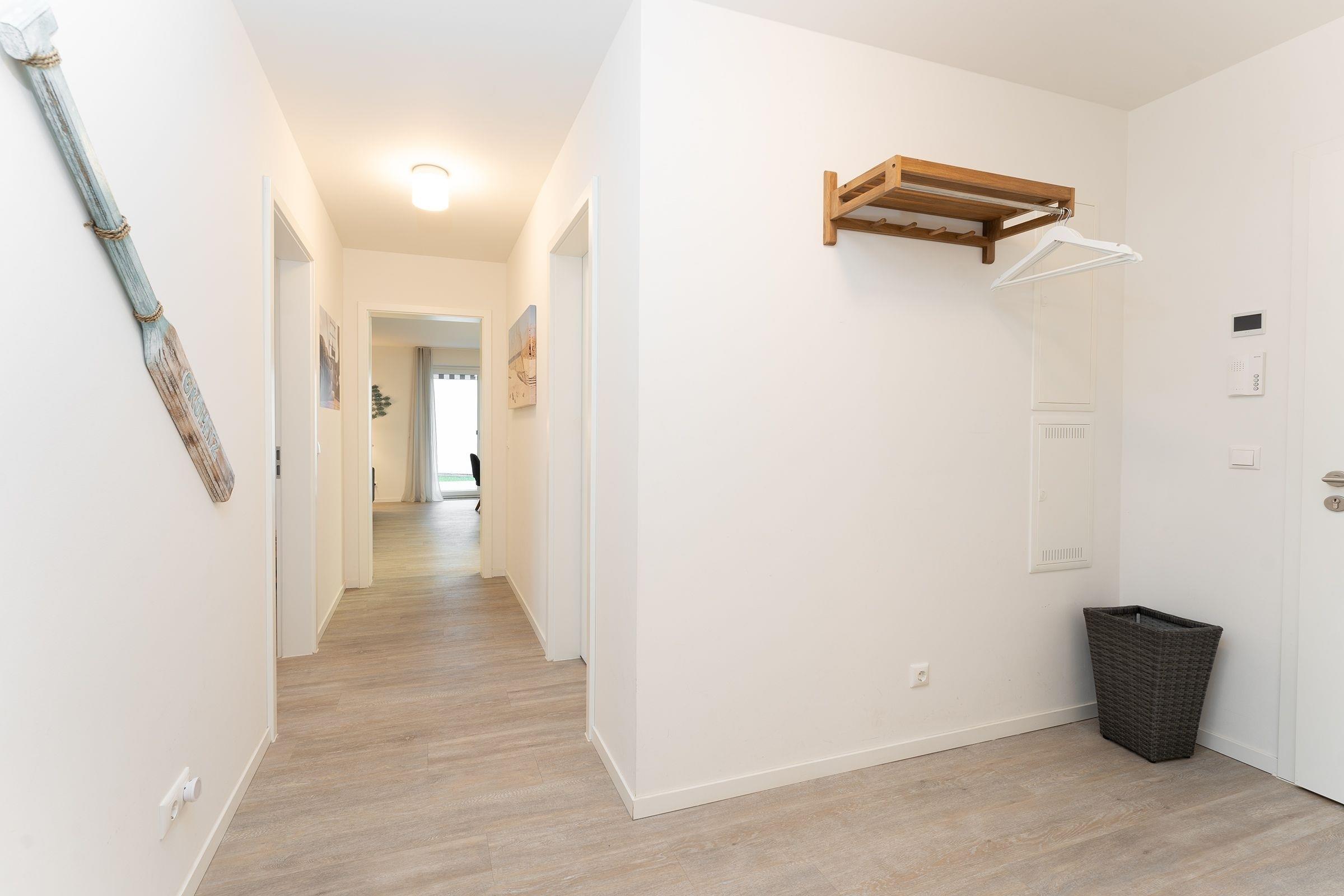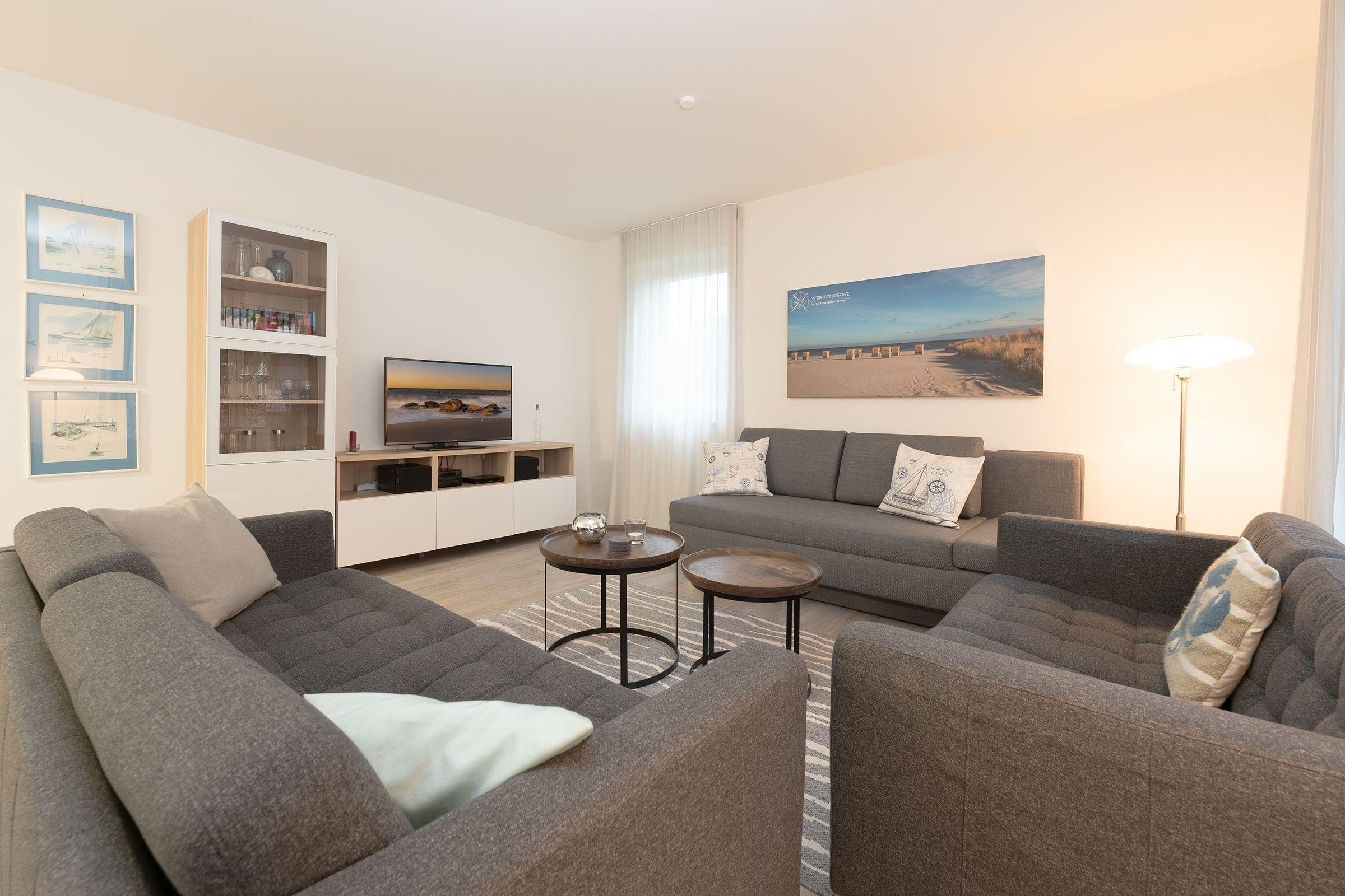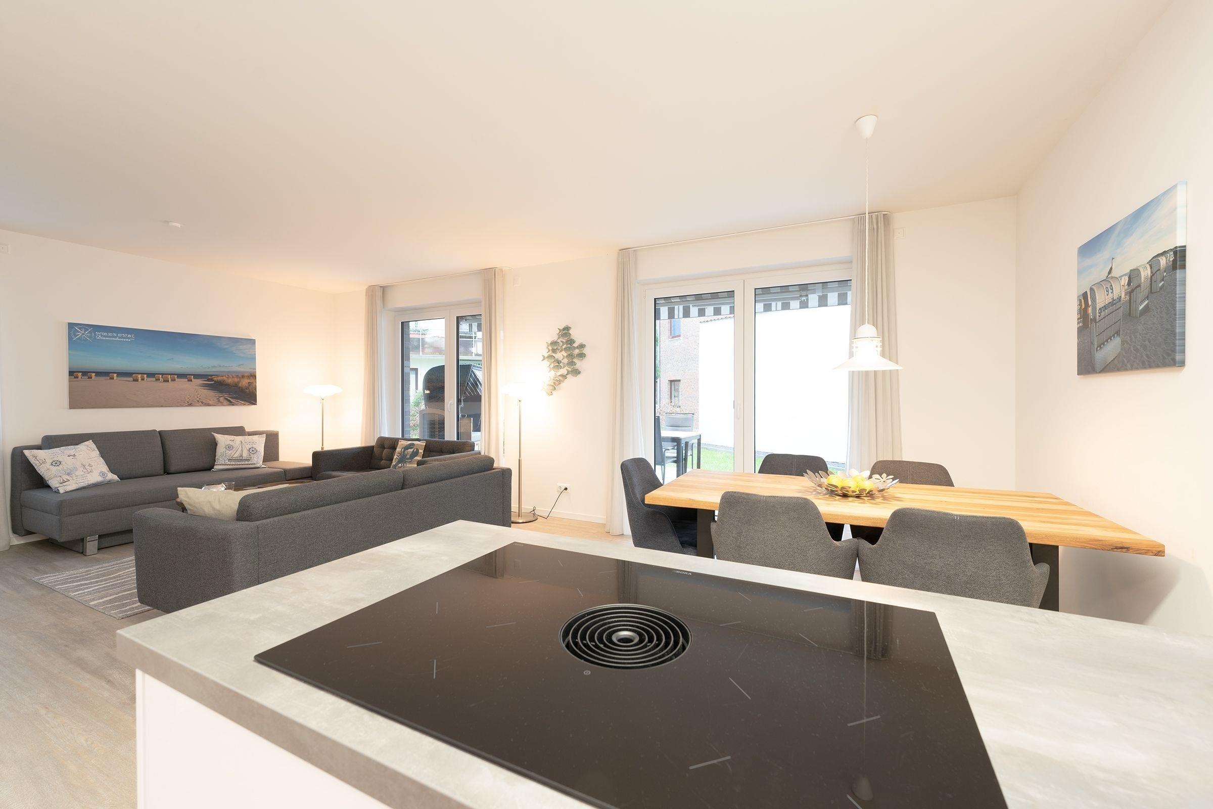Ein offen und modern gestalteter Wohnbereich bildet das Zentrum Ihres Urlaubsreiches. Von dort aus gelangen Sie auf die Sonnenterrasse inklusive eigenem Strandkorb, Elektrogrill und großzügigem Garten. Das Wohnzimmer bietet mit HiFi - Anlage und Smart TV gute Unterhaltung, während in der offenen Wohnküche das Abendessen auf dem Induktionsherd köchelt. Das Schlafsofa lässt sich ausklappen und als Bett (150x200cm) für eine Einzelperson nutzen. Die weiteren Gäste verteilen sich auf die beiden Schlafzimmer, die jeweils über einen Kleiderschrank, elektrische Außenjalousien und ein großes Doppelbett (2x 90x200cm) verfügen. Als weitere Räume finden Sie hier einen Abstellraum, ein separates Gäste-WC, sowie das Tageslichtbad mit ebenerdiger Dusche und beheizbarem Handtuchhalter. Besonderen Komfort bietet die Fußbodenheizung in der gesamten Wohnung.