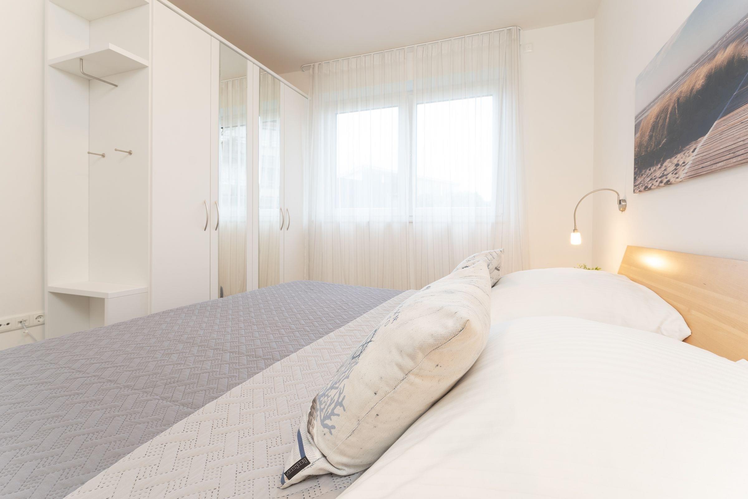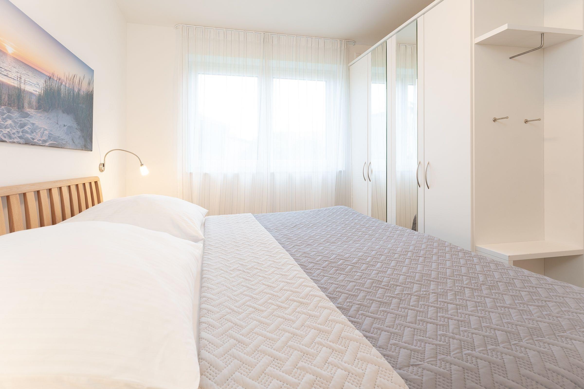 Schlafzimmer 1: Doppelbett (2x 90x200 cm), Kleiderschrank, Verdunkelung: elektr. Außenrollläden, Platz für Kinderreisebett vorhanden
