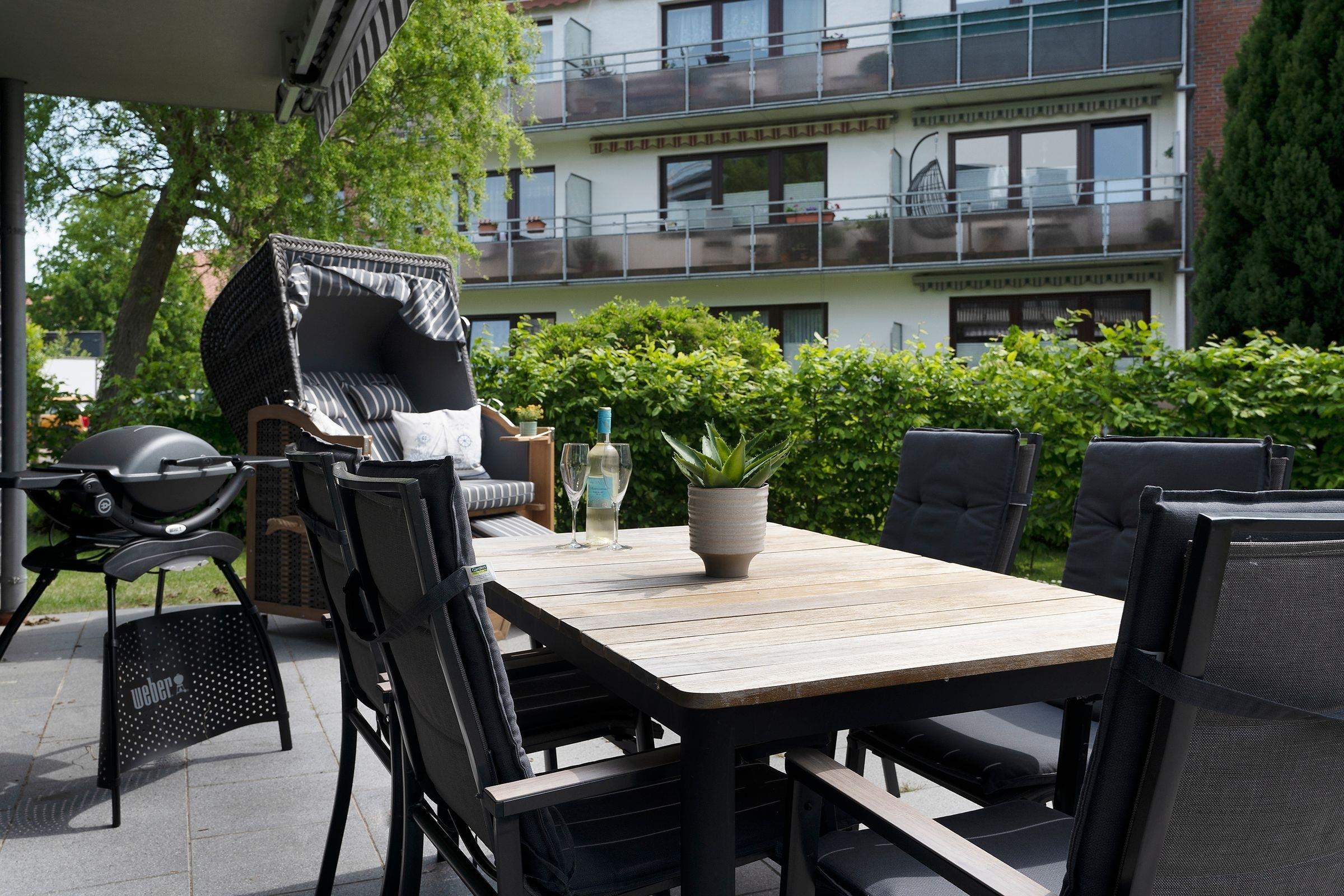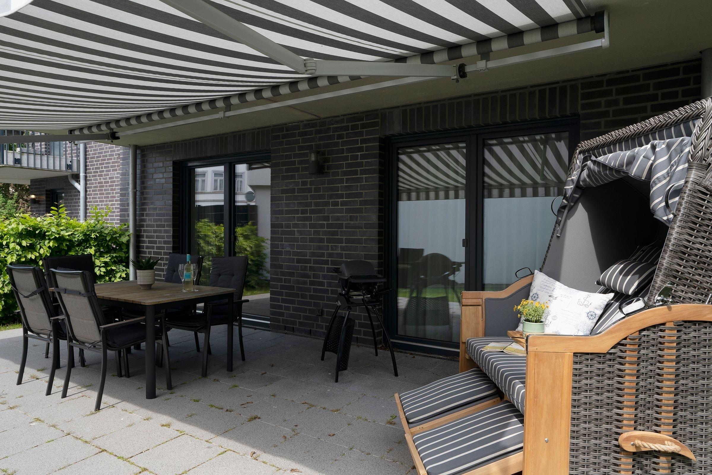 Moderne Ferienwohnung Wildrose mit Terrasse, Garten und Strandkorb in Grömitz, barrierearm und komfortabel für Erholung an der Ostsee.