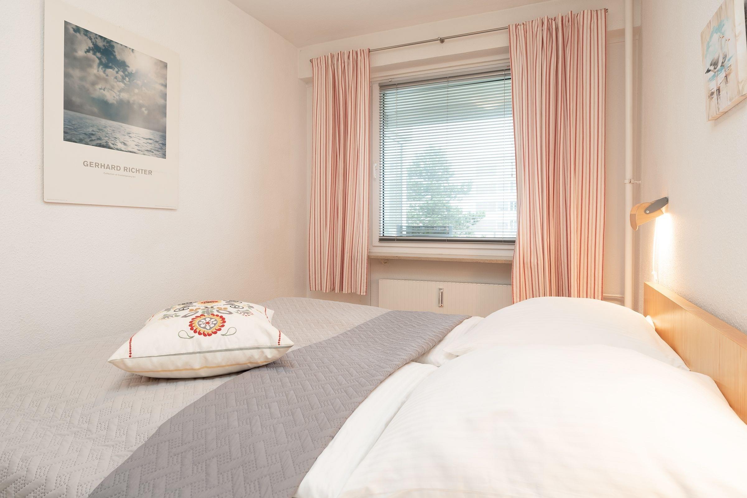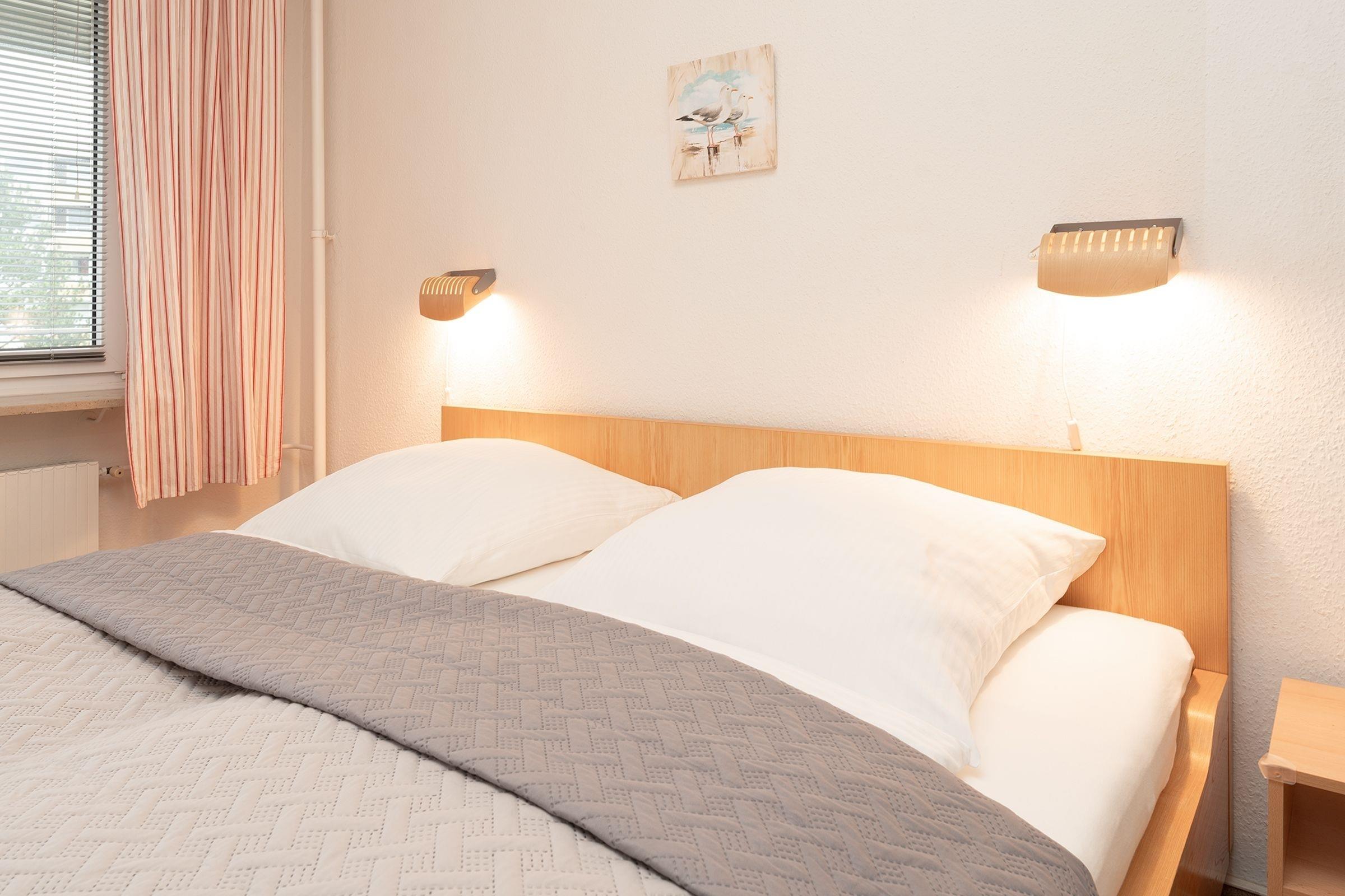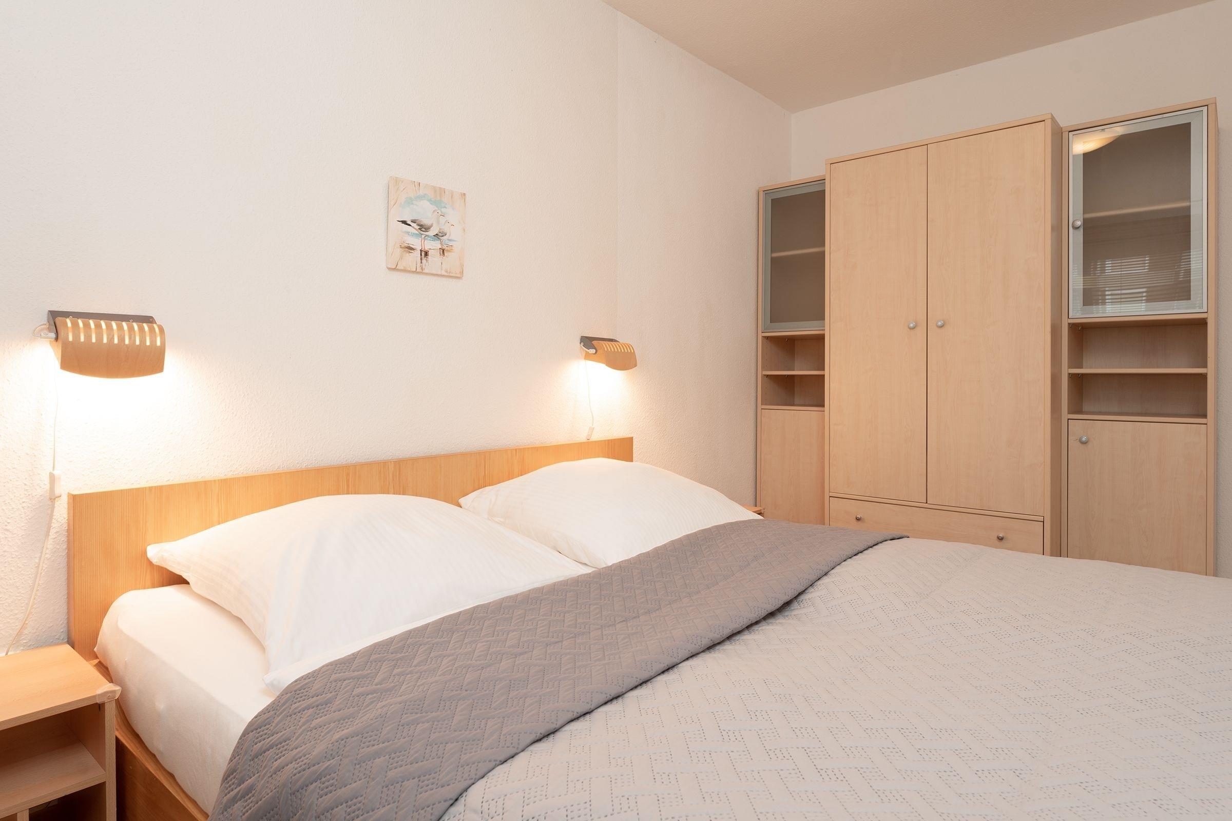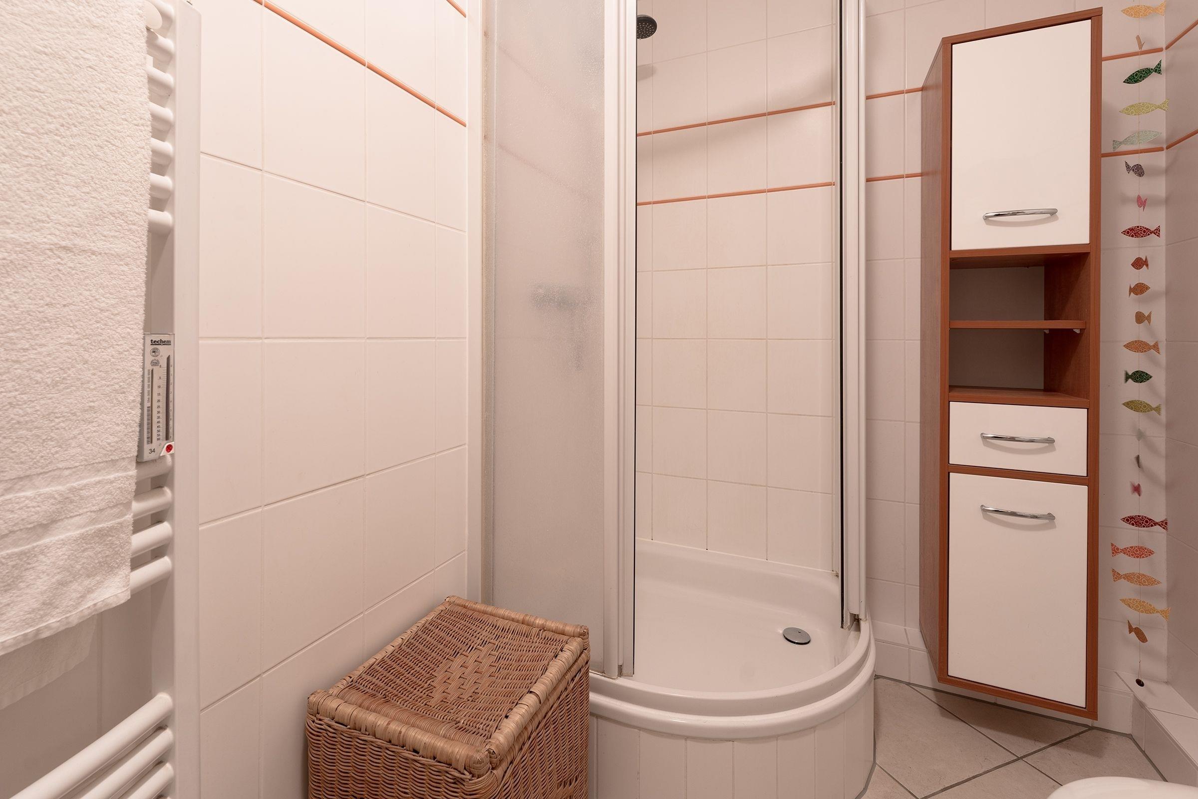 Geruhsame Nächte werden Sie im separaten Schlafzimmer mit Doppelbett (2x 90x200cm) verbringen und starten ausgeruht mit einer erfrischenden Dusche im hell gefliesten Badezimmer in Ihren neuen Urlaubstag.