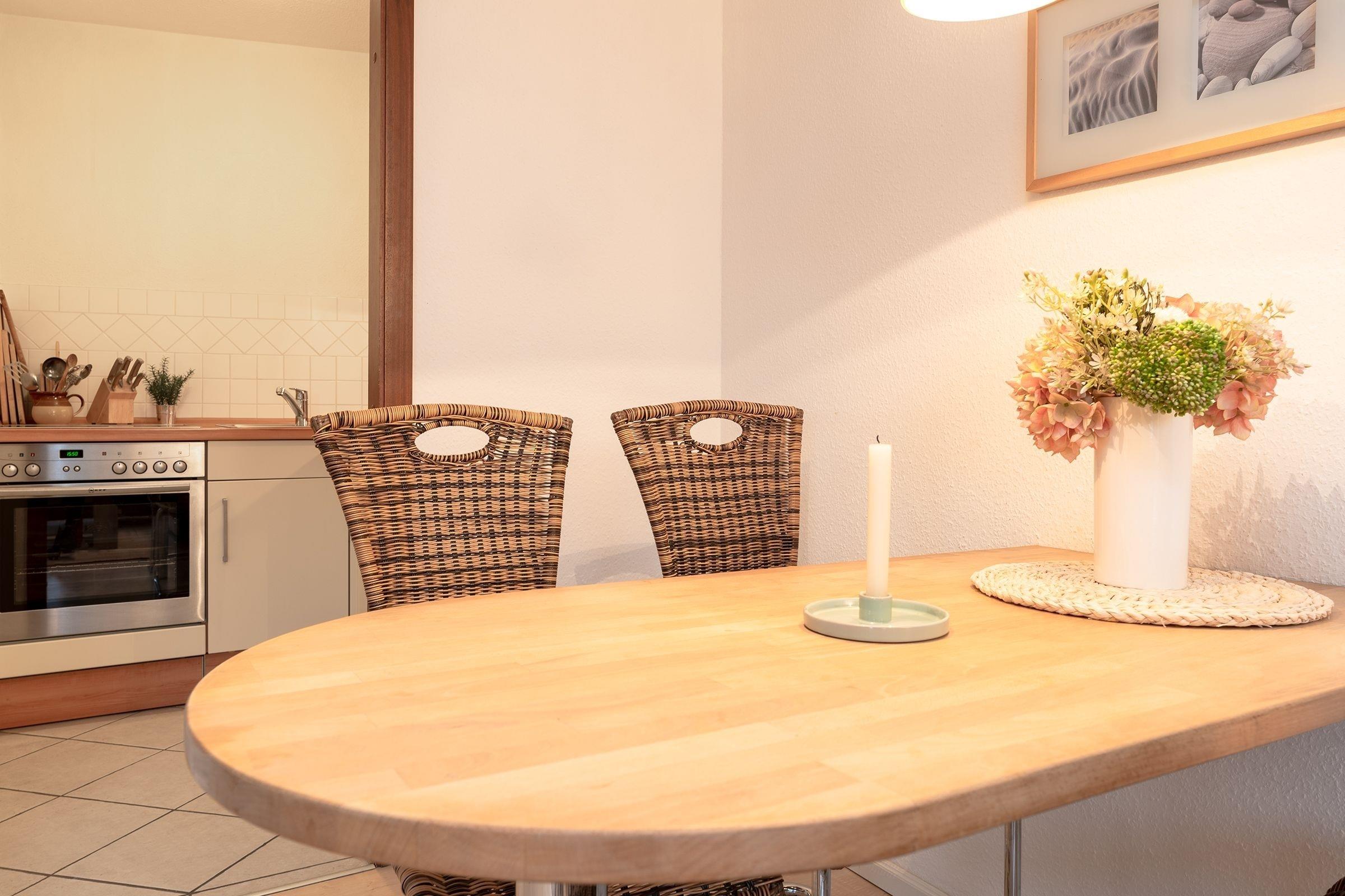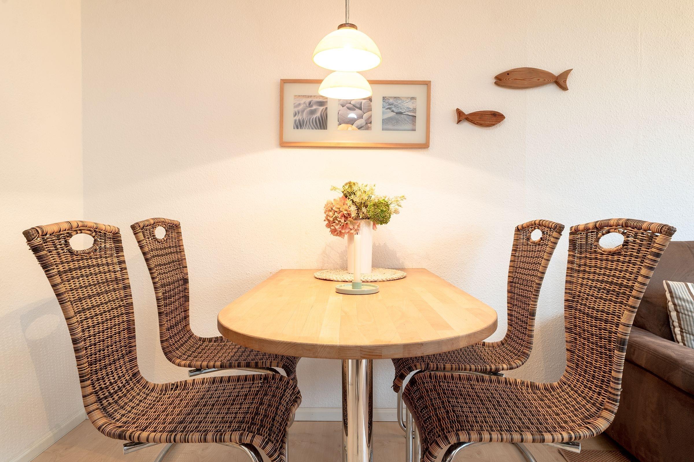 Es erwartet Sie ein gemütlicher Wohnbereich mit einer funktionellen Schlafcouch, die bei Bedarf in einen weiteren Schlafplatz (140x200 cm) verwandelt werden kann. Ein Esstisch mit 4 Stühlen bietet ausreichend Platz für Spiele-Abende oder um die Mahlzeiten gemeinsam nach der Zubereitung in der angrenzenden Küche einzunehmen. Nehmen Sie Platz auf dem möblierten, überdachten Balkon und genießen Sie die frische Ostseeluft sowie die Aussicht in Richtung Meer.