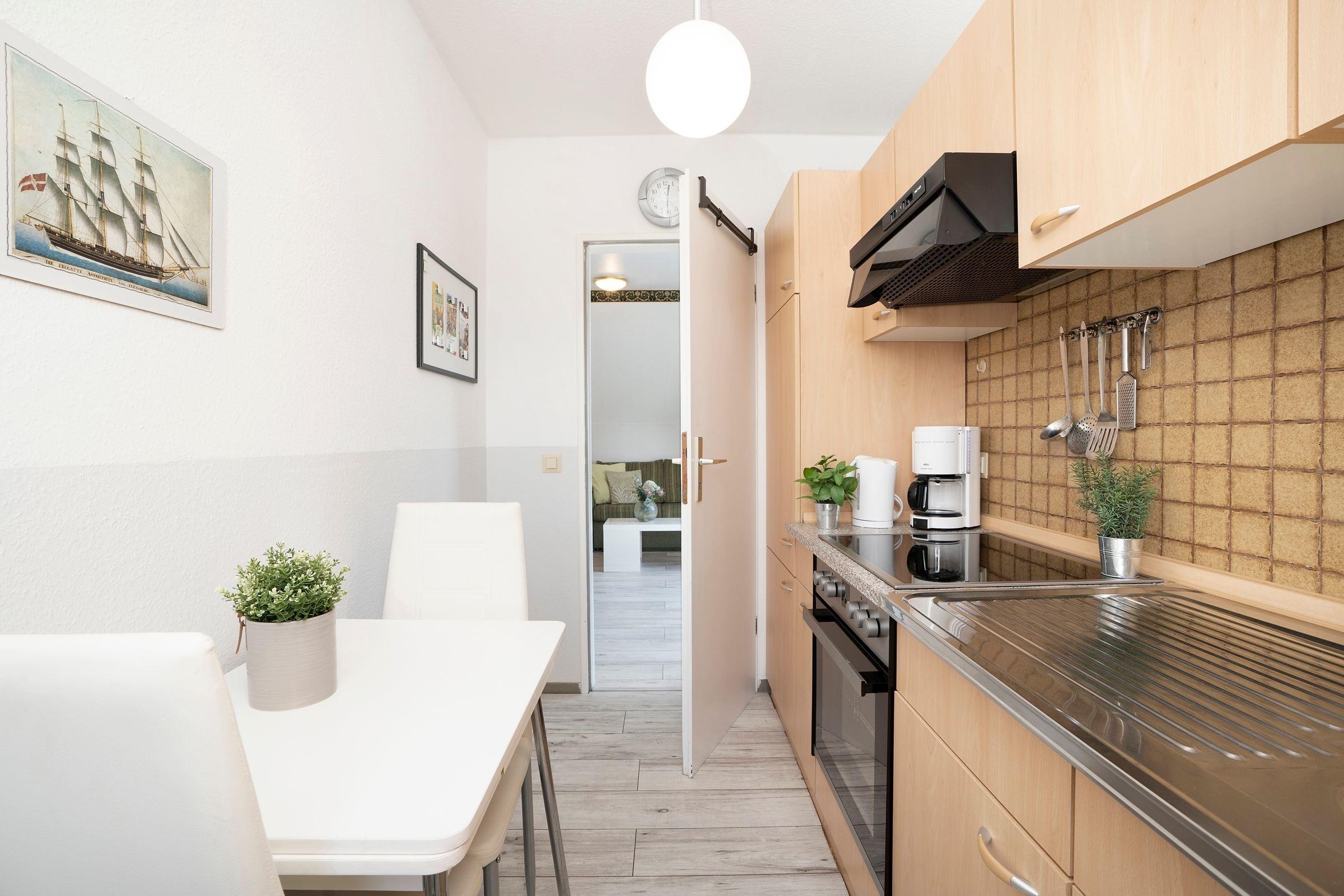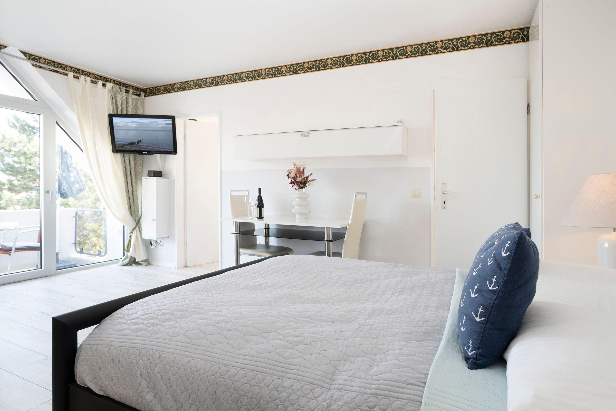 Durch ein geschicktes Einrichtungskonzept ist im lichtdurchfluteten, offenen Wohn- & Schlafbereich alles komfortabel untergebracht. Tagsüber entspannen Sie auf dem bequemen Sofa, das Sie zur Nacht in einen gemütlichen Schlafplatz (140x200 cm) verwandelt werden kann. Zusätzlich lädt ein großes Doppelbett (160x200 cm) zum Träumen und Erholen ein. Auf dem überdachten, möblierten Balkon genießen Sie die Sonnentage und die frische Ostseeluft, bei Bedarf spendet ein Sonnenschirm angenehmen Schatten. Ihre Mahlzeiten können Sie in der gut ausgestatteten Küche zubereiten und an einem der Essplätze in der Küche oder im Wohnzimmer einnehmen. Im hell gefliesten Tageslicht-Bad starten Sie mit einer erfrischenden Dusche in den neuen Urlaubstag. Für Unterhaltung sorgen ein Flachbild-TV sowie der vorhandene WLAN-Anschluss.