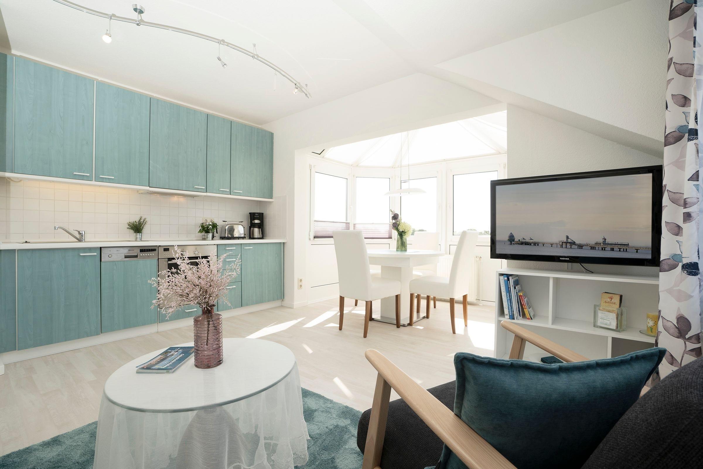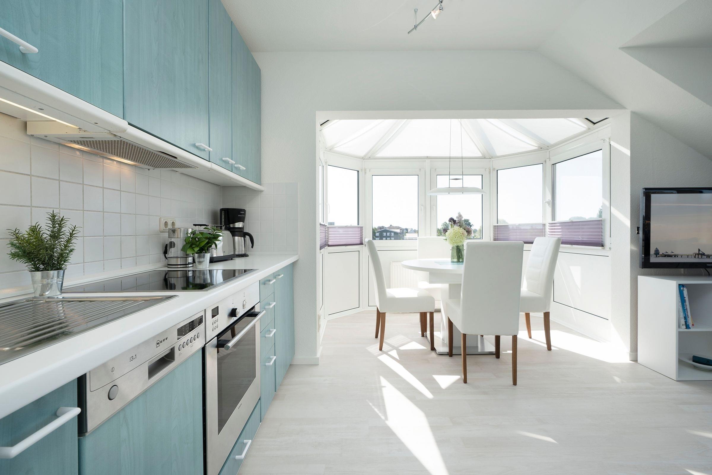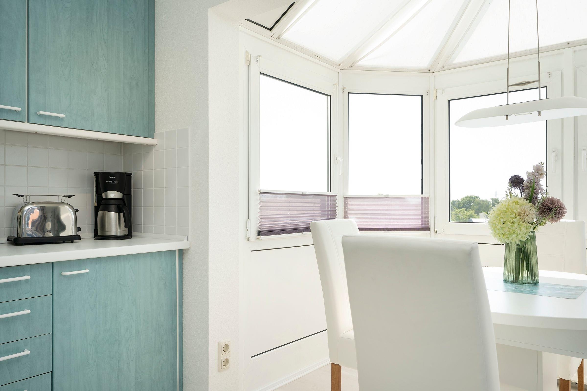 Das Zentrum des modernen Wohnbereichs bildet neben der gemütlichen Couchecke der helle Essplatz im geräumigen Erker mit schönem Rundumblick über die Dächer der näheren Umgebung. Die angrenzende, offen gestaltete Küche ist mit allen Annehmlichkeiten zum Kochen und Zubereiten Ihrer Mahlzeiten ausgestattet.