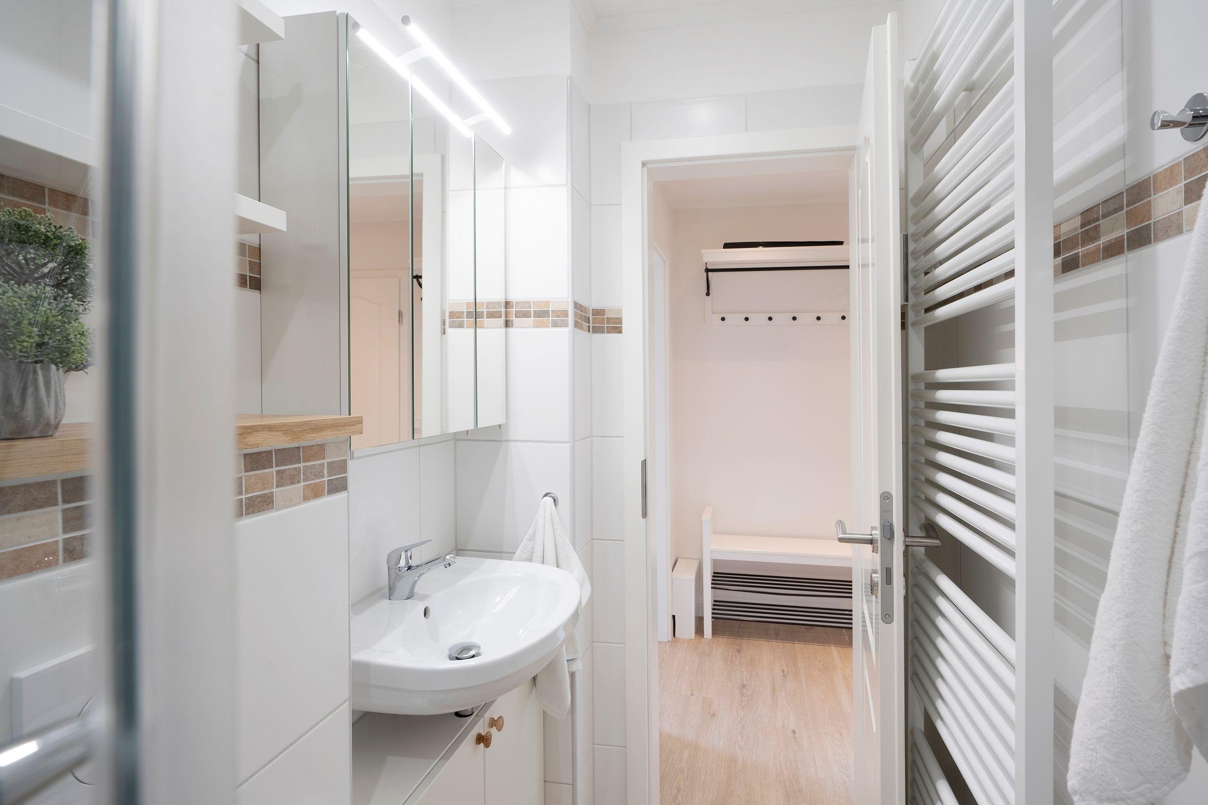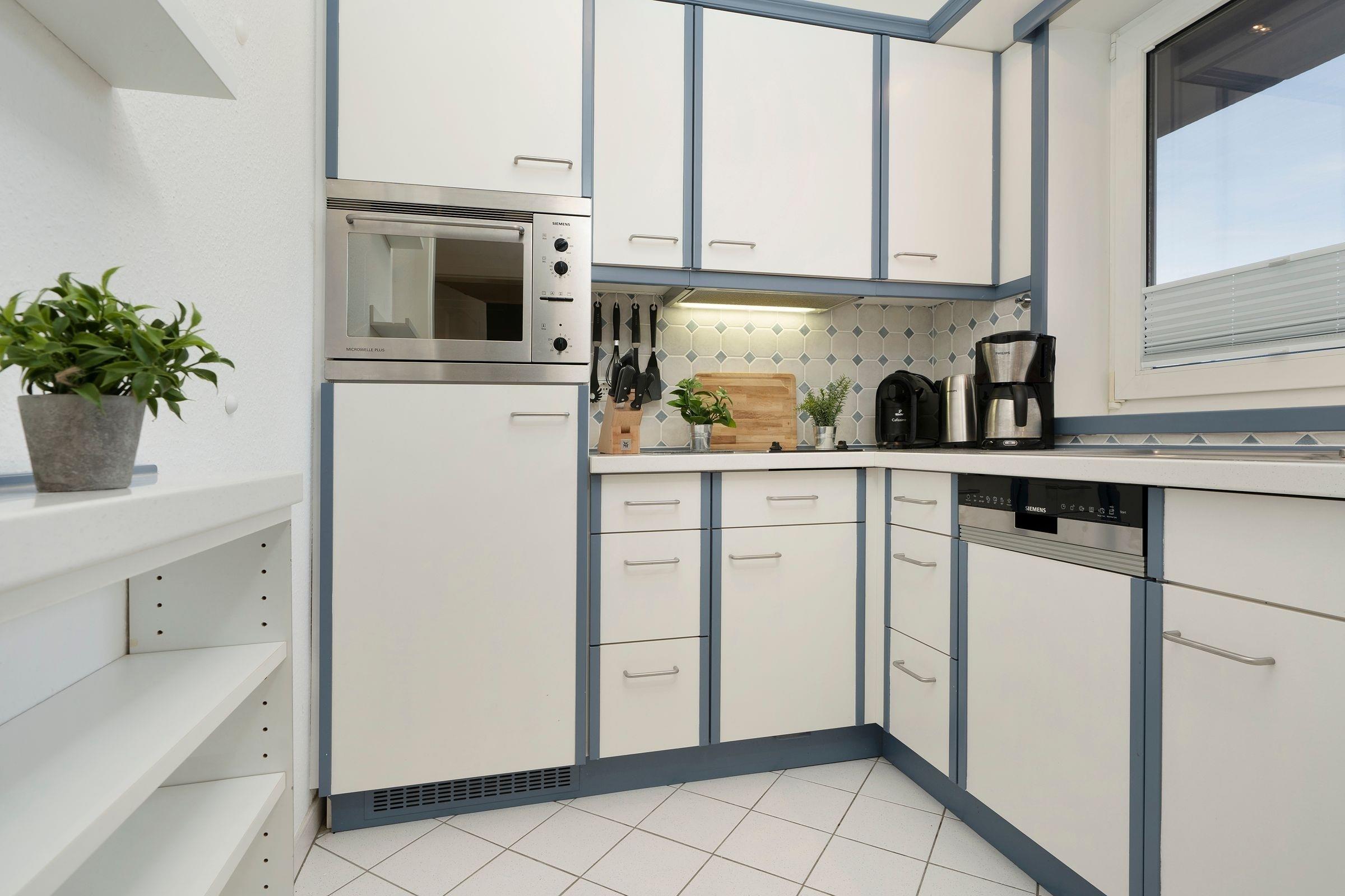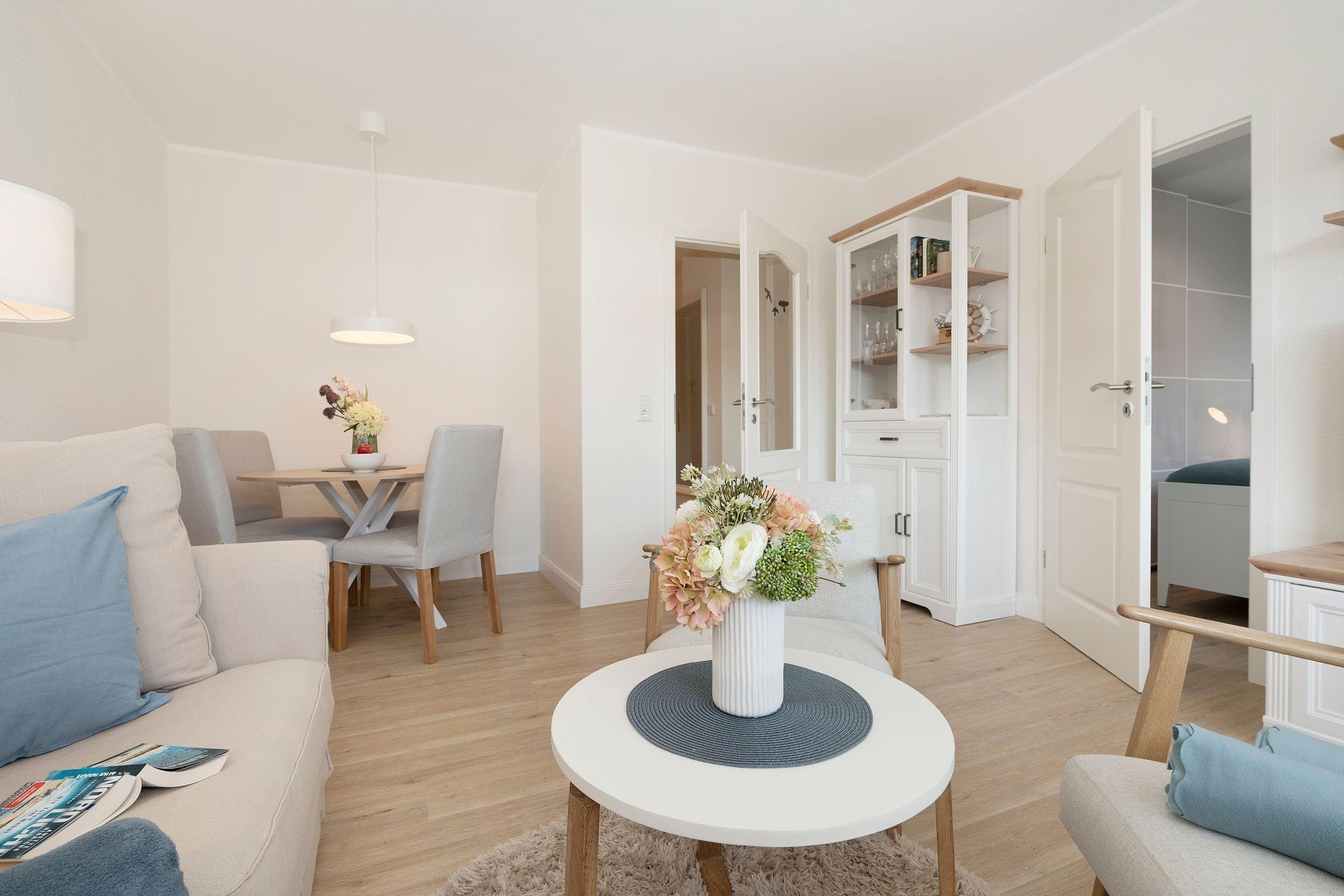 Treten Sie ein in das modern gestaltete Wohnzimmer mit integriertem Essbereich. Ob gesellige Spielerunde oder gemütlicher Filmabend - hier haben Sie Platz, um Ihre Urlaubstage mit Ihren Liebsten ausklingen zu lassen. Von hier aus gelangen Sie auch auf den Balkon mit Ost-Ausrichtung, auf dem Sie ihren ersten Kaffee am Morgen genießen können. Über den Flur erreichen Sie die separate Küche, die mit einer Tchibo Cafissimo-Kapselmaschine und zahlreichen Elektrogeräten keine Wünsche offen lässt.