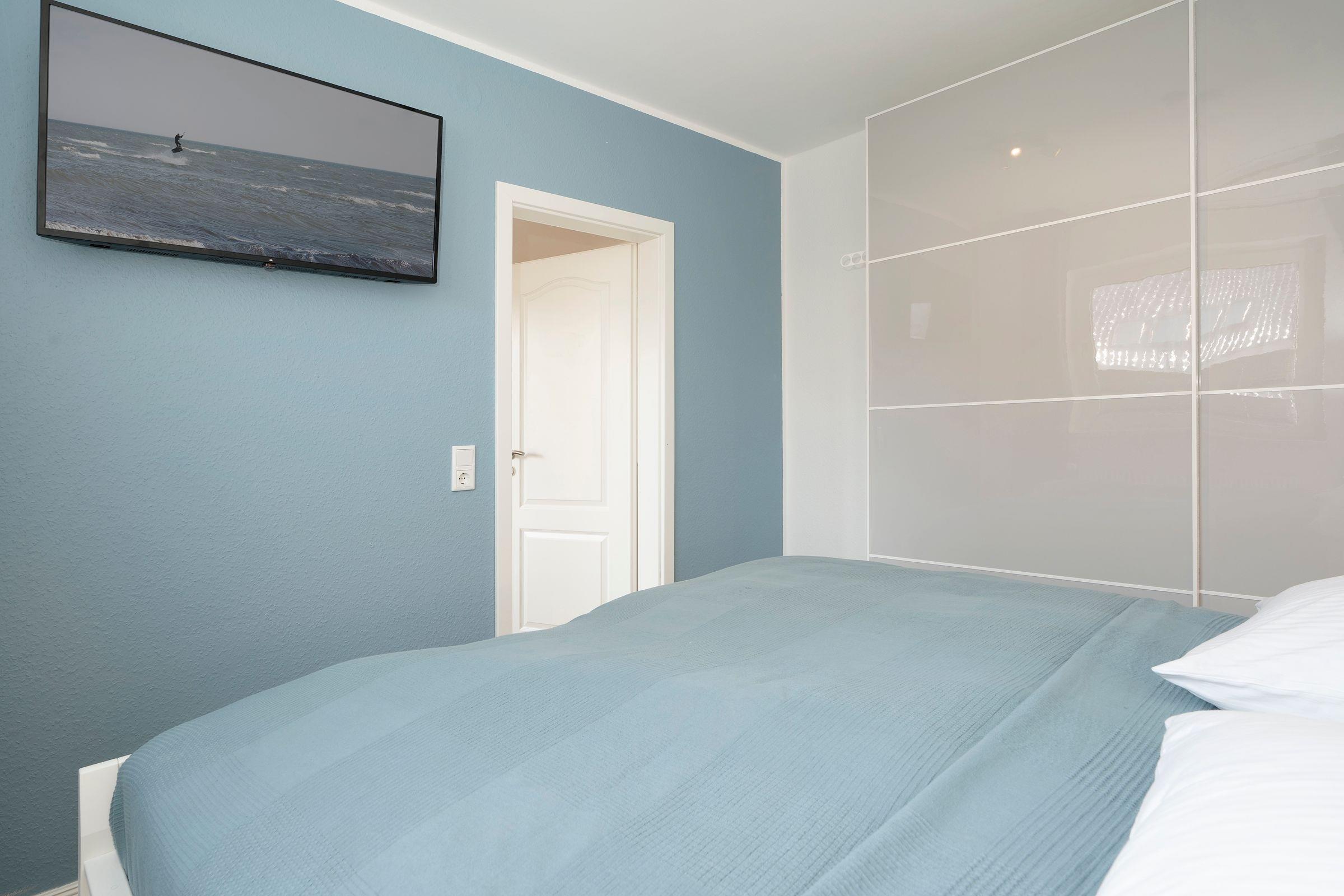 2. Schlafzimmer: 1 Doppelbett (2x 90x200 cm), Kleiderschrank, TV, Verdunkelung: Plissee & Vorhänge, kein Platz für Babybett vorhanden