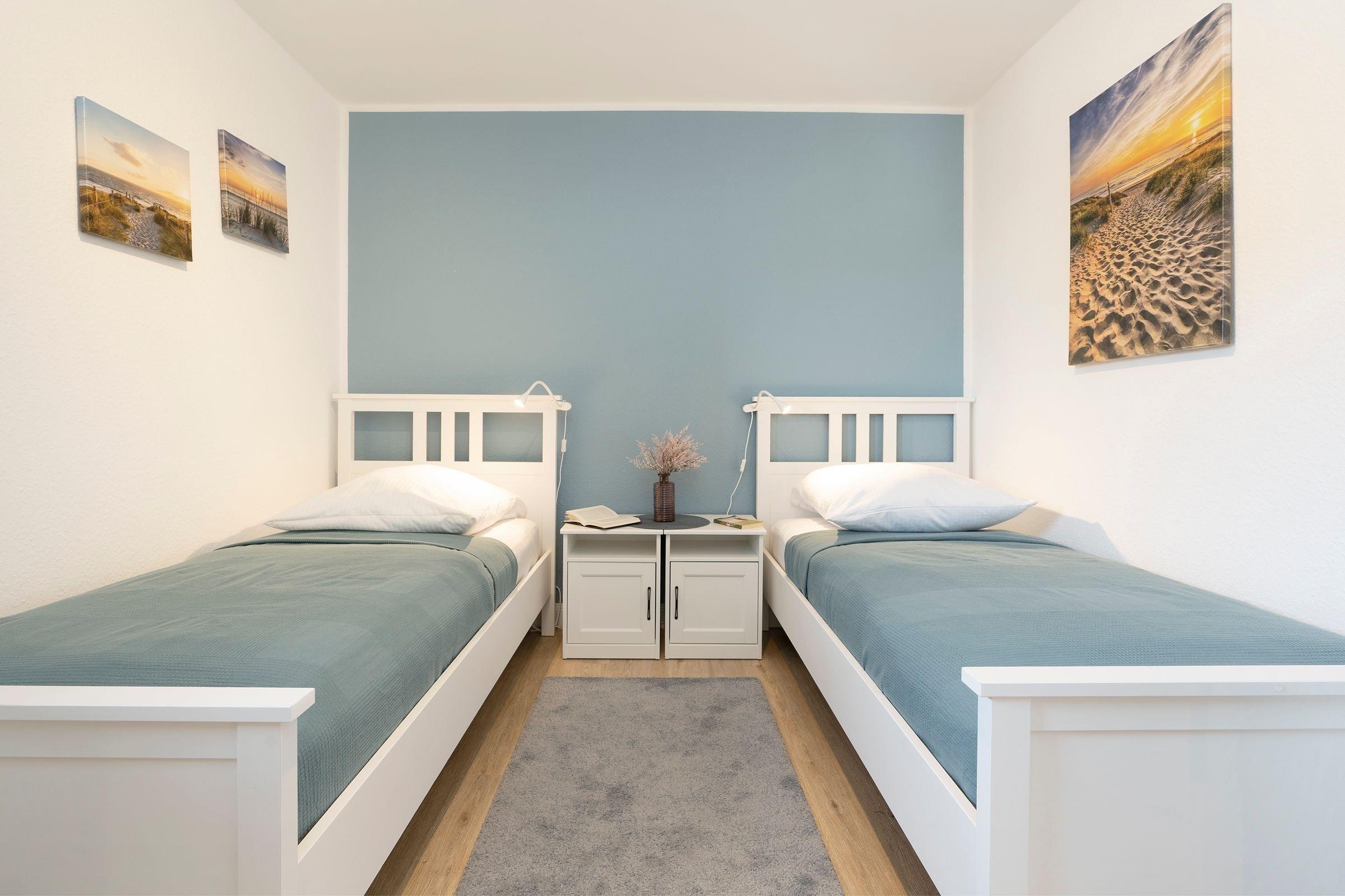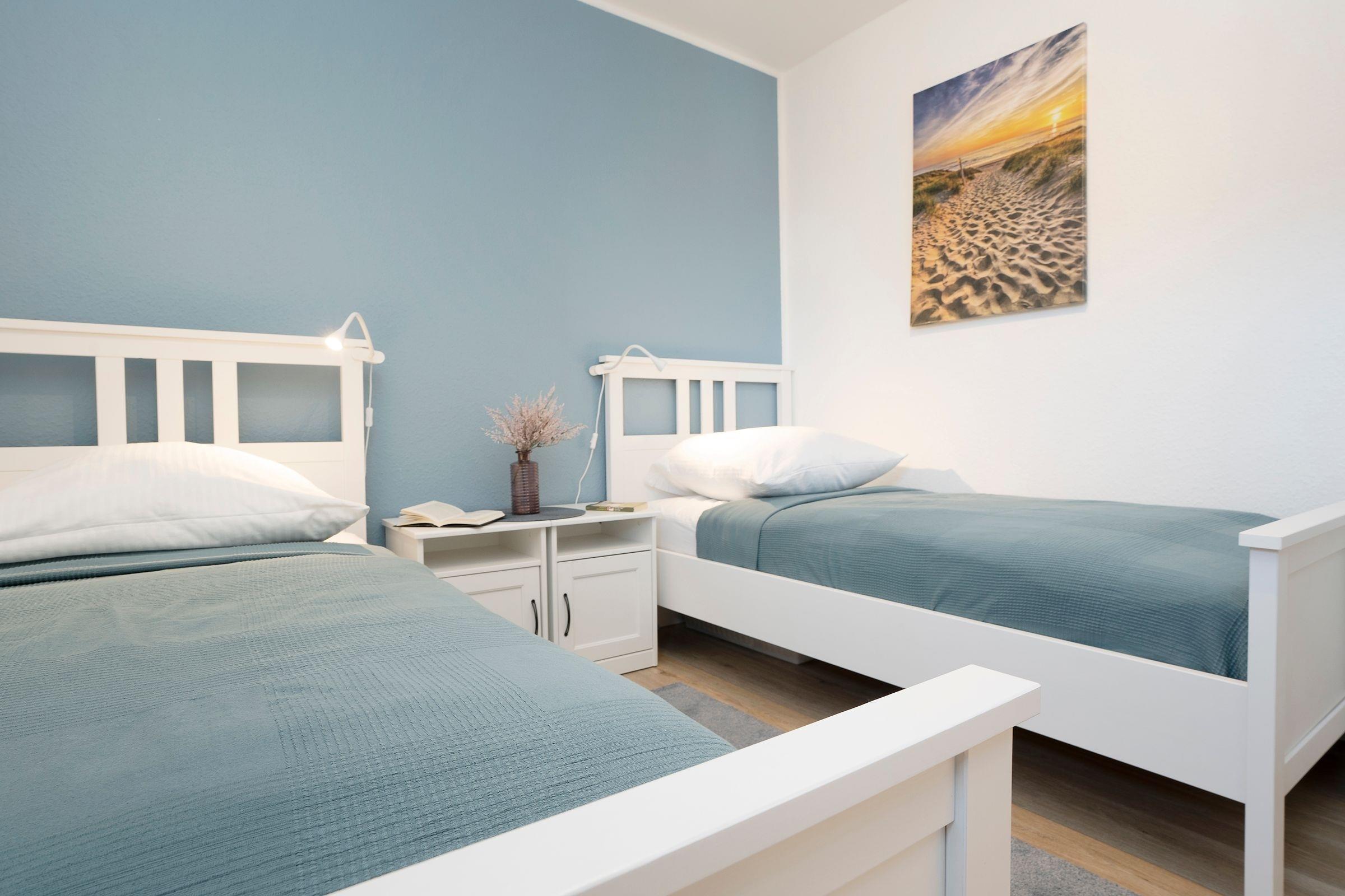 Erholsamen Schlaf garantieren Ihnen die separaten Schlafzimmer, die mit einem Doppelbett (2x 90x200 cm) und zwei Einzelbetten (je 90x200 cm) jeweils zwei großzügige Schlafmöglichkeiten bieten. Das moderne Badezimmer mit luxuriöser Regendusche rundet die Ausstattung der Wohnung ab.