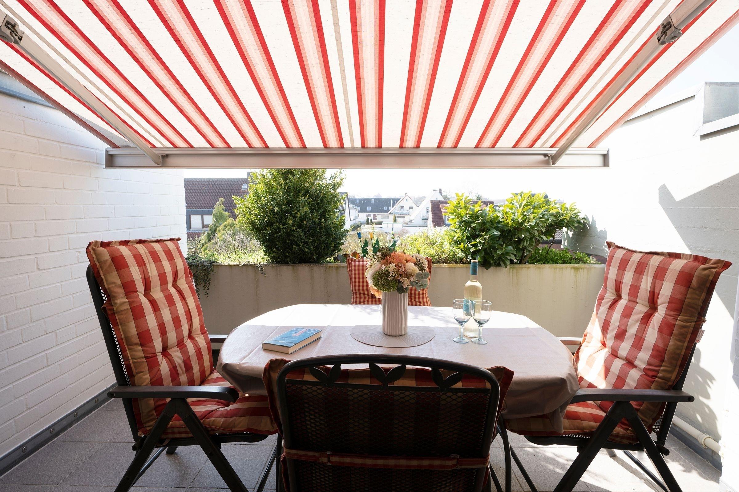 Der stilvoll eingerichtete, lichtdurchflutete Wohnbereich bildet das Herzstück der Wohnung und umfasst neben der voll ausgestatteten Küche auch einen gemütlichen Essplatz, der nicht nur zum gemeinsamen Einnehmen der Mahlzeiten einlädt, sondern sich auch hervorragend für gesellige Spiele-Abende mit Familie oder Freunden eignet. Das gemütliche Sofa bietet viel Platz zum Erholen und Entspannen vor dem Fernseher und auf dem großzügigen, möblierten Balkon können Sie viel Zeit an der frischen Luft verbringen.