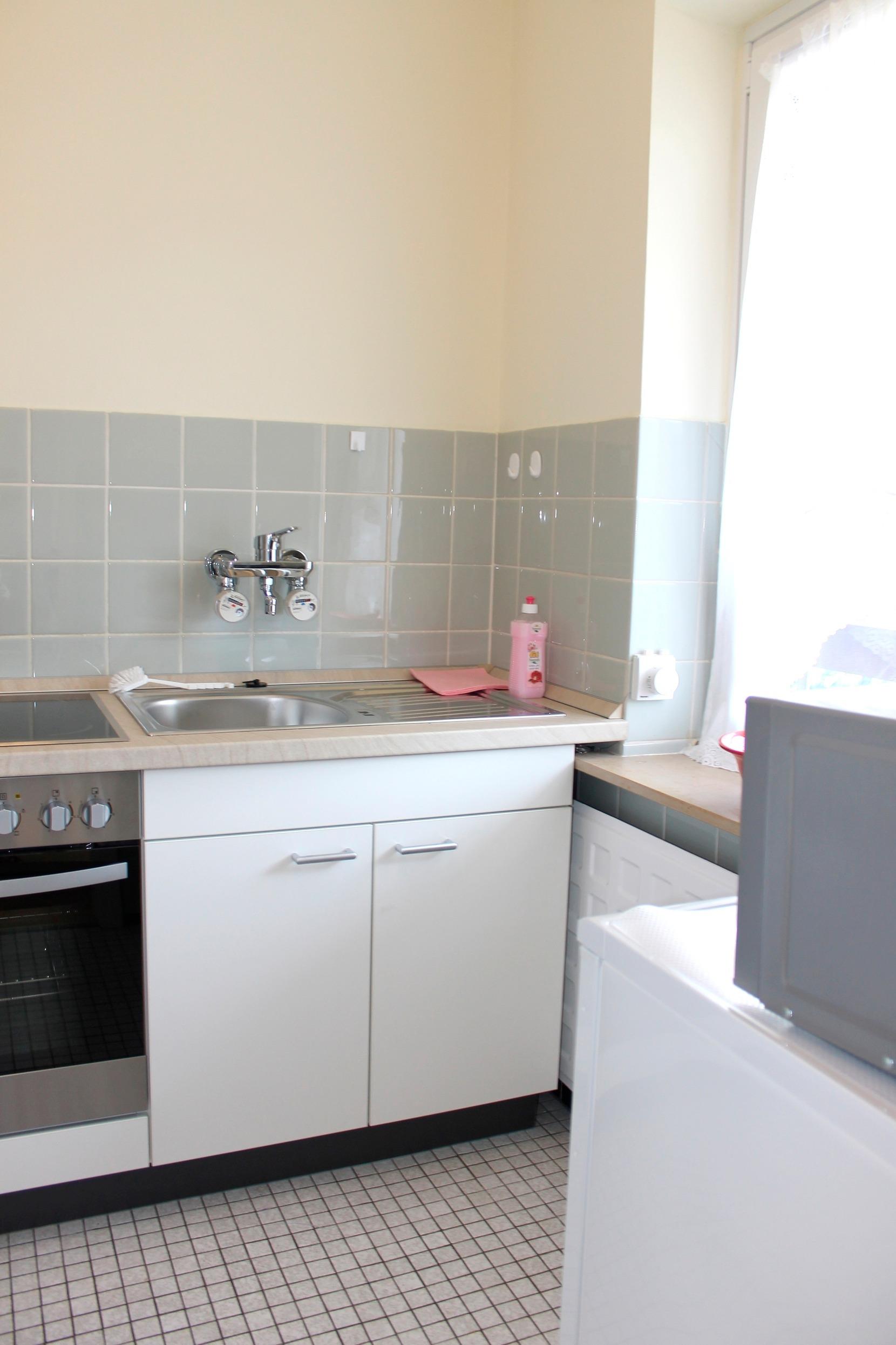 Die Küche bietet einen Backofen, einen 4-Plattenherd, eine Mikrowelle, eine Kaffeemaschine und andere Küchengeräte. Das Badezimmer verfügt über eine Dusche, ein WC, eine Waschmaschine und ein Fenster.