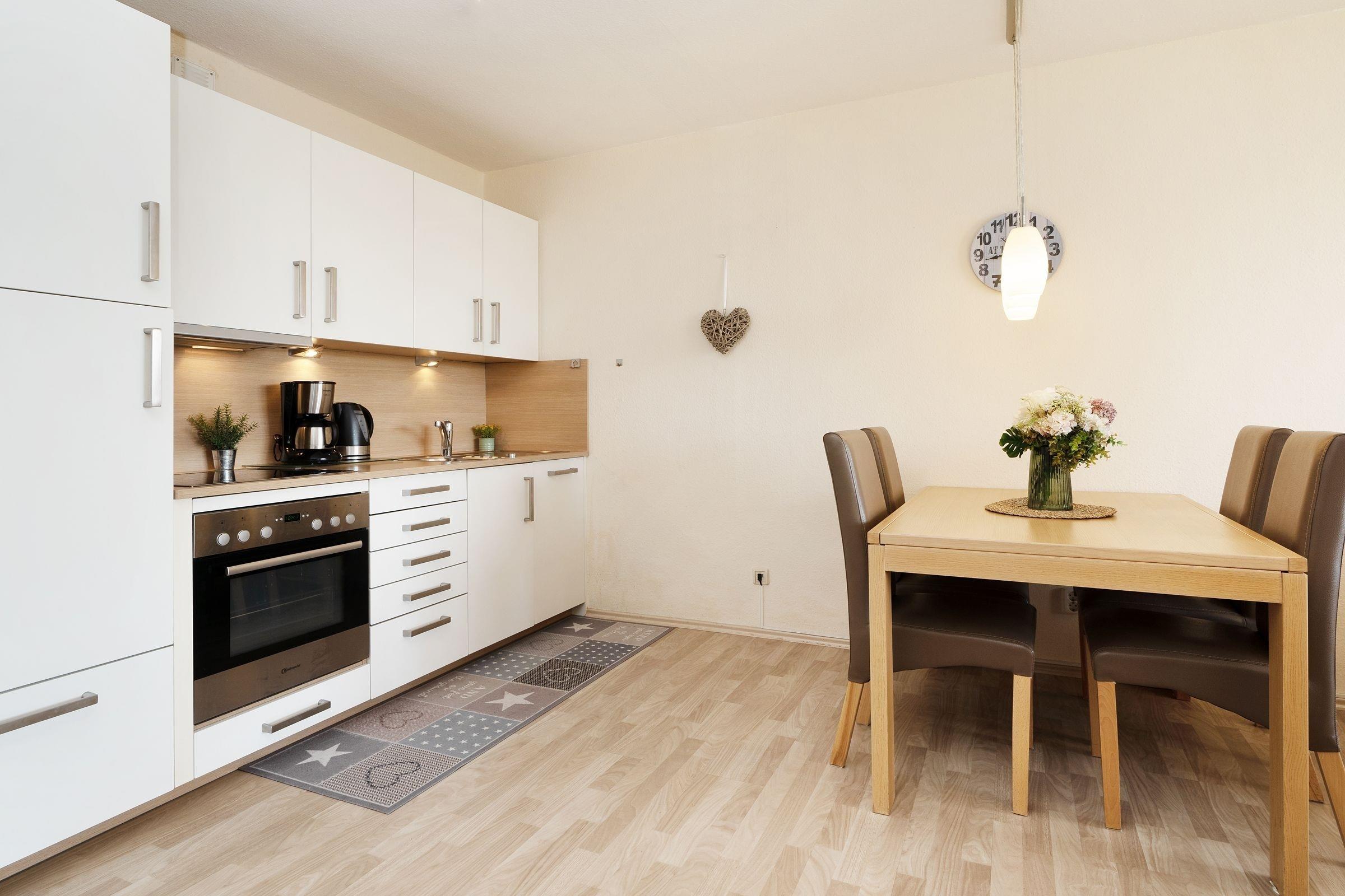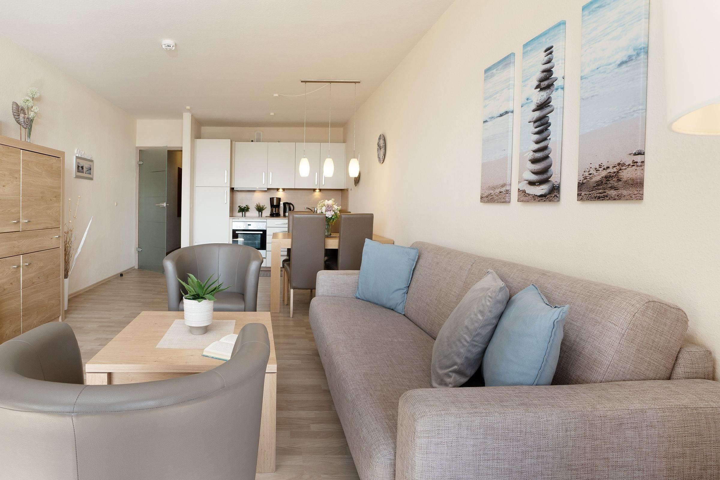 Mit dem Fahrstuhl gelangen Sie direkt in das 2. Obergeschoss, über das Sie Ihre Urlaubsunterkunft erreichen. Auf kurzem Wege durch den Flur gelangen Sie in den hellen Wohn- und Essbereich. Im Wohnbereich erwartet Sie eine gemütliche Couch, die bei Bedarf zum Schlafplatz für zwei weitere Urlaubsgäste umgebaut werden kann. Hier können Sie entspannte Abende vor dem TV verbringen oder Sie lassen den Blick vom Wohnzimmer aus auf die Ostsee schweifen. Für Musik in den Ohren sorgt das inkludierte Bluetooth-Radio. Auch den wohnungseigenen WLAN-Zugang können Sie nutzen. Die Zubereitung von Frühstück, Abendessen und Urlaubssnacks erfolgt nur einen Steinwurf entfernt in der in den Wohnbereich integrierten, voll ausgestatteten Küchenzeile. Highlight dieser tollen Ferienwohnung ist der überdachte, nach Süden ausgerichtete Balkon, auf dem Sie bei jeder Wetterlage das Treiben der Ostsee beobachten können. Nach einem entspannten Abend auf dem Balkon kommen Sie im komfortablen Doppelbett (2x 90x200 cm) des vom Flur abgehenden Schlafzimmers zur Ruhe. Das modern ausgestattete Duschbad rundet diese Ferienwohnung ab.