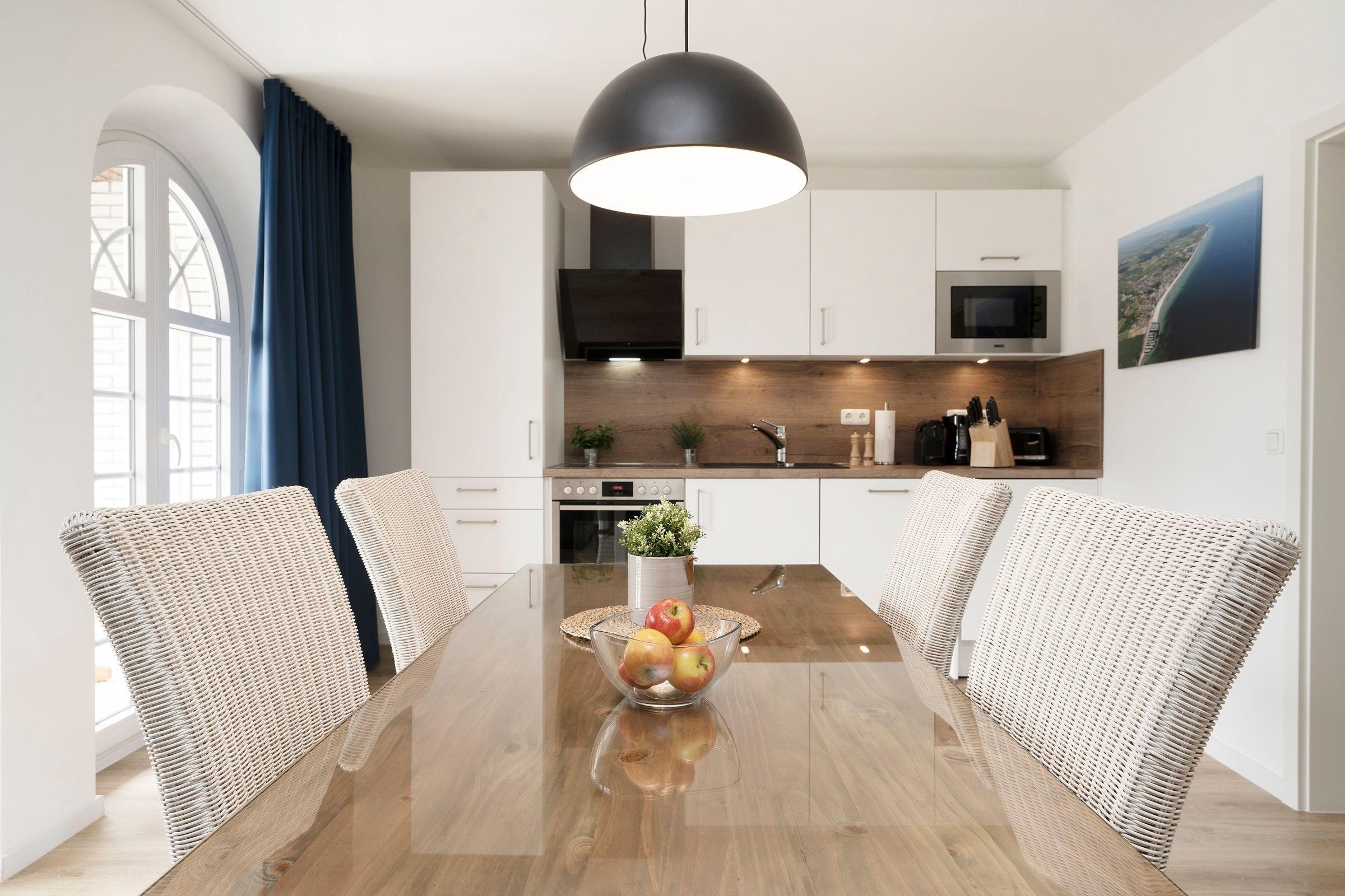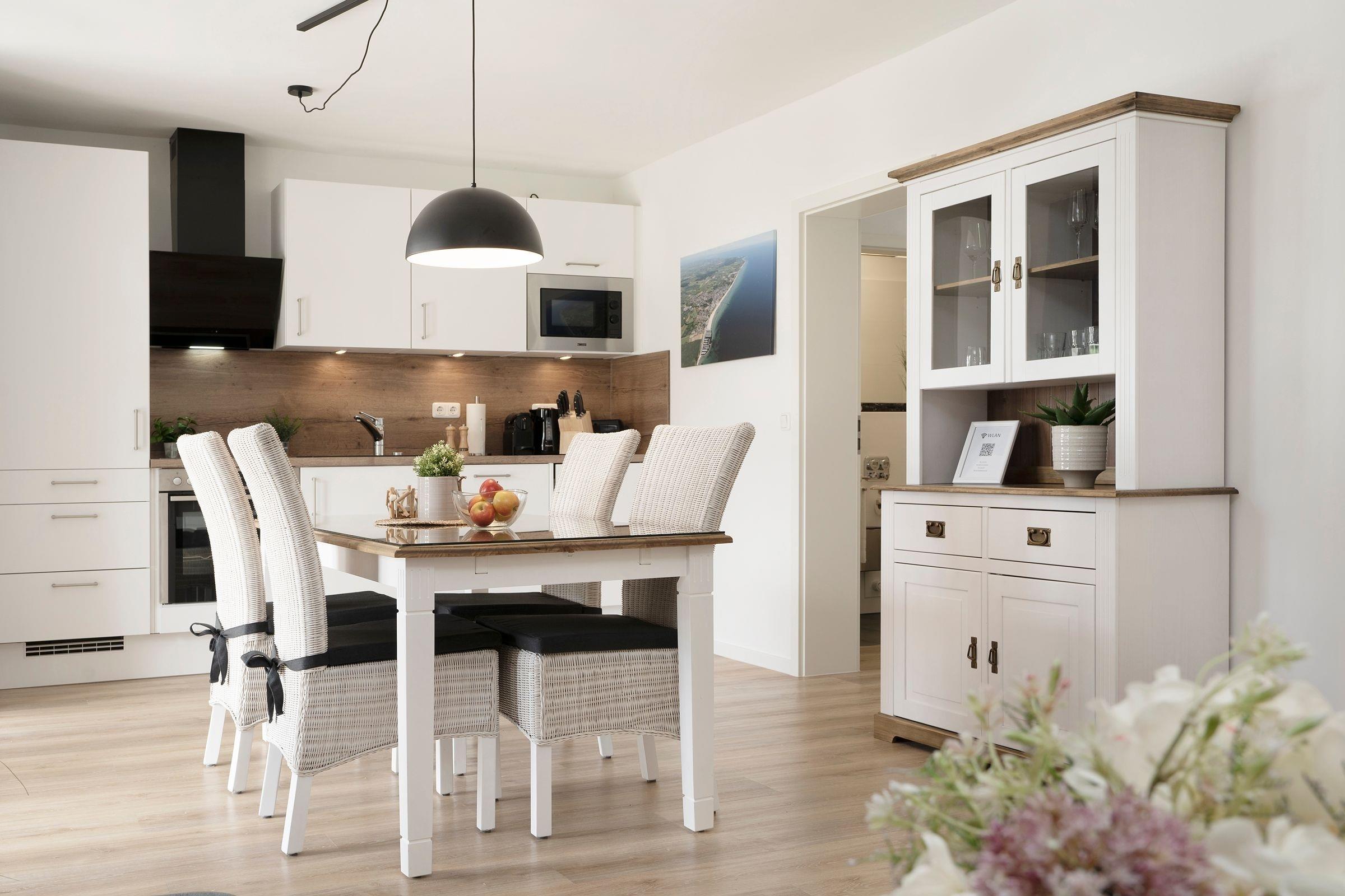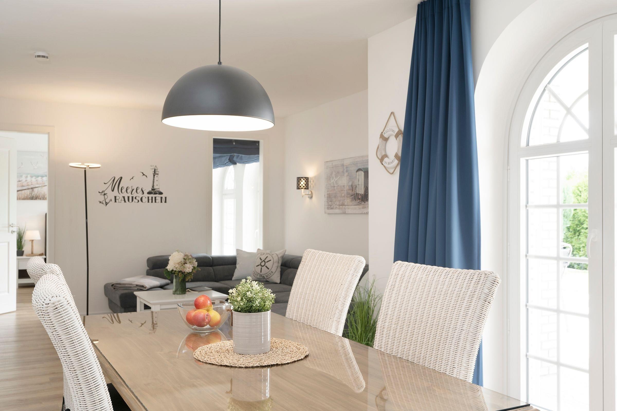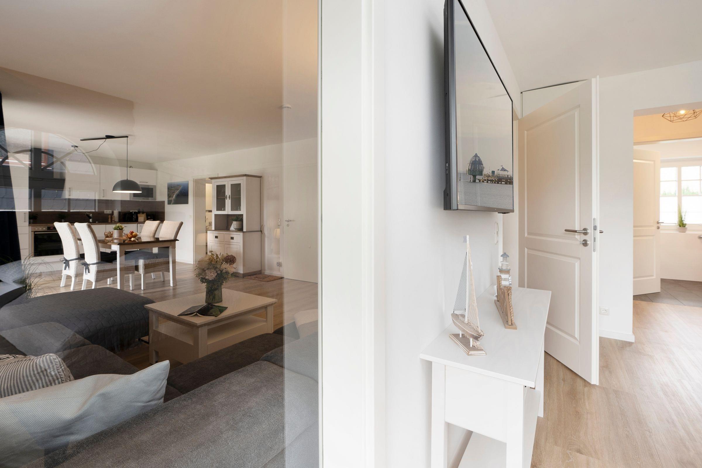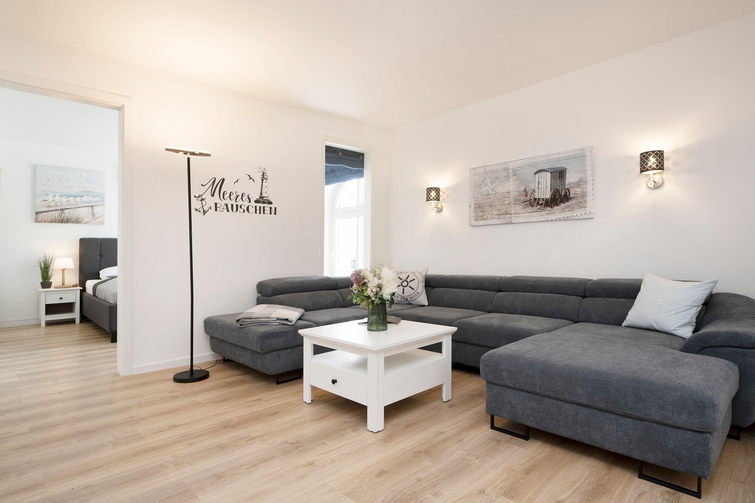 Die Ferienwohnung Meeresrauschen im Haus Schönes Leben empfängt Sie mit einem modern eingerichteten hellen Wohnbereich. In den Wohnbereich integriert ist die offene Küchenzeile, die mit ihrer sehr guten Ausstattung, inklusive Nespresso-Kaffeemaschine, keine Wünsche offen lässt. Lassen Sie sich nach einem guten Abendessen auf die gemütliche Couch fallen, lauschen Sie der wohnungseigenen WLAN-Sonos-Musikbox oder genießen Sie einen Blockbuster auf dem mit dem Streaming-Dienst Netflix ausgestatteten TV. Ihr Feriendomizil kann mit zwei voll abdunkelbaren Schlafzimmern trumpfen, die jeweils über ein eigenes Bad en suite verfügen. Ein bequemes Boxspringbett (2x 180x200cm) im ersten Schlafzimmer sowie zwei Einzelbetten (90x200cm) im zweiten Schlafzimmer sorgen für einen geruhsamen Schlaf. Die Lieblingsserie kann dabei auch vom Bett aus genossen werden, denn beide Schlafzimmer bestechen mit einem eigenen TV. Eines der beiden Dusch-Bäder bietet mit einem unterfahrbaren Waschbecken, einem WC-Haltegriff sowie einem Duschhocker barrierearme Bedingungen. Kalte Füße vermeiden Sie mit der Fußbodenheizung, die in der gesamten Wohnung verlegt ist. Die Highlight Ihres Feriendomizils sind die 58 m² große, nach Südwesten ausgerichtete Terrasse, auf der Sie die letzten Sonnenstrahlen des Tages genießen können sowie die gemeinschaftlich nutzbare Gartensauna.