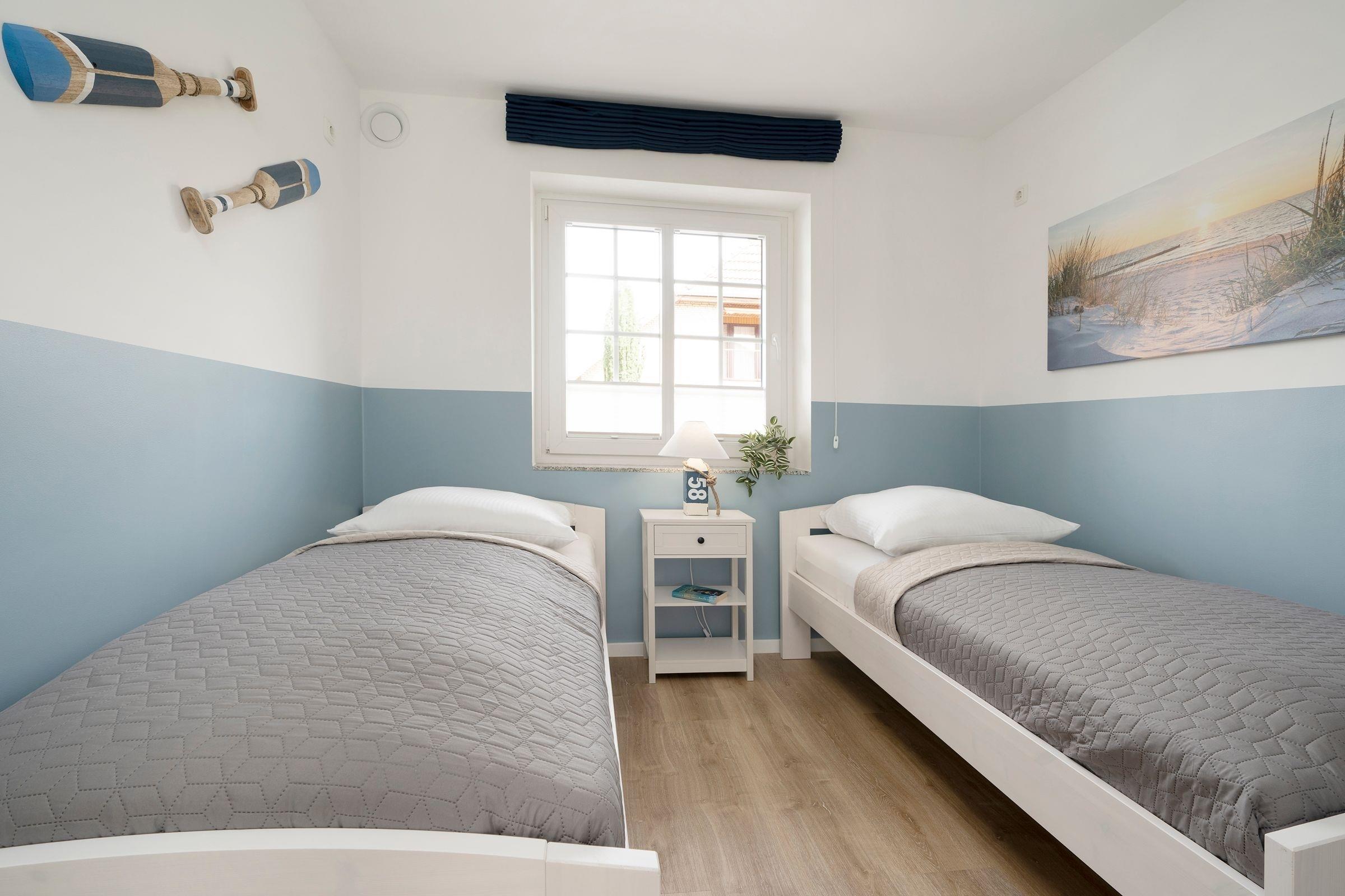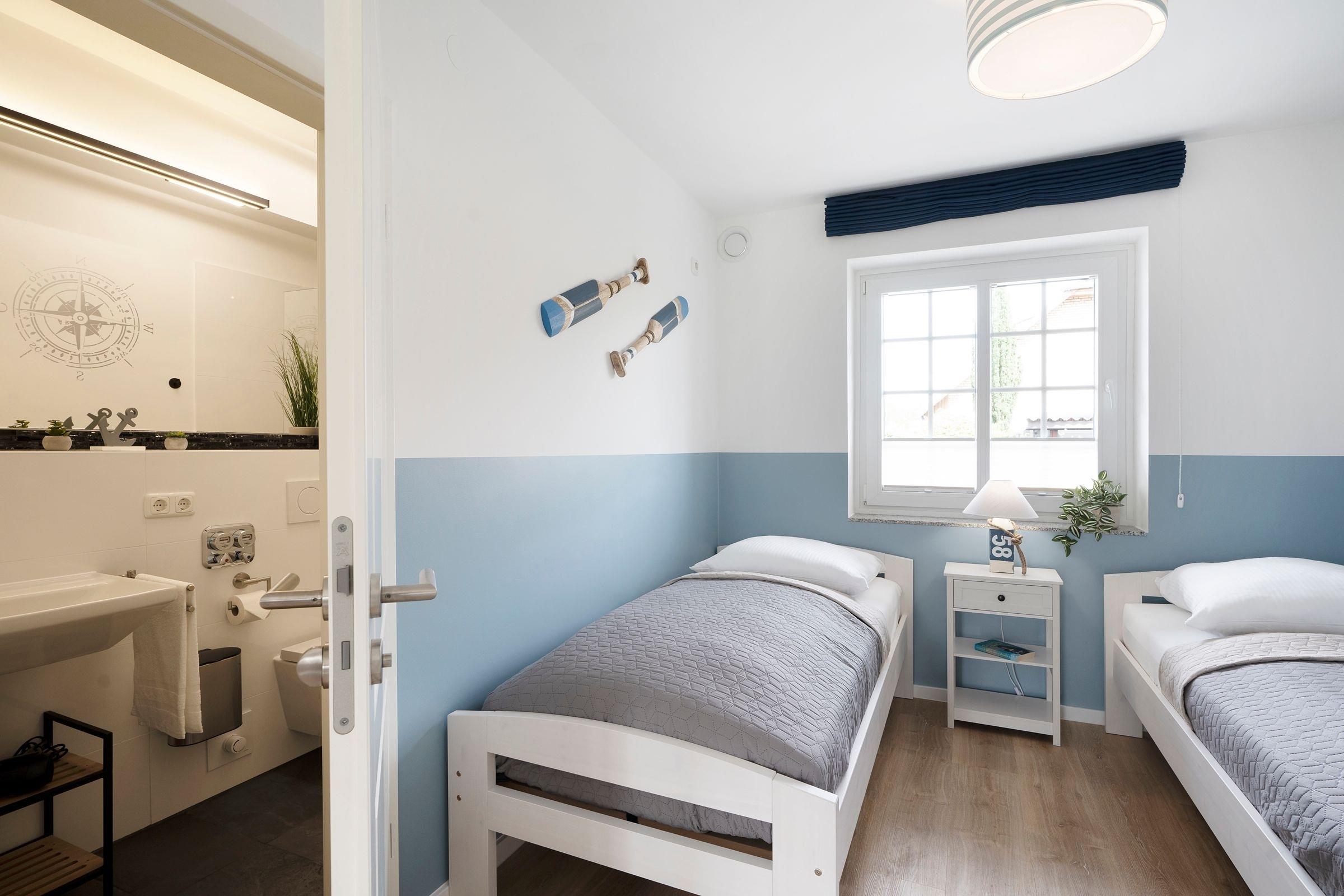 Schlafzimmer 2: 2 Einzelbetten (2x90x200 cm), Verdunkelung (Raffrollos), TV, Bad en suite