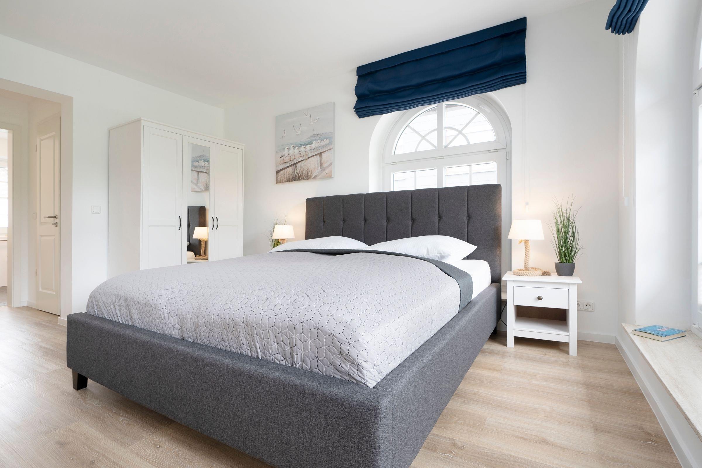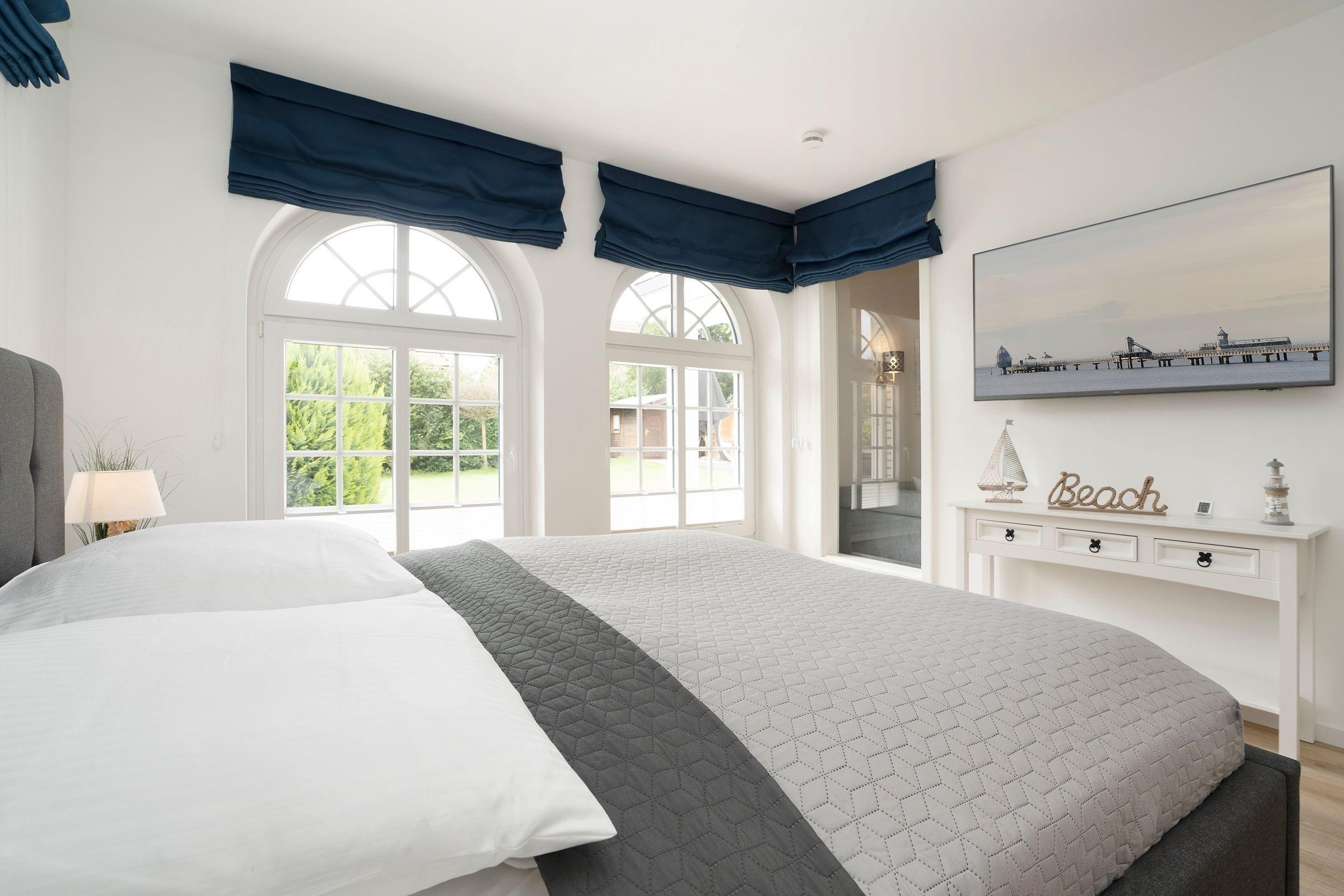 Schlafzimmer 1: 1 Boxspringbett (2x 90x200 cm), Verdunkelung (Raffrollos), TV, Bad en suite, Platz für Babybett