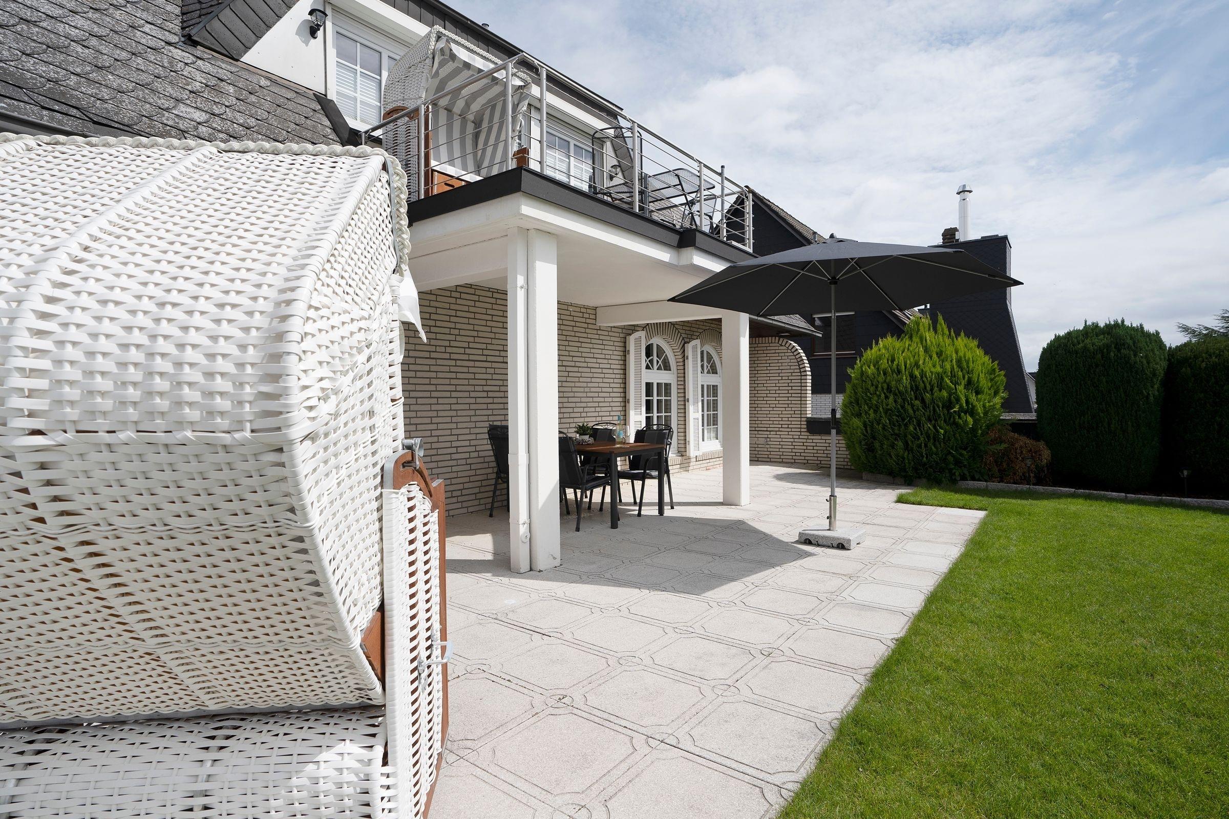 Lassen Sie den Tag auf der Terrasse mit eigenem Strandkorb entspannt ausklingen.