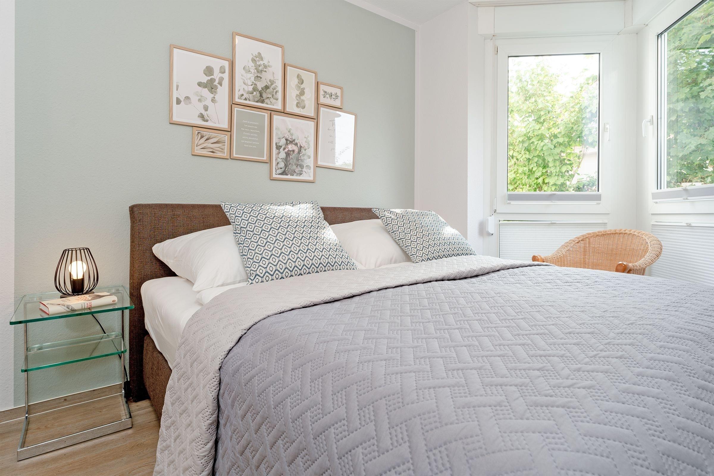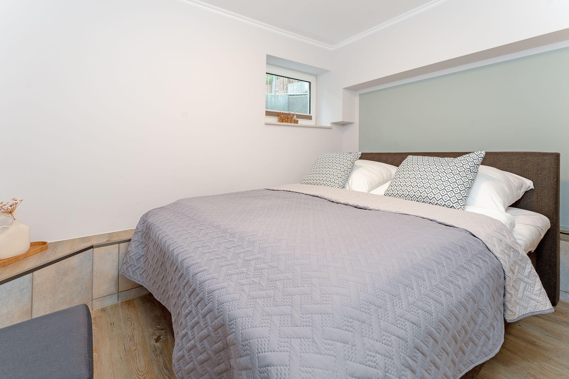 Schlafzimmer 3 (Souterr.): 1 Boxspringbett (160x200 cm), Verdunklungsplissees