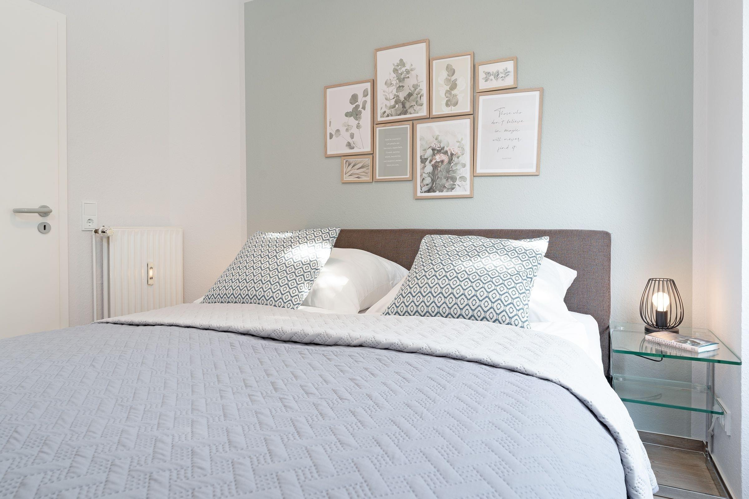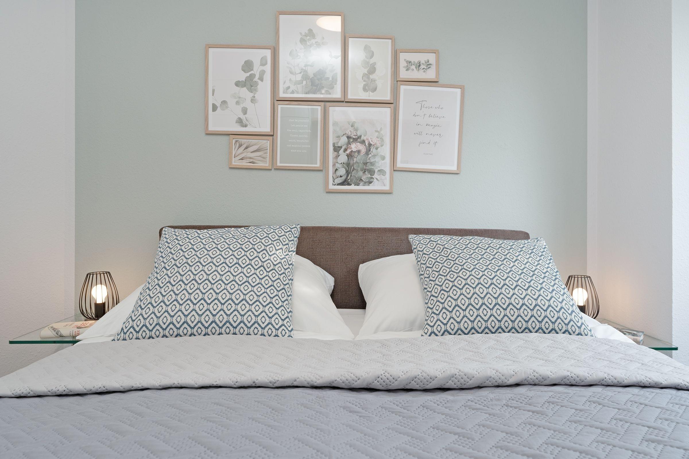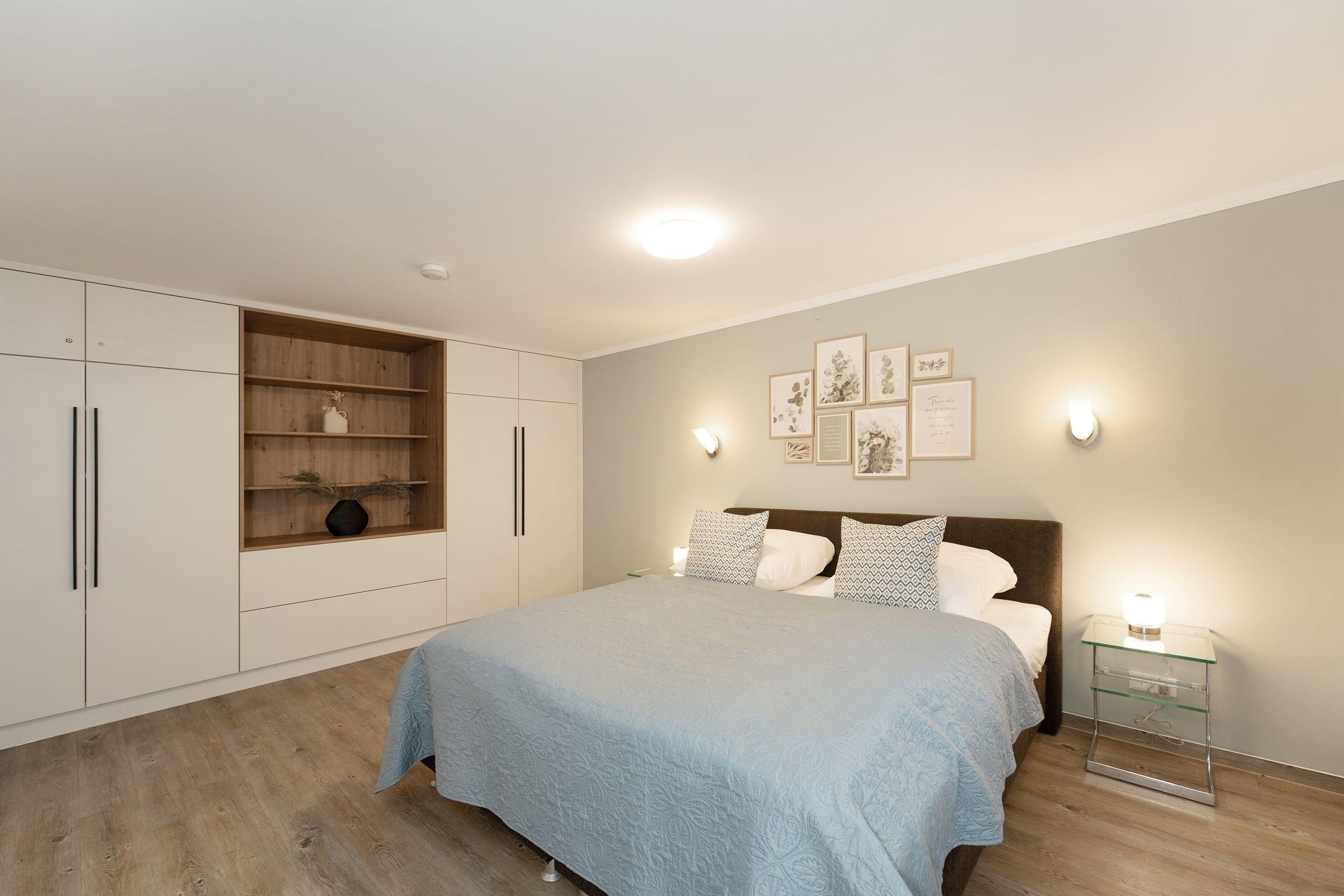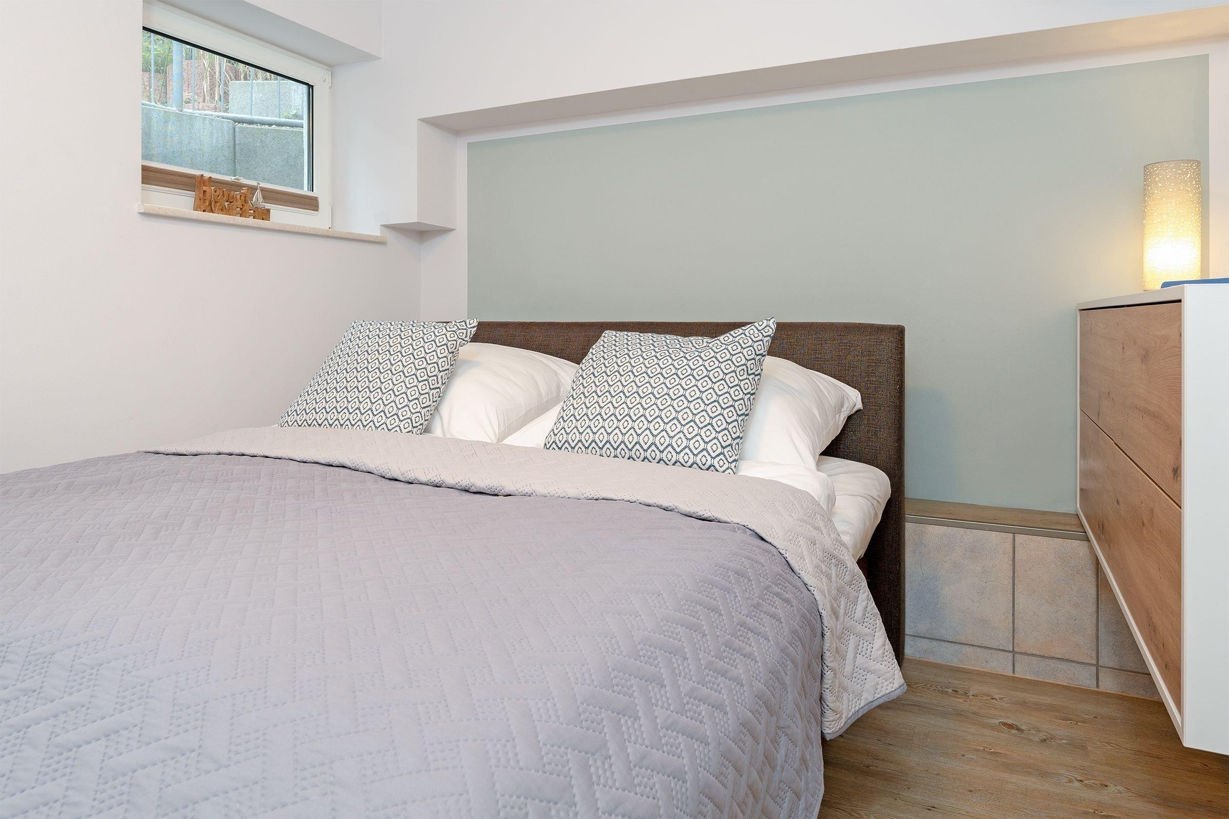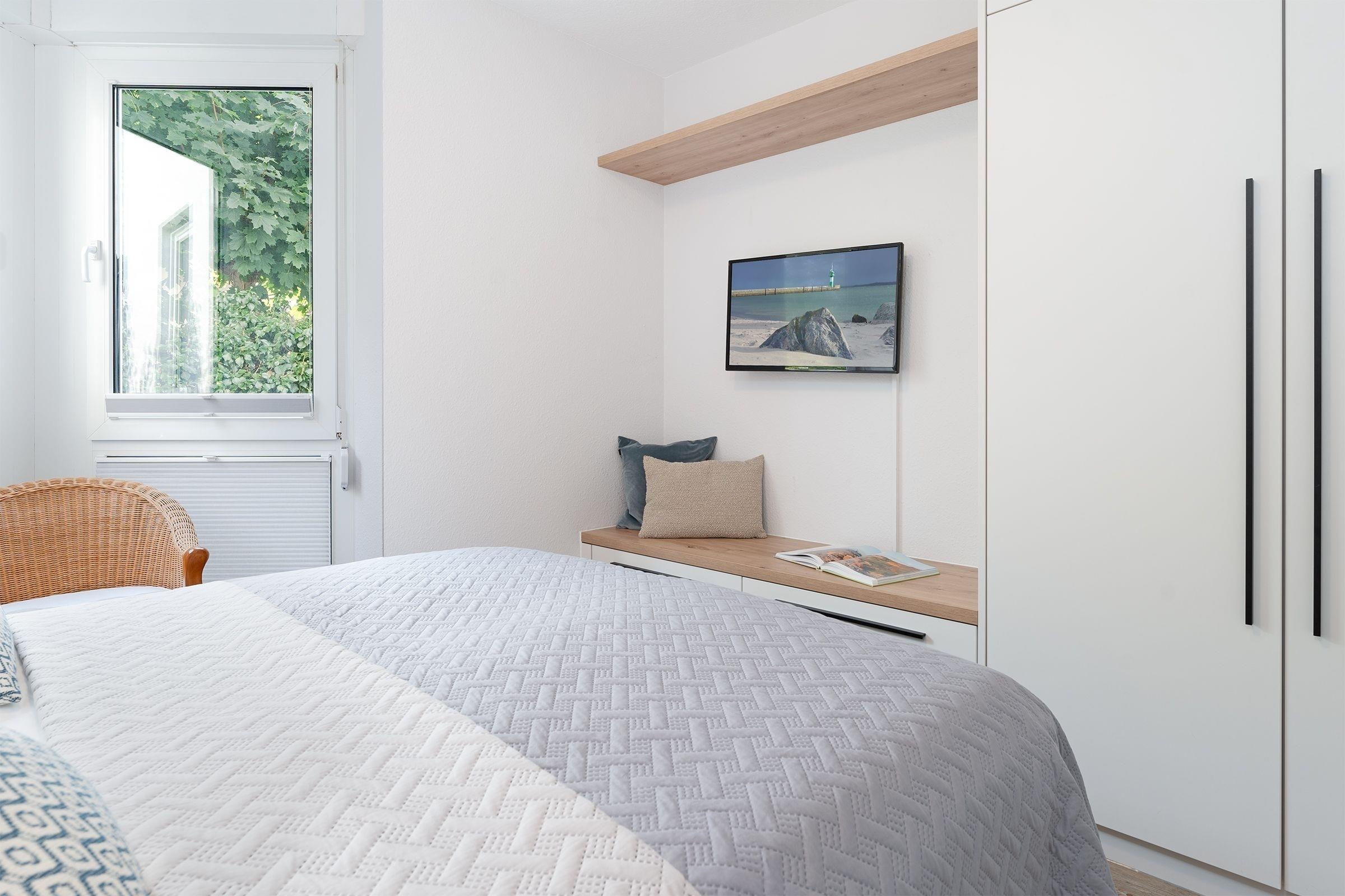 Schlafzimmer 2 (Souterr.): 1 Boxspringbett (180x200 cm), Kleiderschrank, Verdunklungsplissees, TV, Platz für Babybett