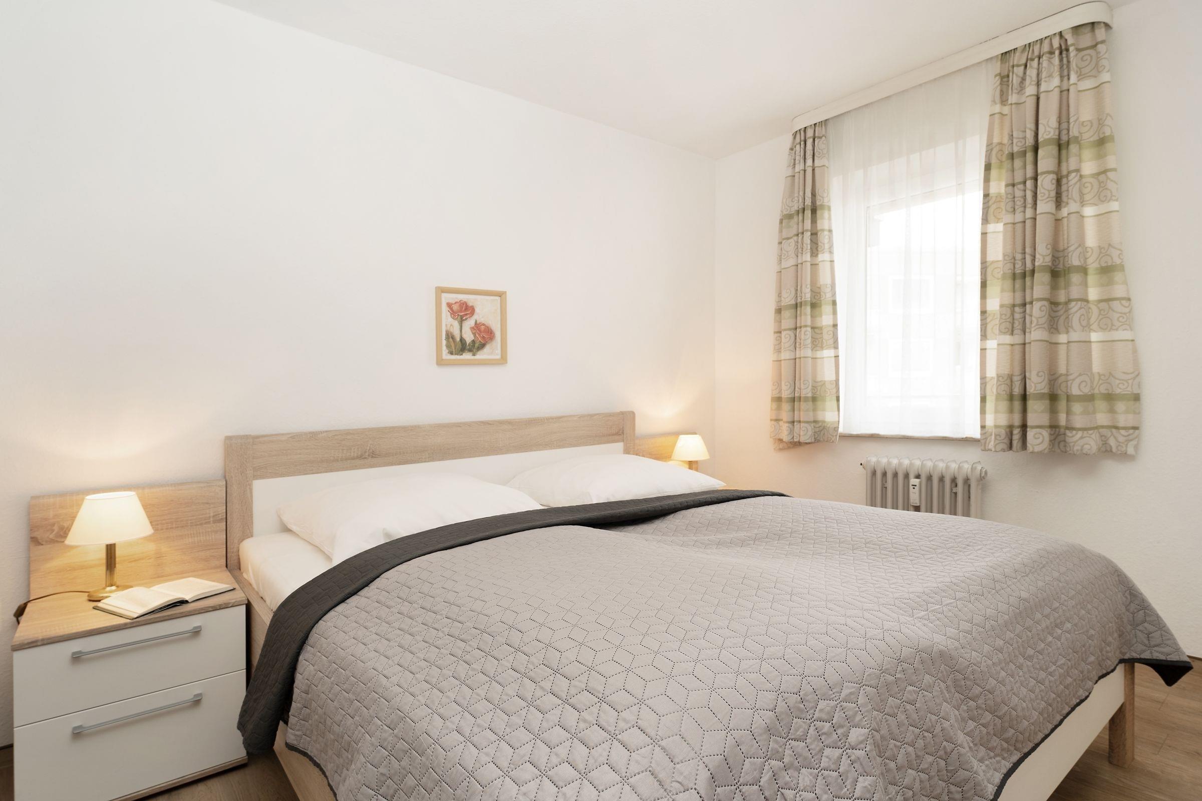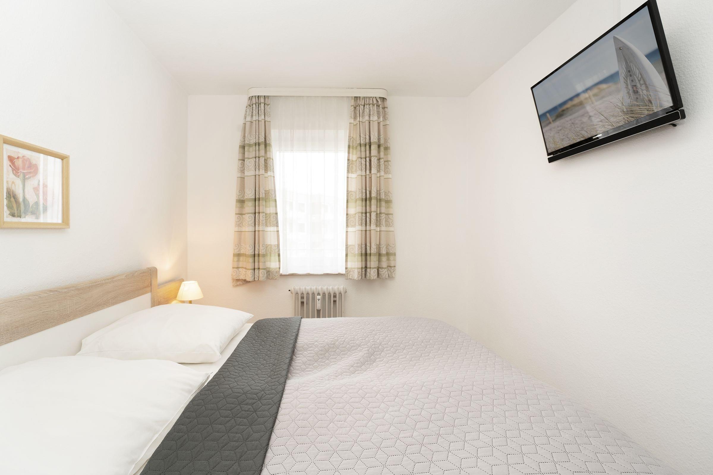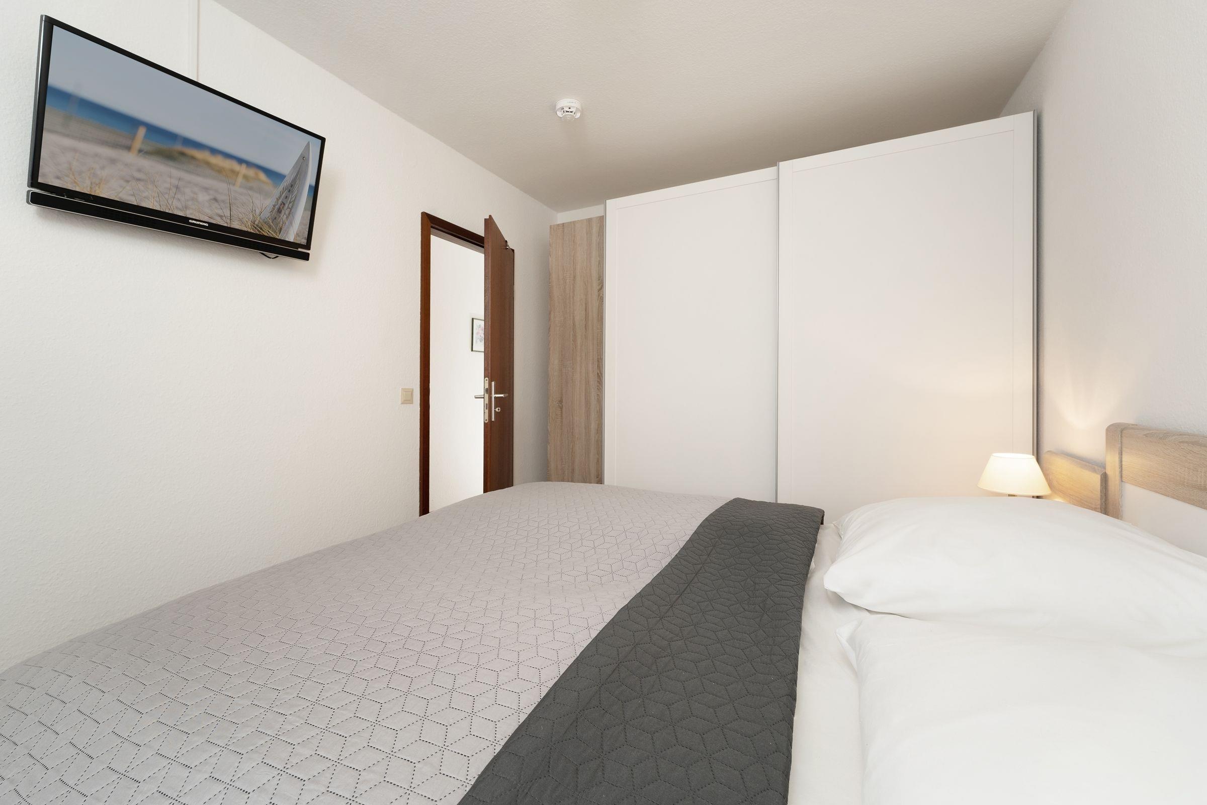 Schlafzimmer: Doppelbett (2x 90x200 cm), Kleiderschrank, TV, Verdunklungsmöglichkeit: Vorhänge, kein Platz für Babybett vorhanden