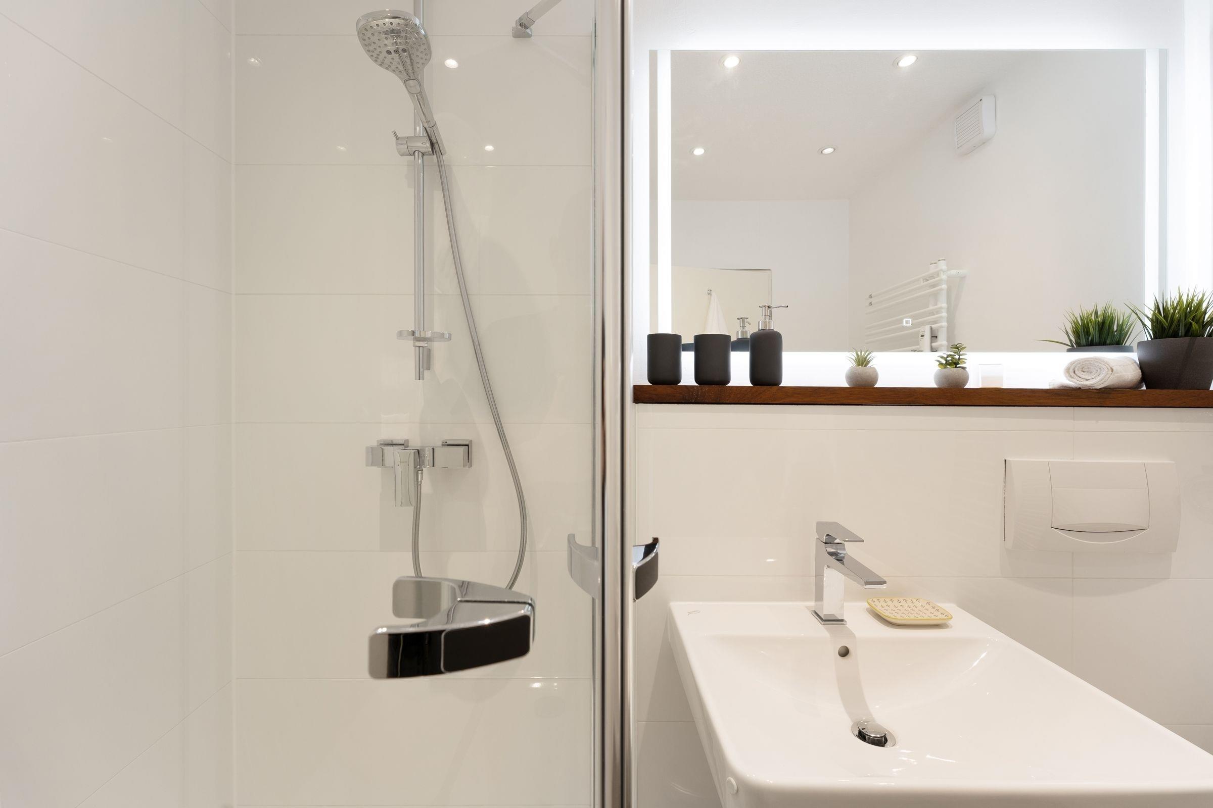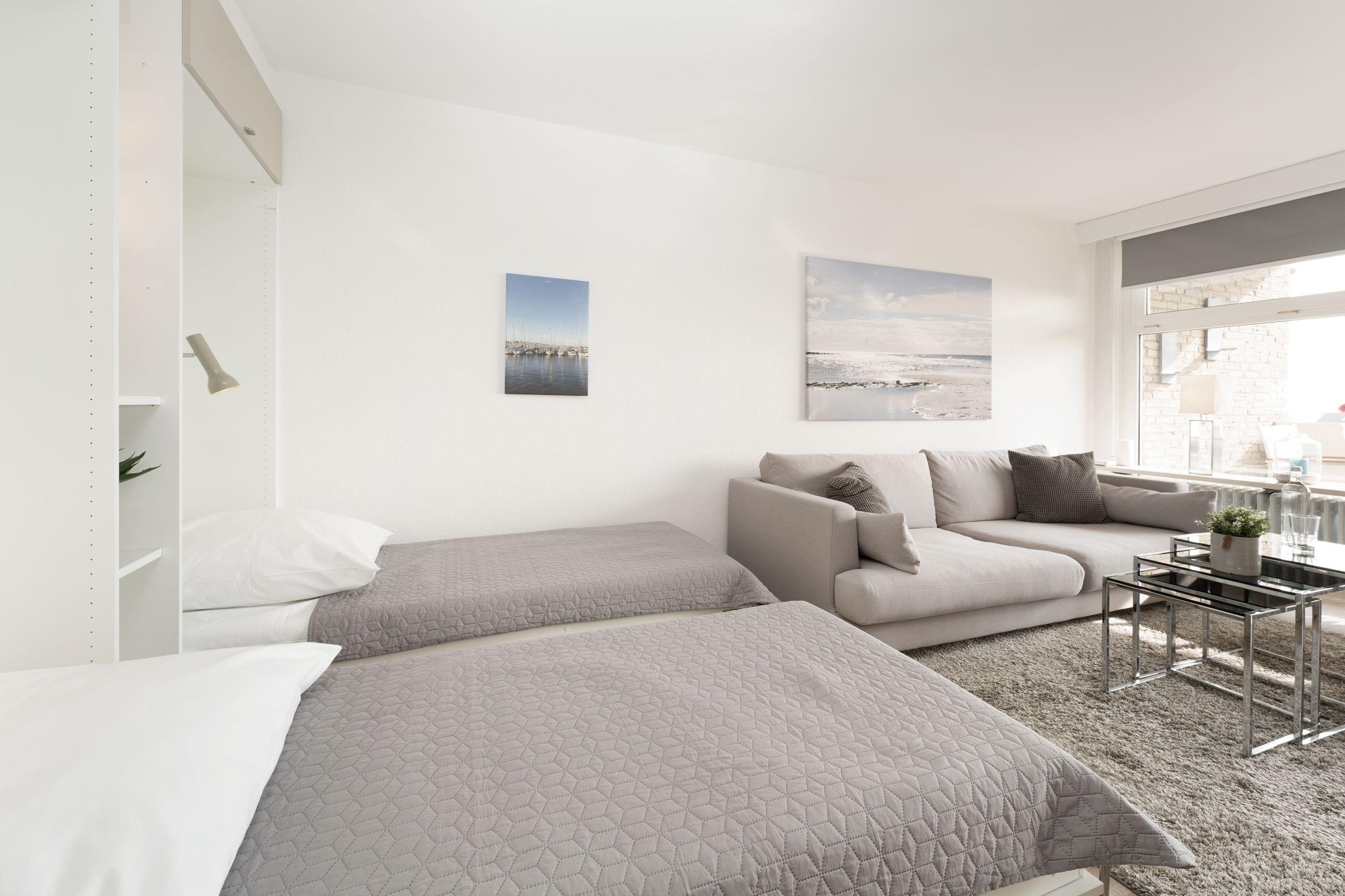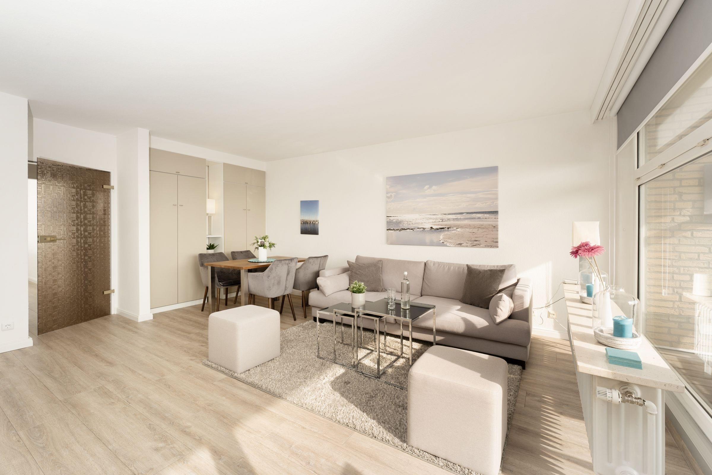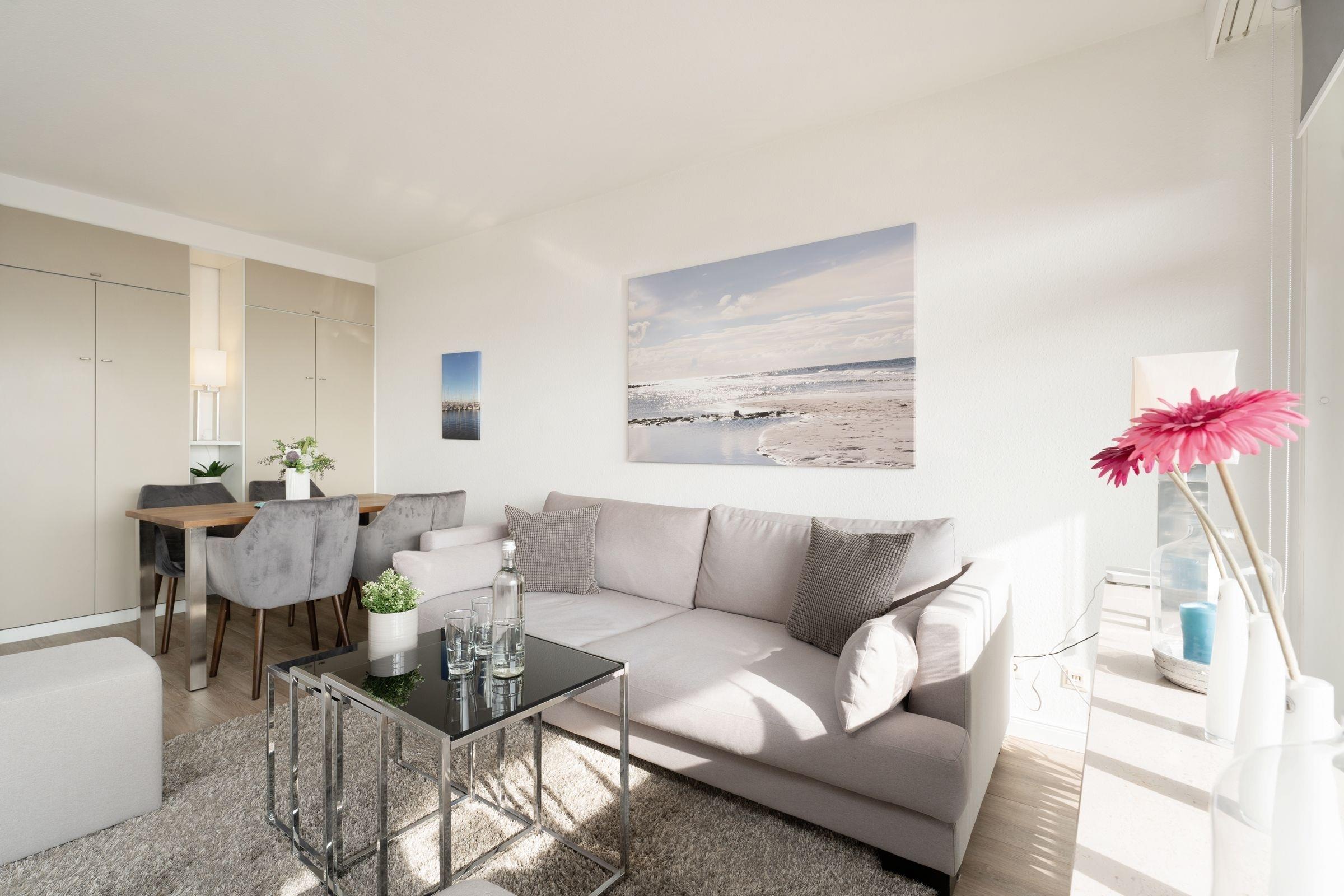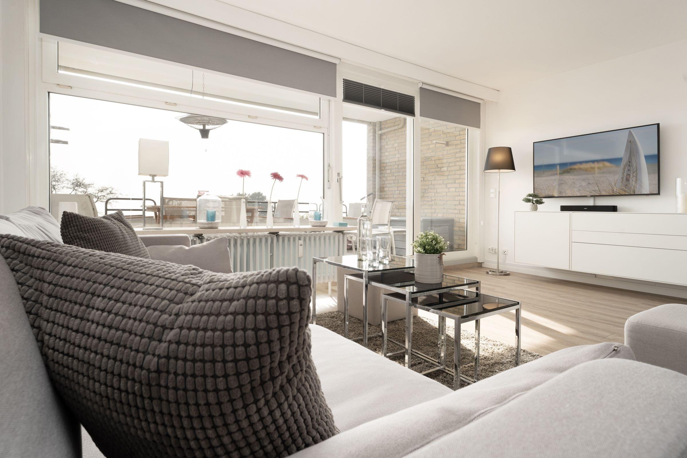 Auszeit mit Aussicht – der Name dieser edlen Wohnung verspricht nicht zu viel: Direkt vom gemütlichen Wohnbereich aus können Sie die Ostsee genießen. Lauschen Sie auf dem möblierten Balkon den Wellen und erfreuen Sie sich an der guten Seeluft. Dank der Überdachung sitzen Sie hier gut geschützt. Für Ihre Selbstversorgung steht Ihnen eine offene Küche mit Extras wie Cafissimo-Maschine und Geschirrspüler zur Verfügung. Geruhsame Nächte versprechen die beiden Schrankeinzelbetten (je 90x200 cm) im Wohnbereich sowie das Doppelbett (2x 90x180 cm) im Schlafzimmer. Das Duschbad bietet den Komfort, den man sich im Urlaub wünscht.