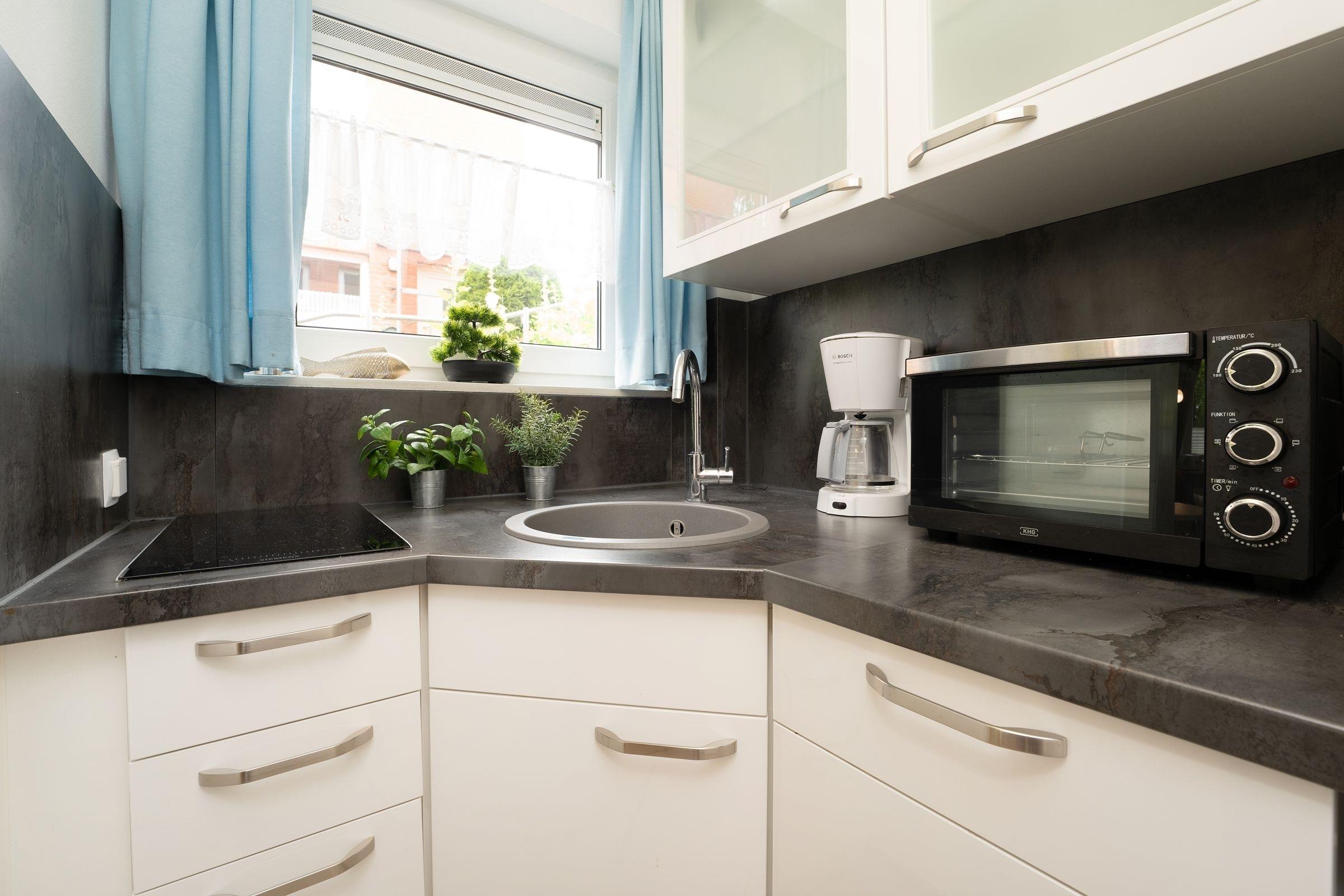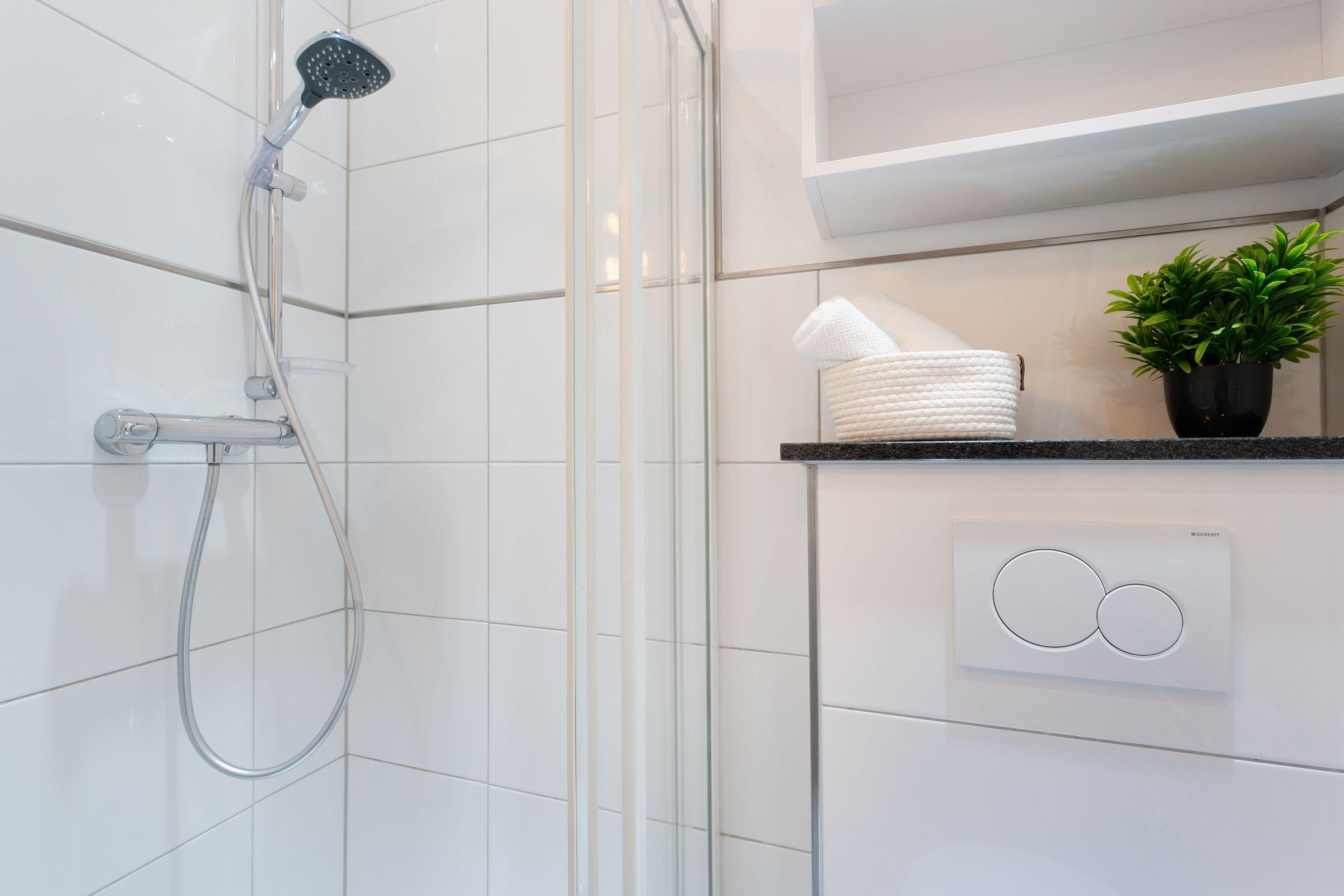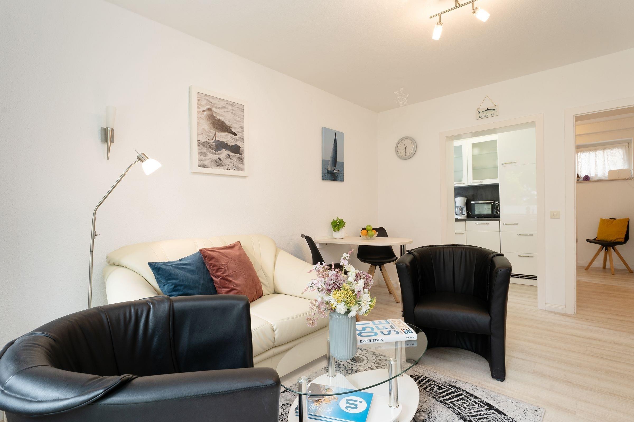 Betreten Sie den hellen Wohnbereich mit gemütlicher Sofagarnitur, TV-Ecke und Essbereich. Von hier gelangen Sie direkt auf die Südwest-Terrasse mit Blick ins Grüne. In der gut ausgestatteten Kochnische finden Sie u.a. Kühlschrank, Spülmaschine, Kaffeemaschine und ein Backofen-Grill-Kombigerät. Erholsame Nächte können Sie im separate Schlafzimmer mit Doppelbett ( 180x200 cm), Kleiderschrank und Verdunkelungsmöglichkeiten verbringen. Das hellgeflieste Bad mit Dusche komplettiert die Ausstattung dieser Ferienwohnung.