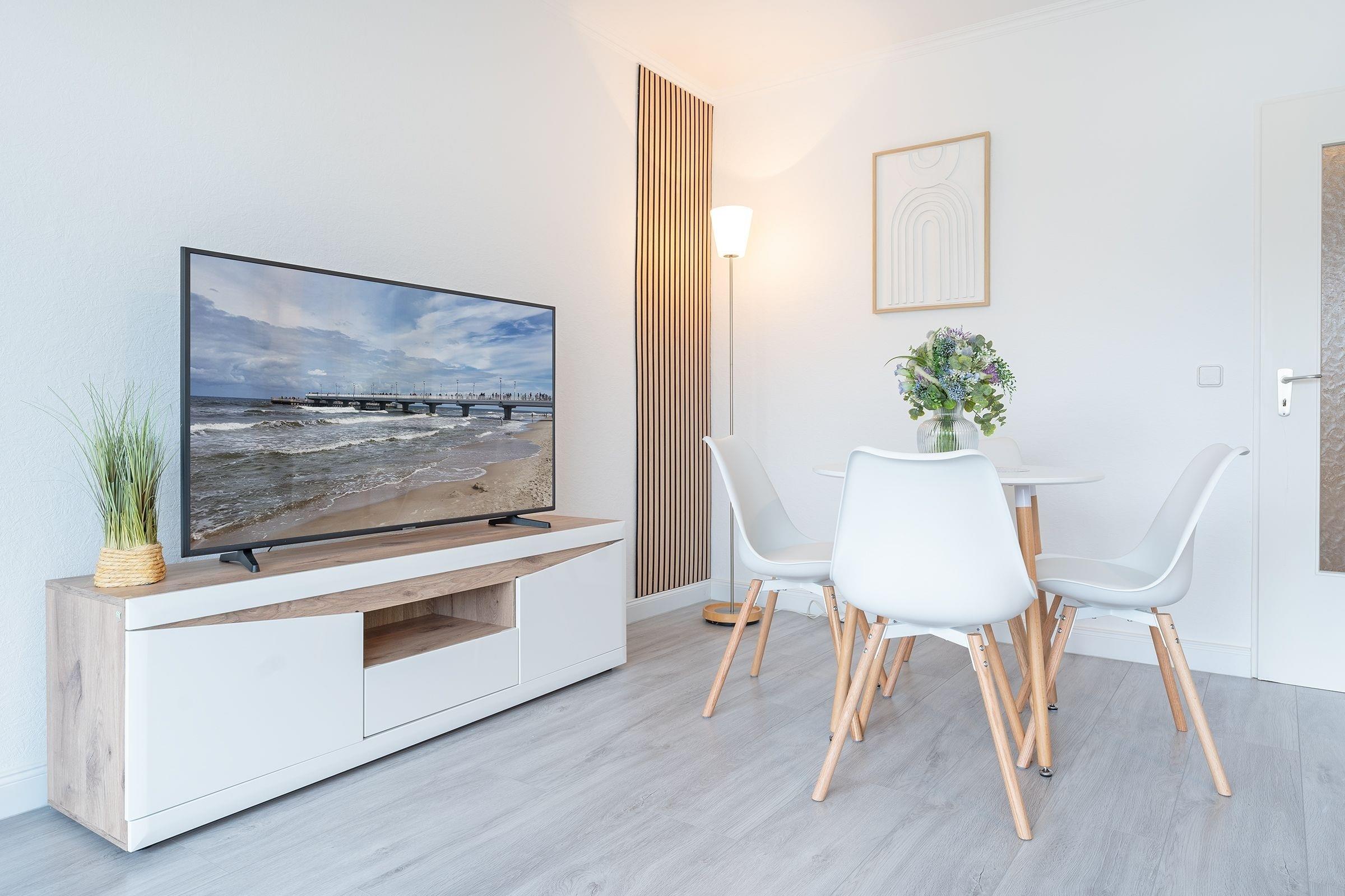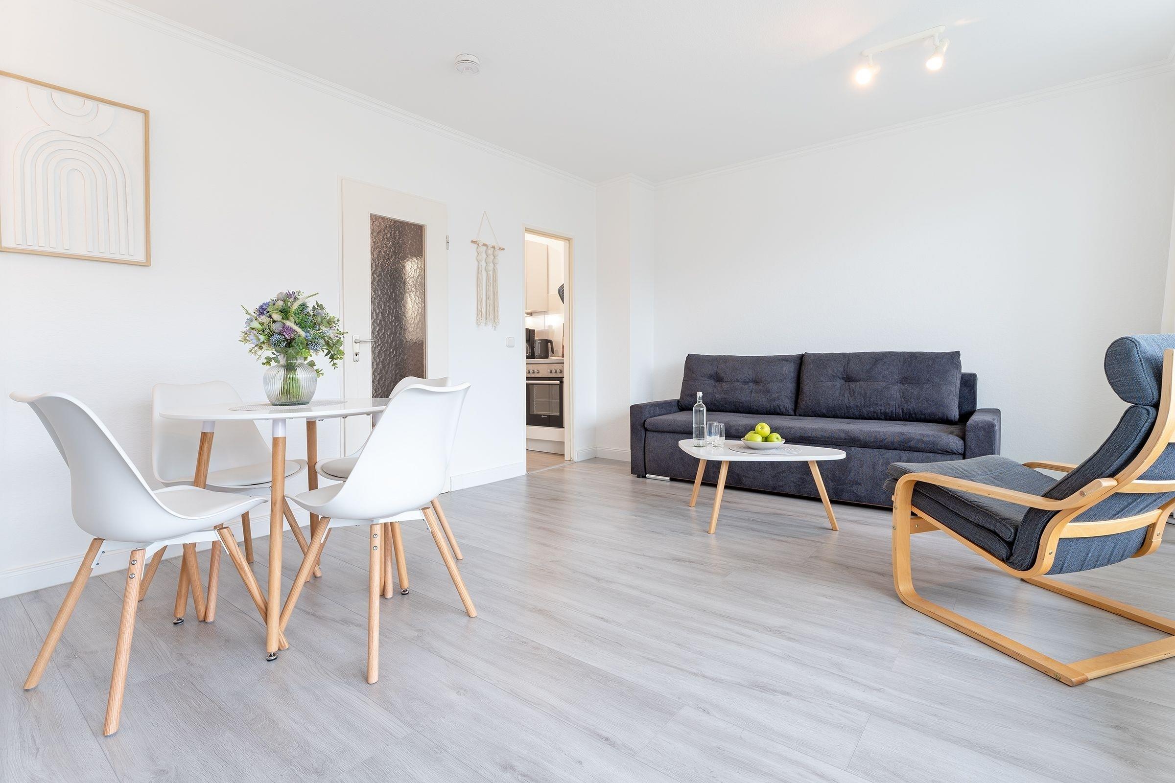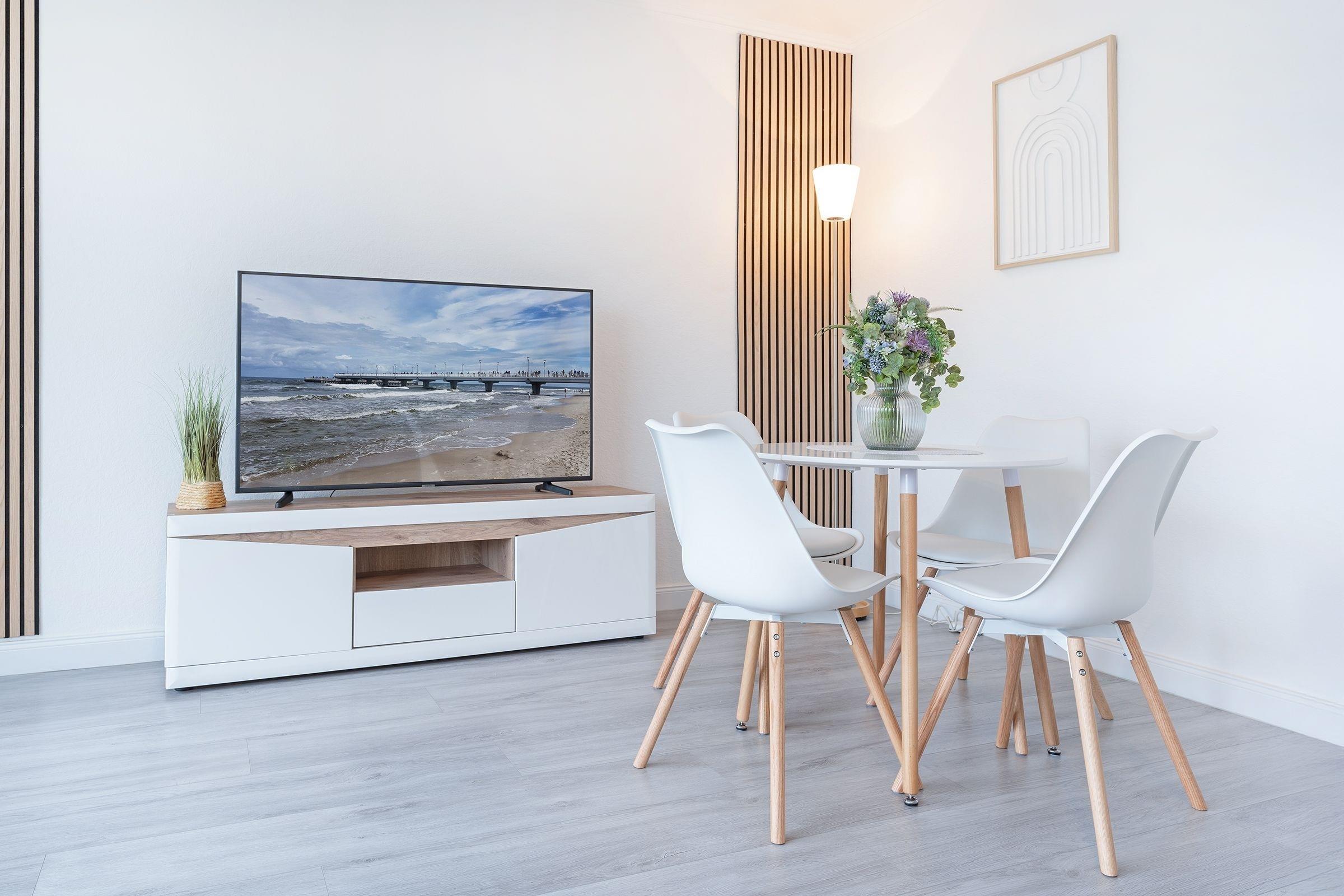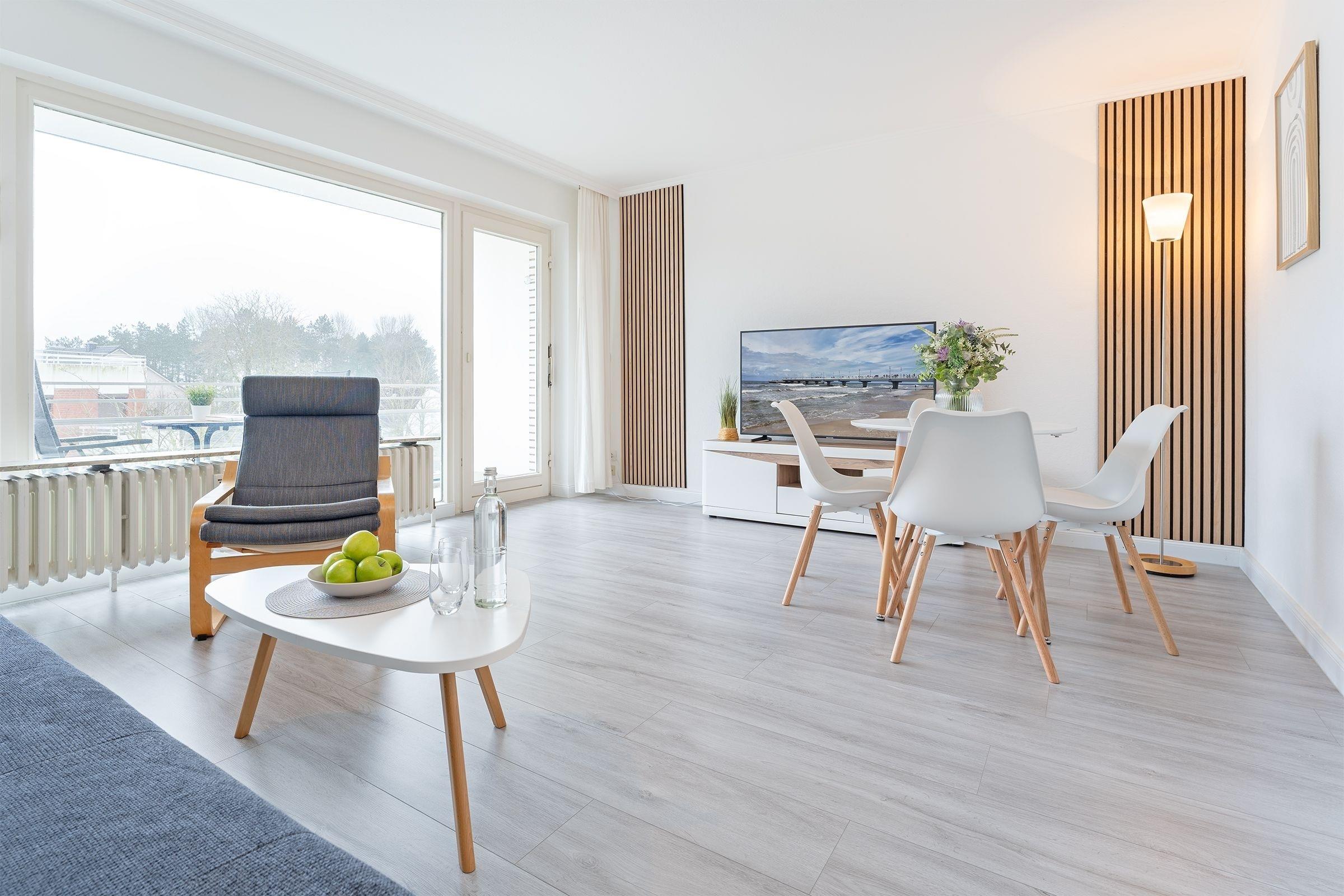 Diese geschmackvoll eingerichtete Ferienwohnung bietet Ihnen einen entspannten Urlaub an der wunderschönen Ostseeküste. Es empfängt Sie ein gemütlicher Wohnbereich mit einer Schlafcouch (160x200 cm). Die großen Fenster sorgen für viel Licht und der angrenzende Balkon lädt zum Verweilen im Freien ein. In der Küche mit einer umfangreichen Ausstattung können Sie kulinarische Highlights zaubern. Der Essbereich bietet Platz für die ganze Familie. Das separate Schlafzimmer verfügt über ein komfortables Boxspring-Doppelbett (180x200 cm). Das moderne Tageslichtbad mit Badewanne sorgt für einen gelungenen Start in den Tag.