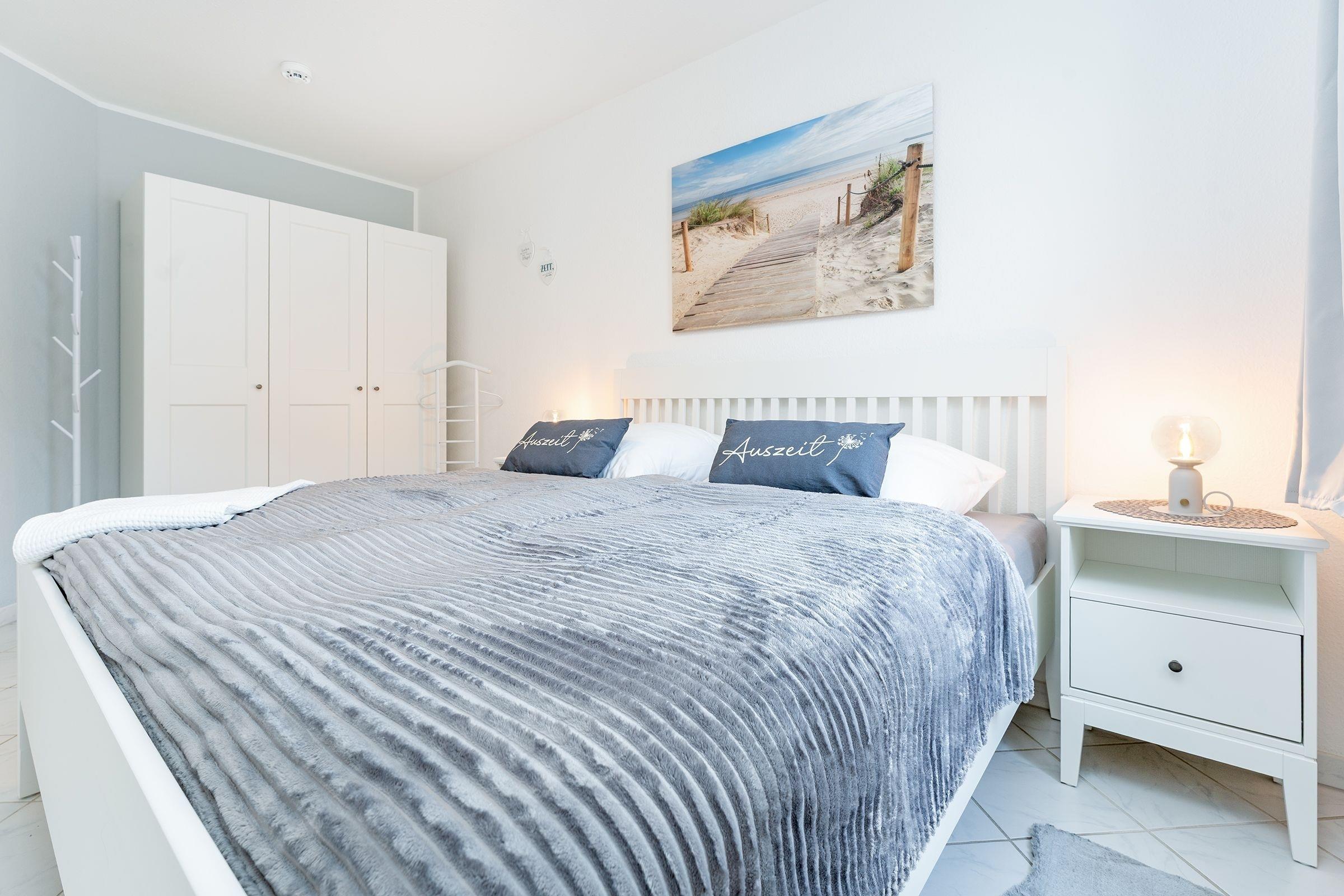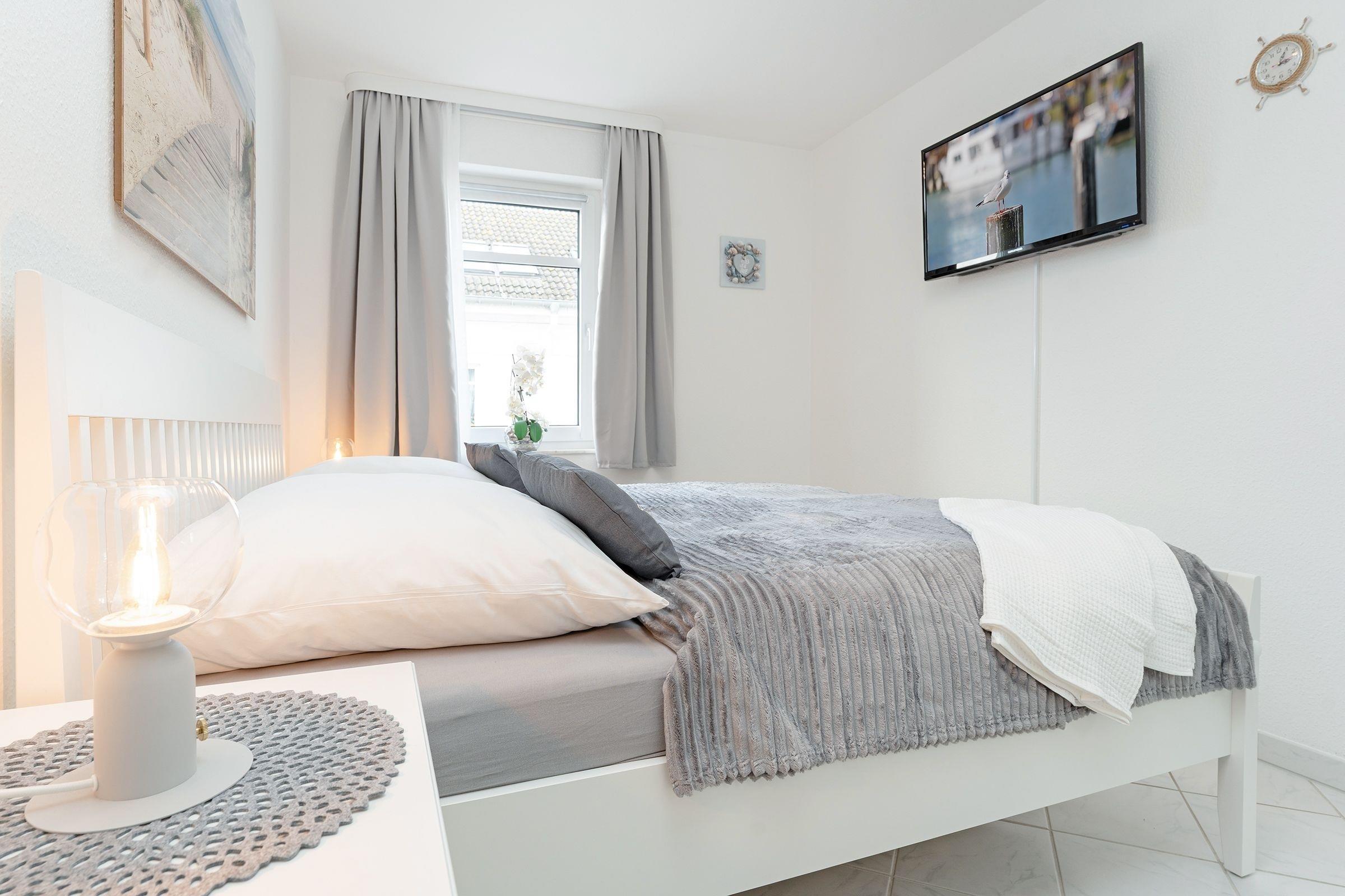 Schlafzimmer: 1 Doppelbett (2x 90x200 cm), Kleiderschrank, TV, Verdunkelung: Verdunkelungsrollo und -gardinen, Platz für ein Babybett vorhanden