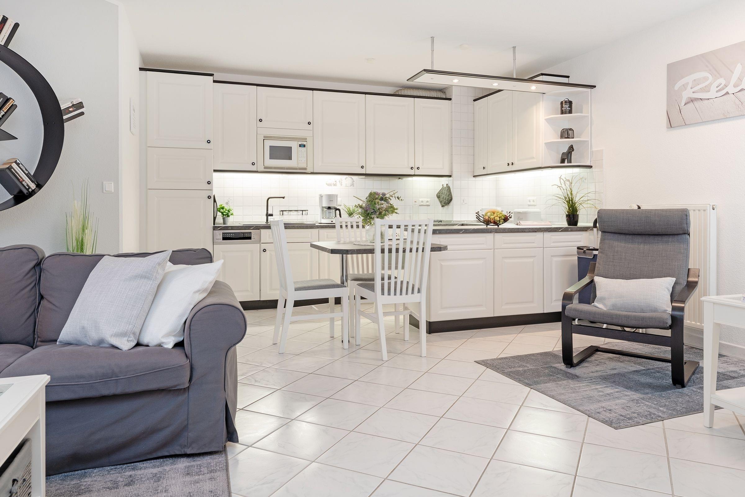 Diese stilvolle Ferienwohnung bietet Ihnen modernen Komfort und eine hervorragende Lage nahe Grömitz' feinsandigem Strand. Der Kurpark, Einkaufsmöglichkeiten und Restaurants befinden sich in direkter Nachbarschaft. Die Wohnung ist bequem über einen Aufzug erreichbar. Der helle Wohnbereich ist mit einem gemütlichen Sofa, TV und HiFi-Anlage ausgestattet und lädt zu entspannten Stunden ein. Vom Wohnbereich aus gelangen Sie auf den Balkon, der nach Südwesten ausgerichtet ist und sich ideal für ein Frühstück in der Morgensonne oder einen entspannten Abend eignet. Die offene Küche ist gut ausgestattet und verfügt über ein Cerankochfeld, Backofen, Kühlschrank mit Gefrierfach, Spülmaschine, Mikrowelle, Kaffeemaschine, Eierkocher, Toaster und Wasserkocher. Hier können Sie sich kulinarisch verwöhnen und Ihre Lieblingsgerichte selbst zubereiten. Der angrenzende Essbereich bietet Platz für Mahlzeiten in gemütlicher Runde. Das Schlafzimmer ist mit einem komfortablen Doppelbett (2x 90x200 cm) ausgestattet und sorgt für erholsame Nächte. Großzügige Staumöglichkeiten runden die Ausstattung ab. Das moderne Badezimmer verfügt über eine bodengleiche Dusche, ein Waschbecken, einen Haartrockner, Kosmetikspiegel und ein WC.