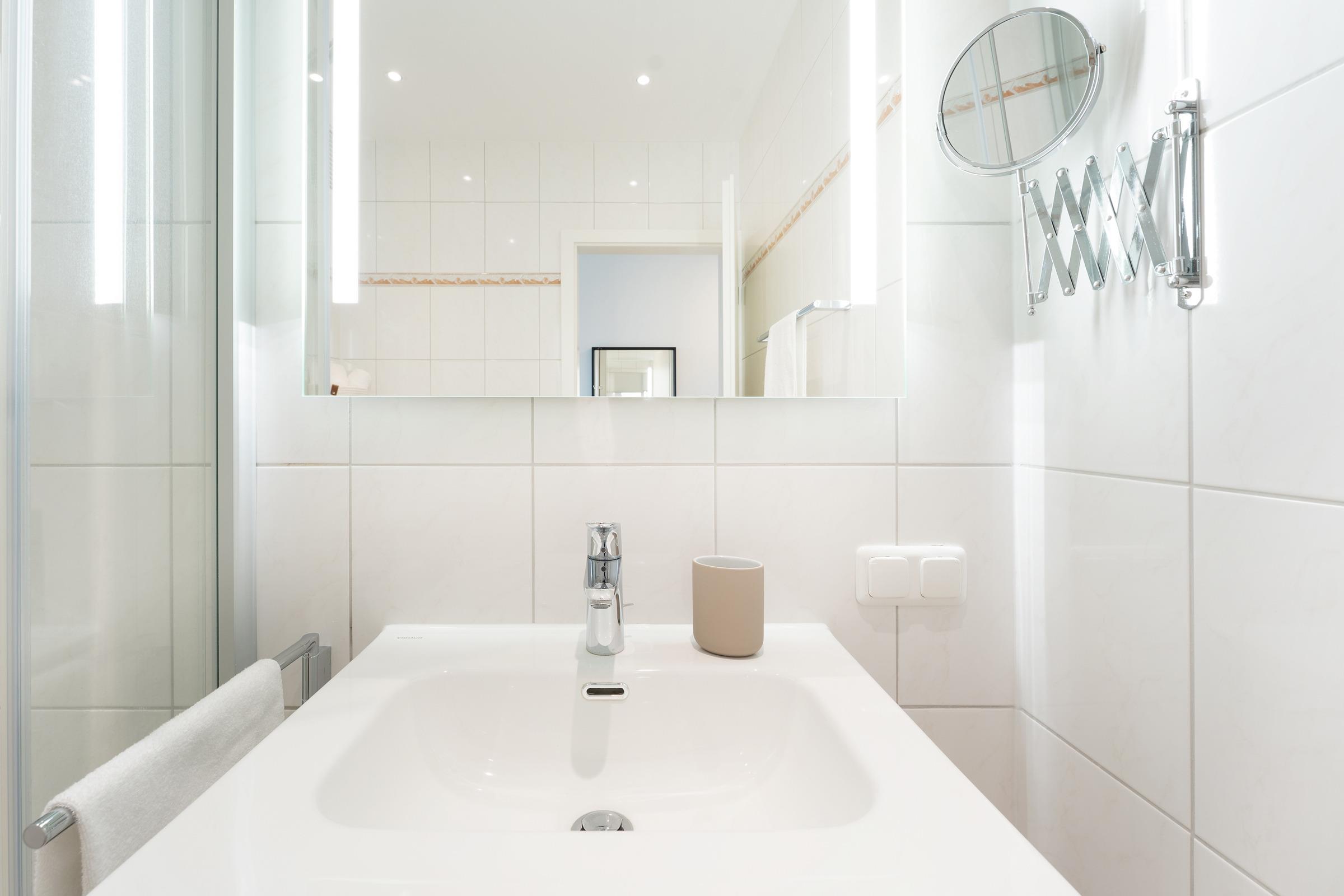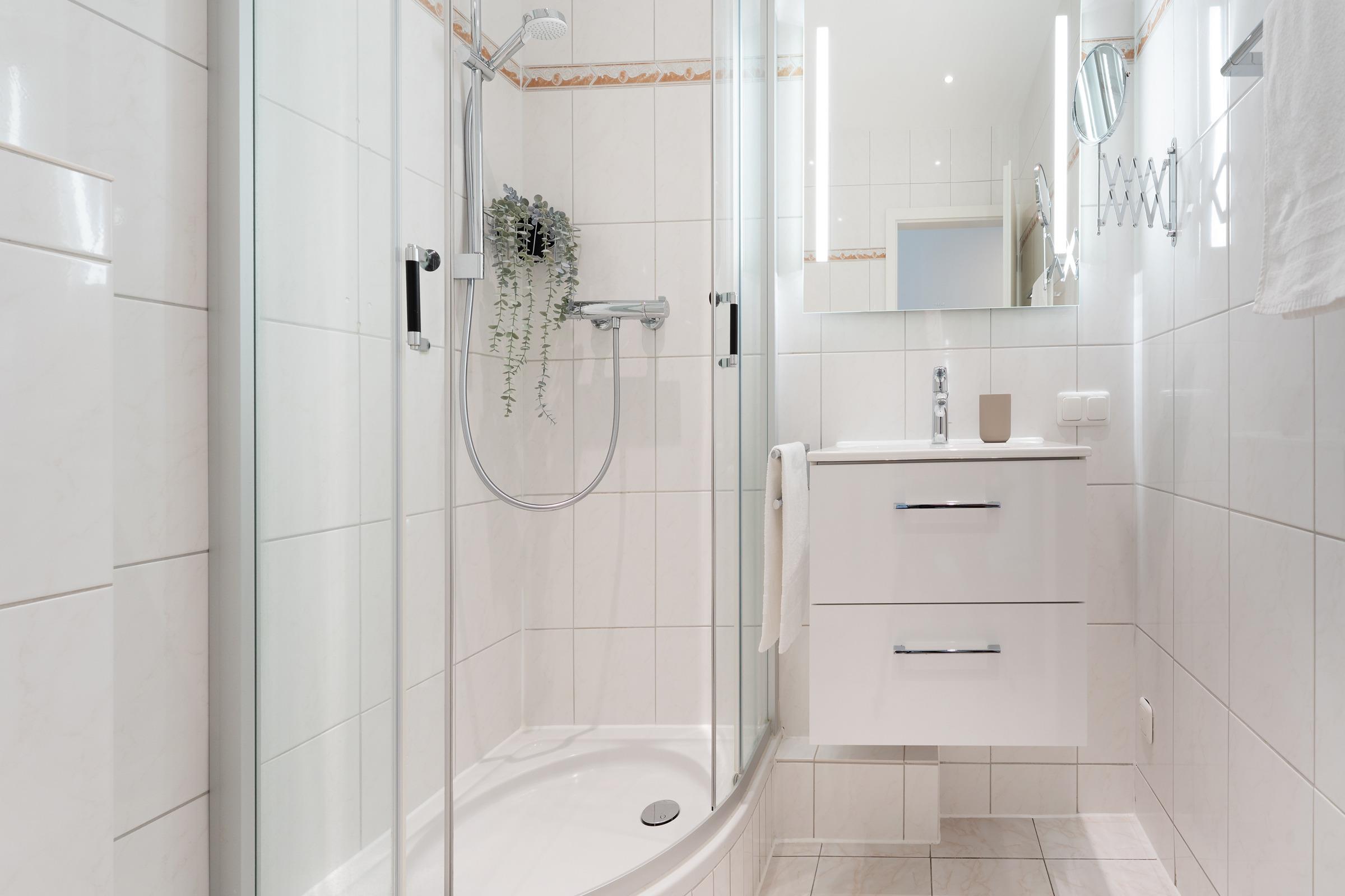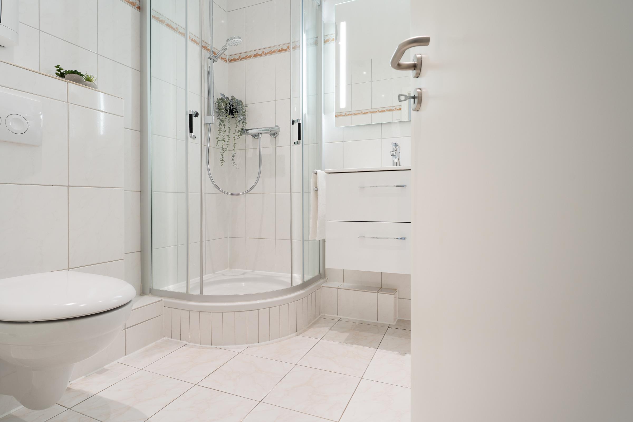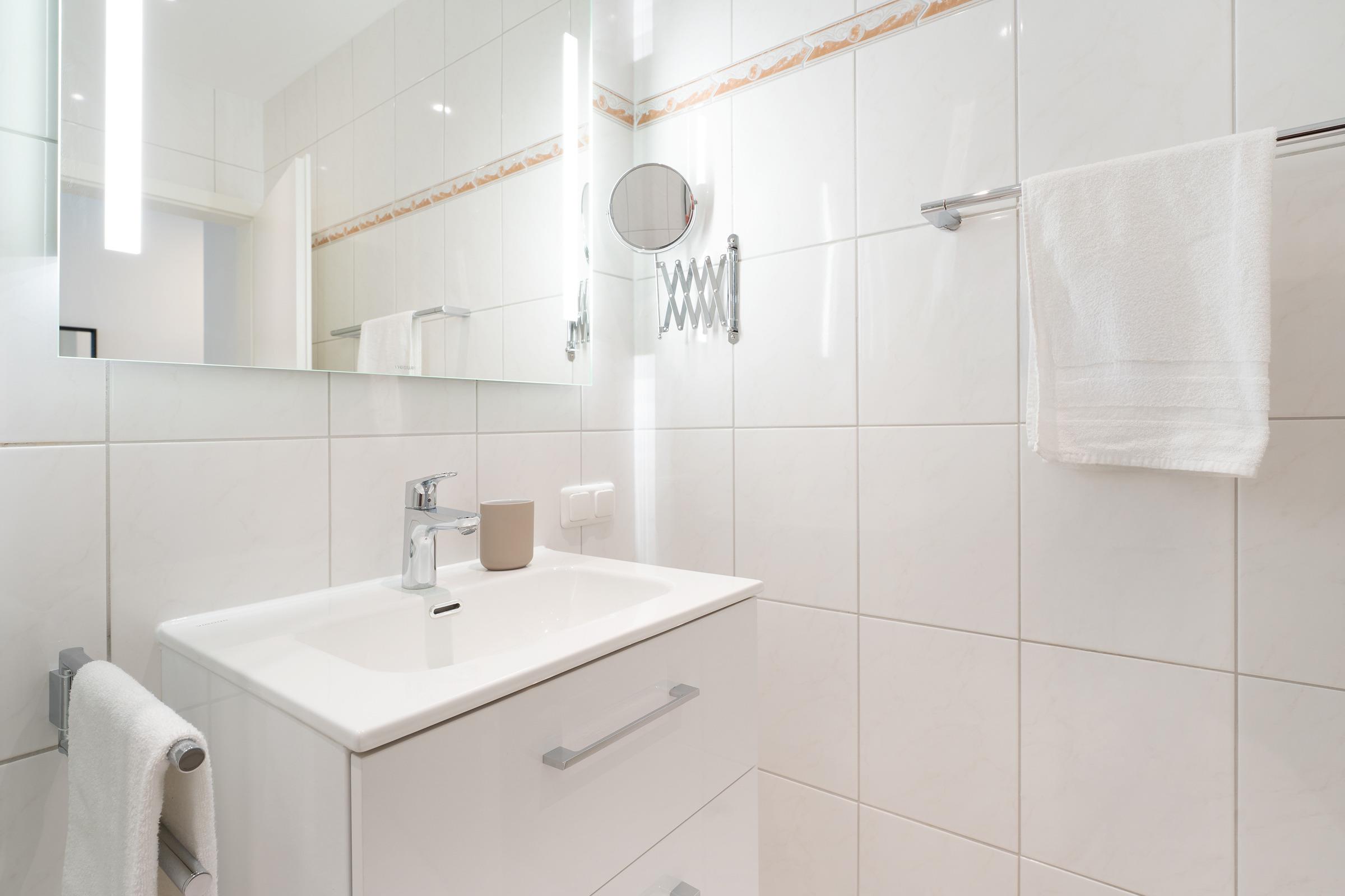 Das moderne Badezimmer verfügt über eine Dusche, Kosmetikspiegel, Waschbecken, Haartrockner und WC. Eine gemeinschaftliche Waschmaschine und ein Trockner stehen gegen Gebühr zur Verfügung.