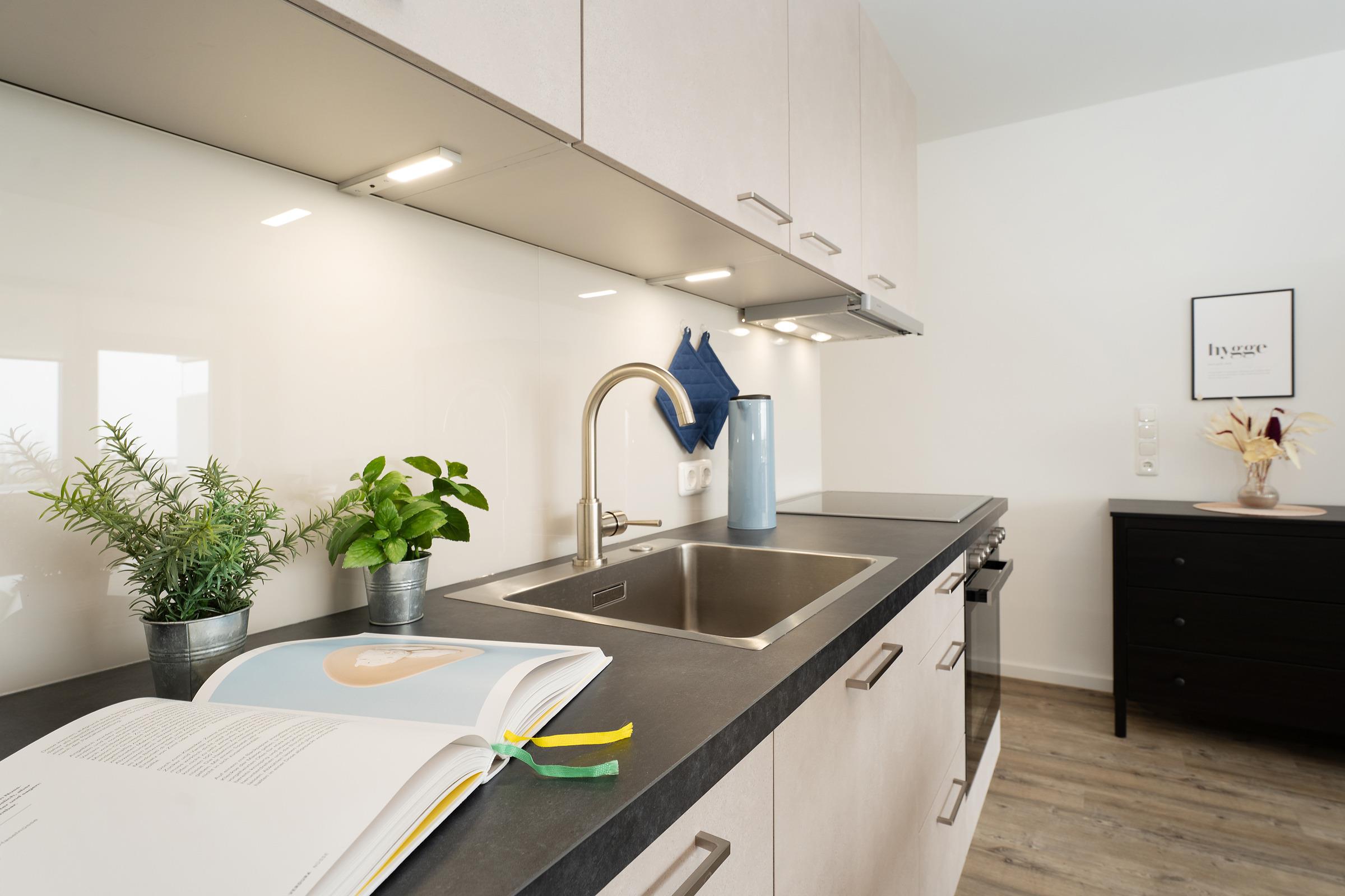 Die offene Küche ist voll ausgestattet mit Ceranherd, Backofen, Kühlschrank mit Gefrierfach, Spülmaschine, Kaffeemaschine und Toaster. Der angrenzende Essbereich bietet Platz für gemeinsame Mahlzeiten.