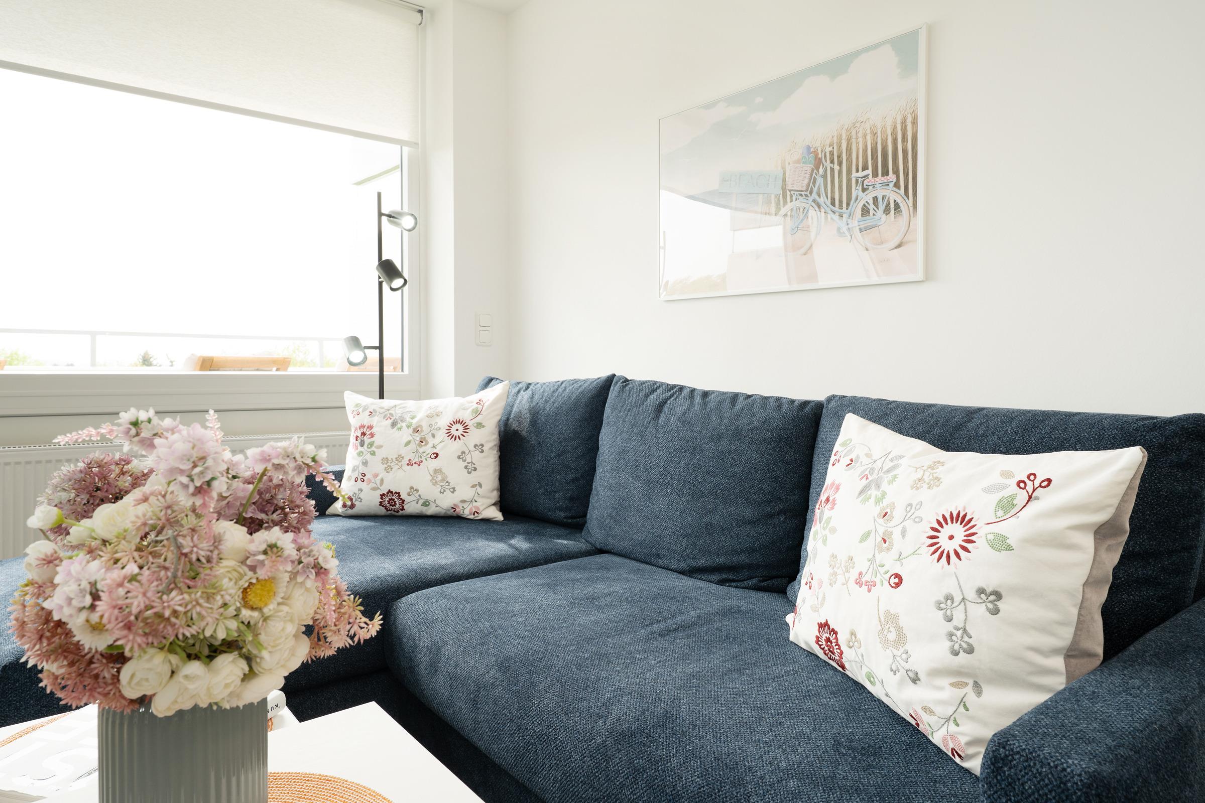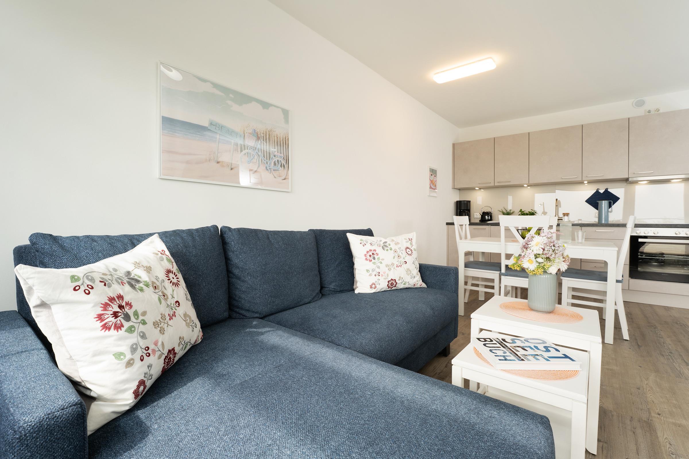 Diese moderne Ferienwohnung in Grömitz bietet die perfekte Kombination aus Komfort und strandnaher Lage. Der helle Wohnbereich mit gemütlicher Sofaecke und TV lädt zum Entspannen ein. Große Fenster sorgen für ein freundliches Ambiente. Von hier aus gelangen Sie auf die Dachterrasse mit Gartenmöbeln, ideal zum Genießen der Meeresluft.