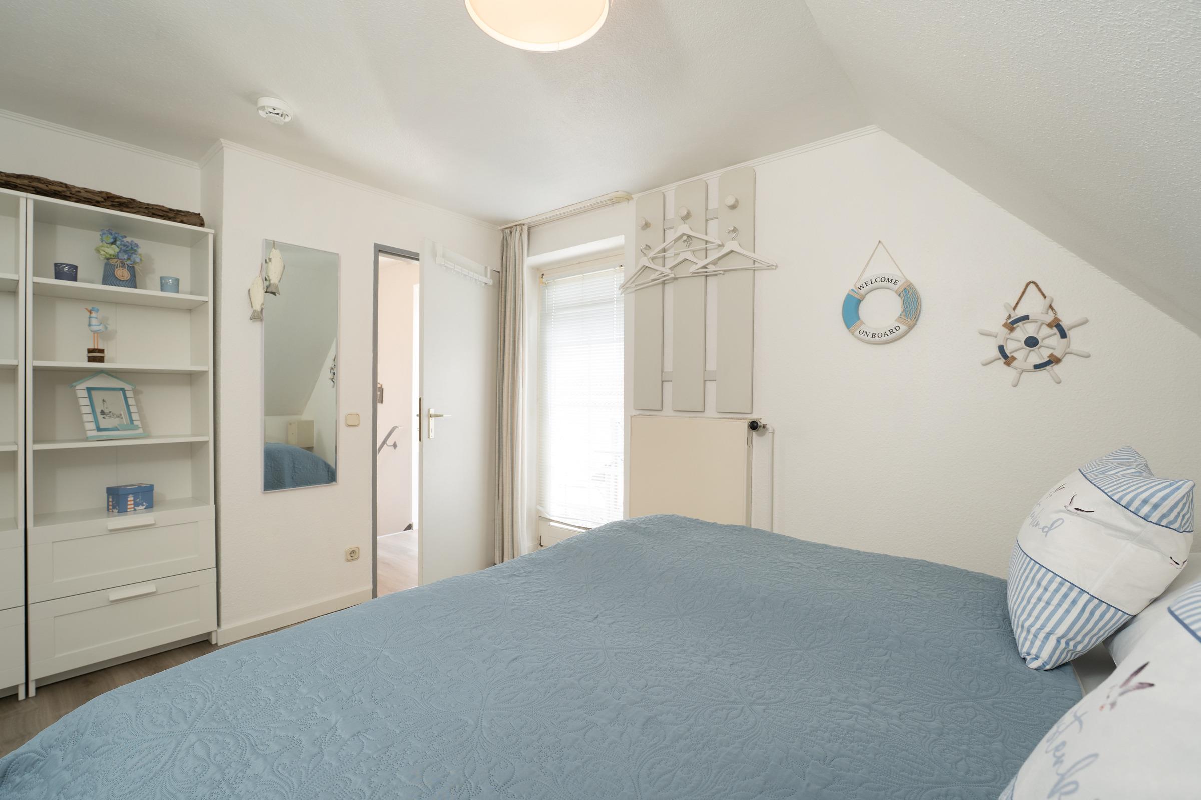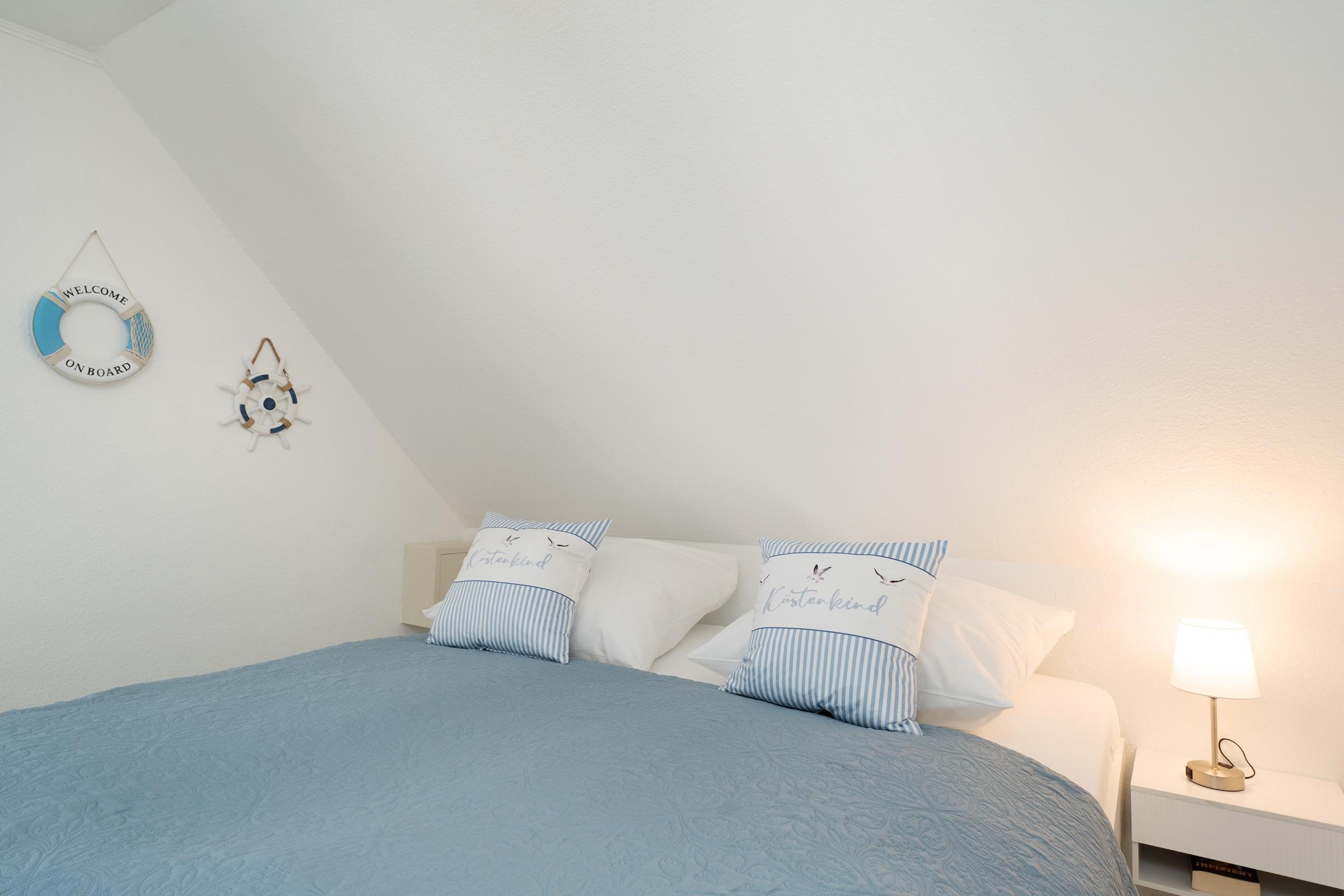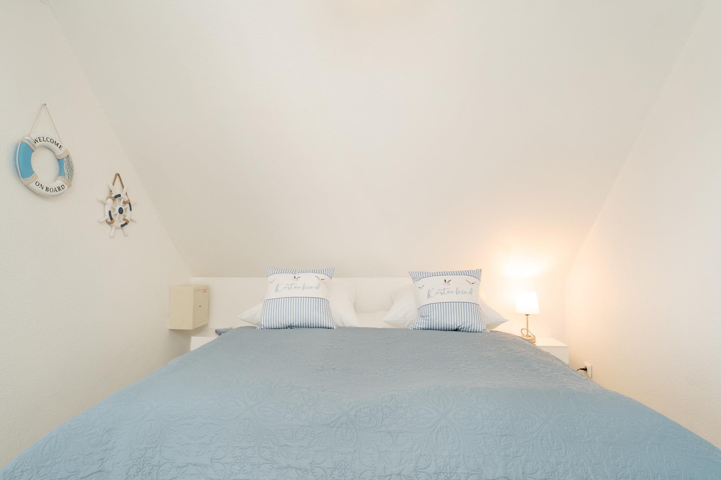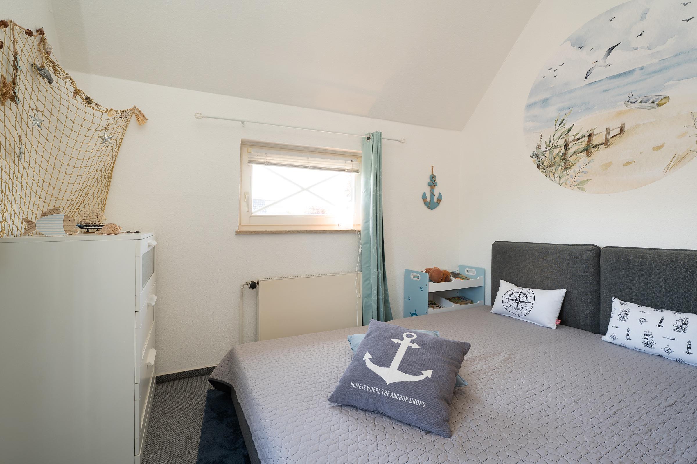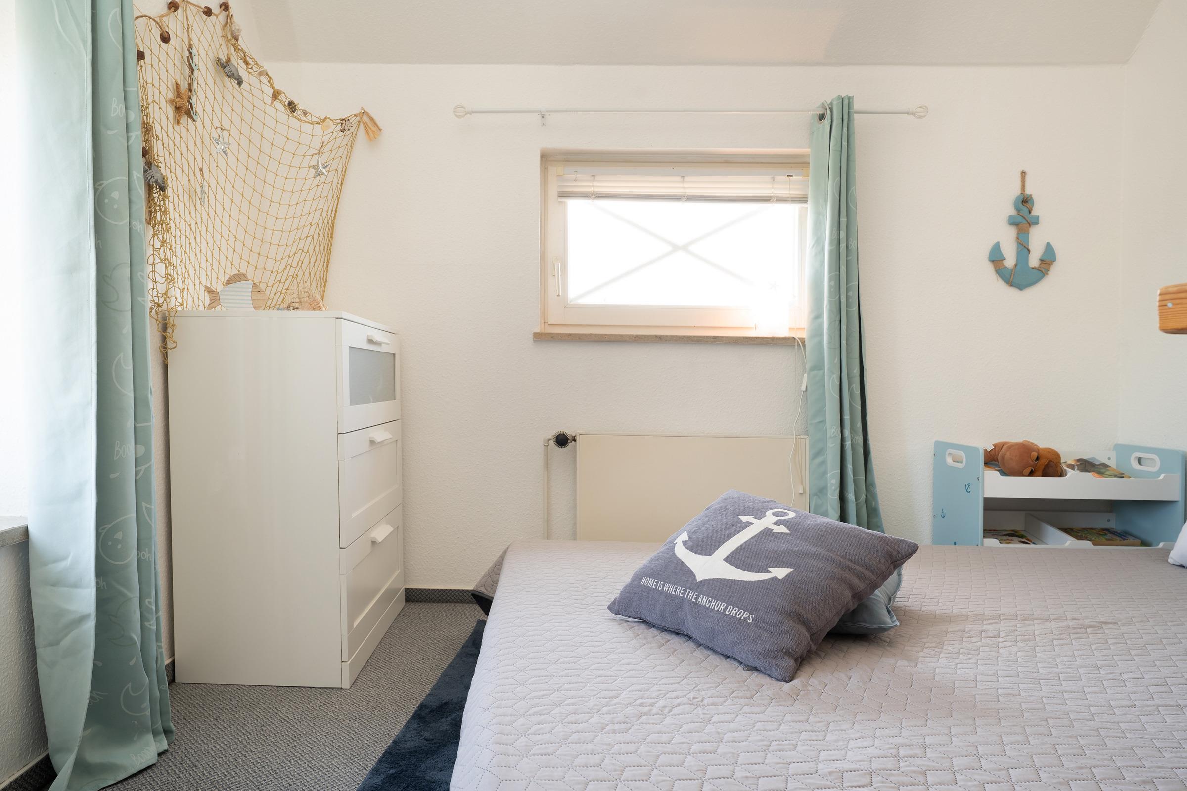 Die Ferienwohnung verfügt über zwei Schlafzimmer mit insgesamt vier Schlafmöglichkeiten. Im ersten Schlafzimmer mit Kleiderschrank erwartet Sie ein bequemes Doppelbett (ca. 2x 90x200 cm). Das 2. Schlafzimmer im 2. Obergeschoss erreichen Sie über eine Raumspartreppe, die durch ein Treppengitter gesichert ist (bitte Kinder bei der Treppennutzung beaufsichtigen). Hier schlafen Sie in zwei gemütlichen Einzelbetten (je ca. 80x200 cm). Ein 5. Reisegast kann sein Nachtlager auf dem komfortablen Schlafsofa (ca. 140x200 cm) im Wohnzimmer aufschlagen. Ein Babybett ist hier inklusive.