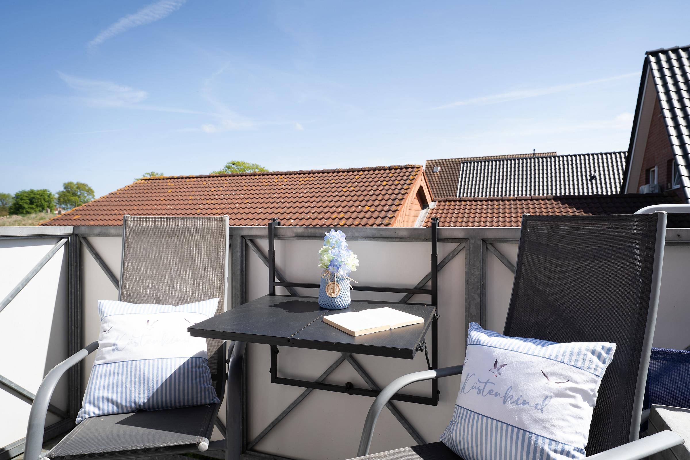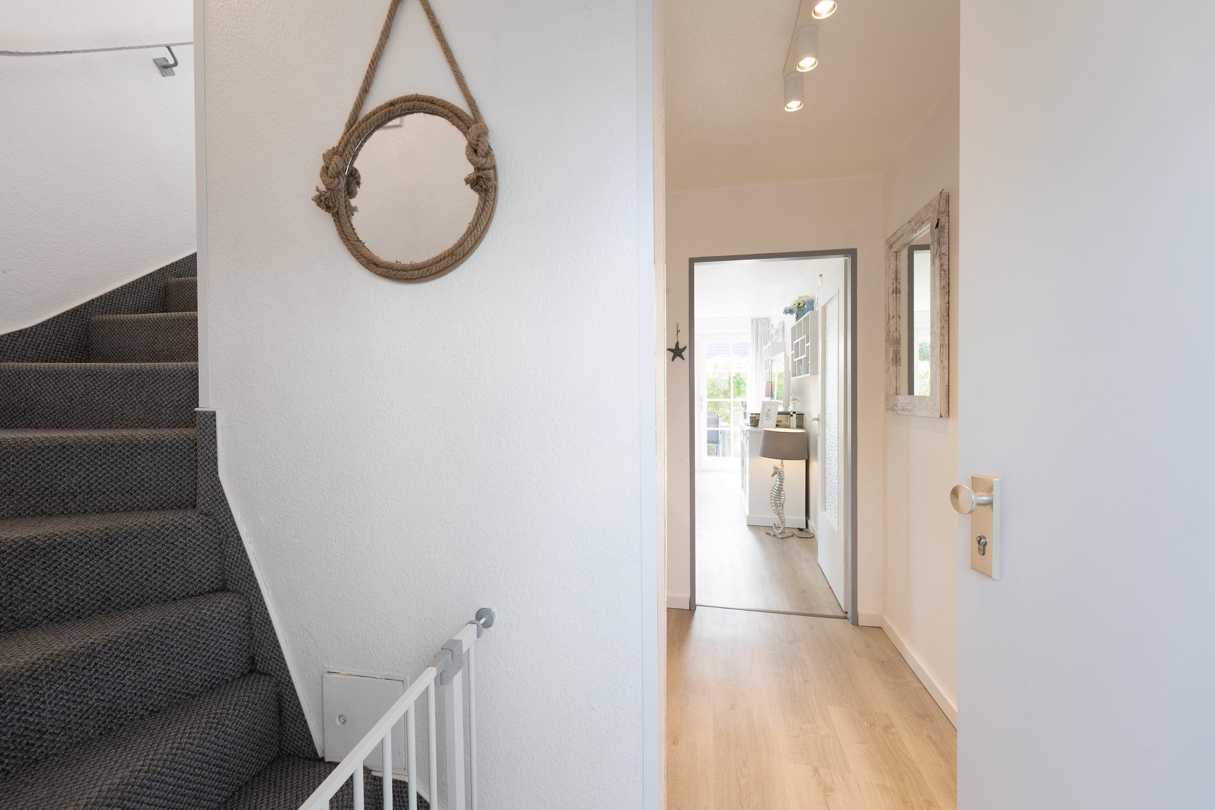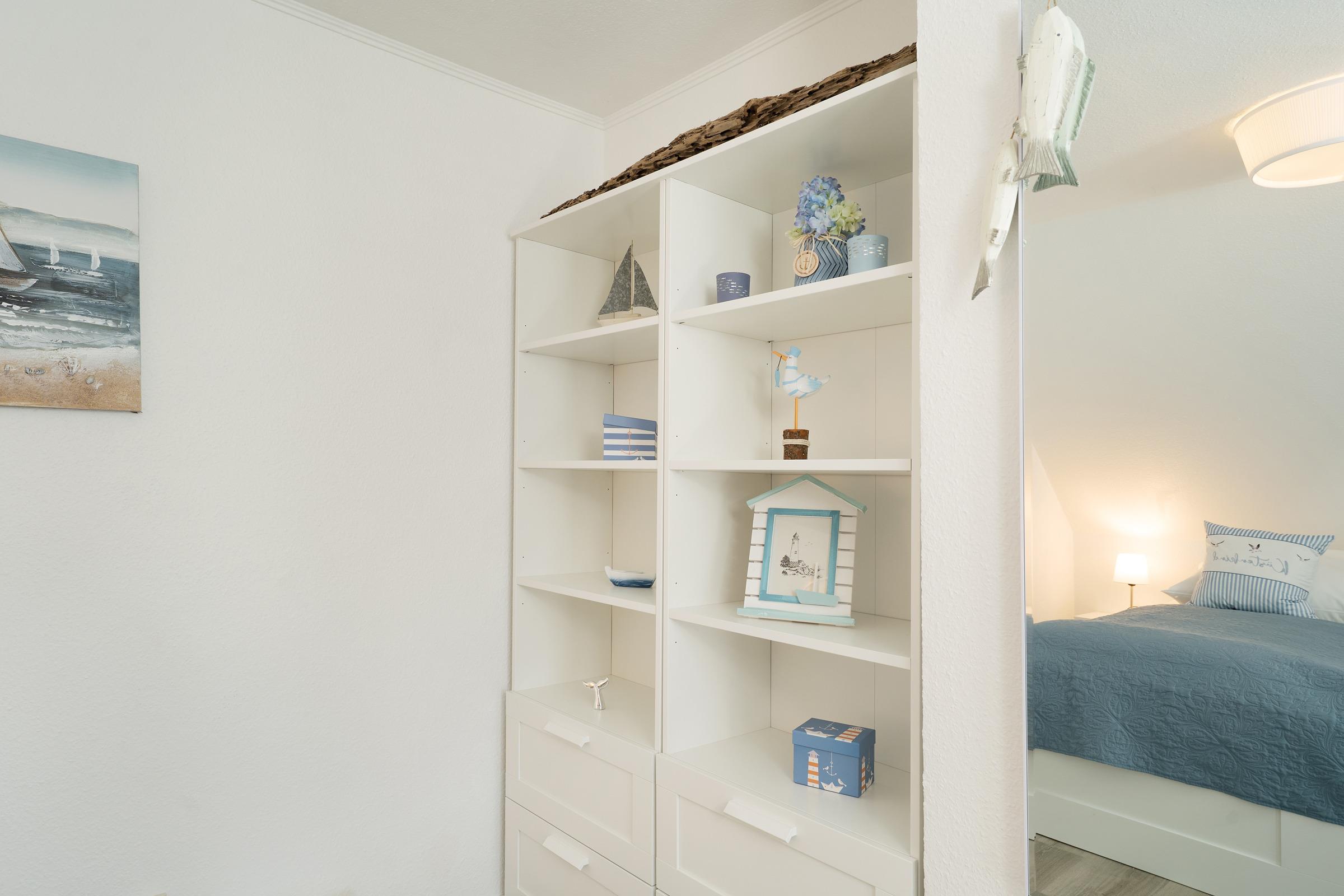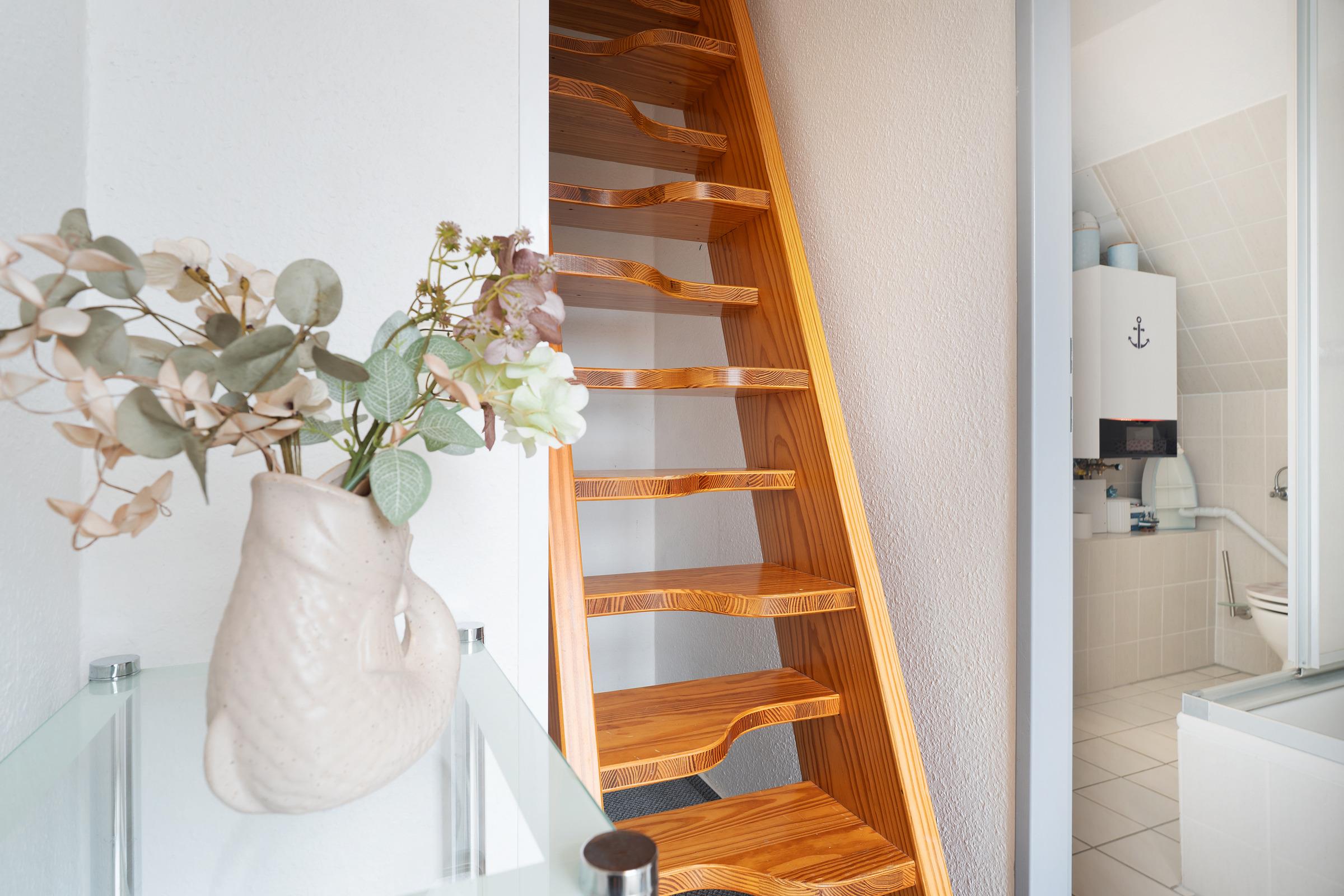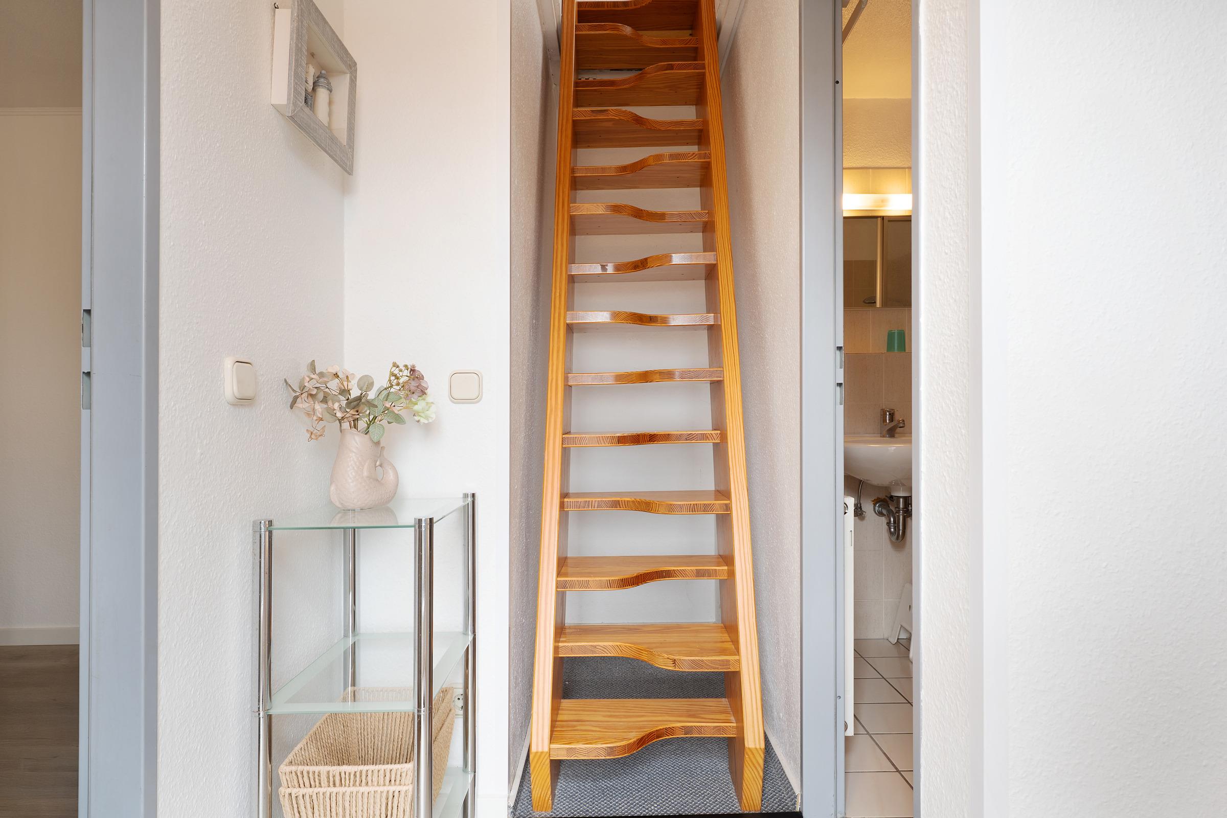 Die Ferienwohnung verfügt über zwei Schlafzimmer mit insgesamt vier Schlafmöglichkeiten. Im ersten Schlafzimmer mit Kleiderschrank erwartet Sie ein bequemes Doppelbett (ca. 2x 90x200 cm). Das 2. Schlafzimmer im 2. Obergeschoss erreichen Sie über eine Raumspartreppe, die durch ein Treppengitter gesichert ist (bitte Kinder bei der Treppennutzung beaufsichtigen). Hier schlafen Sie in zwei gemütlichen Einzelbetten (je ca. 80x200 cm). Ein 5. Reisegast kann sein Nachtlager auf dem komfortablen Schlafsofa (ca. 140x200 cm) im Wohnzimmer aufschlagen. Ein Babybett ist hier inklusive.