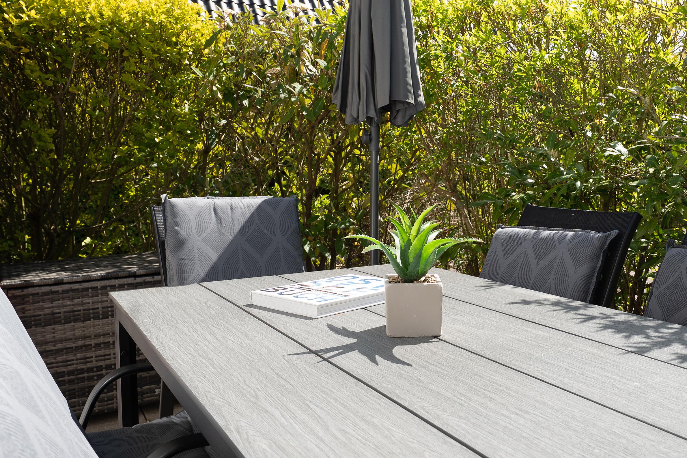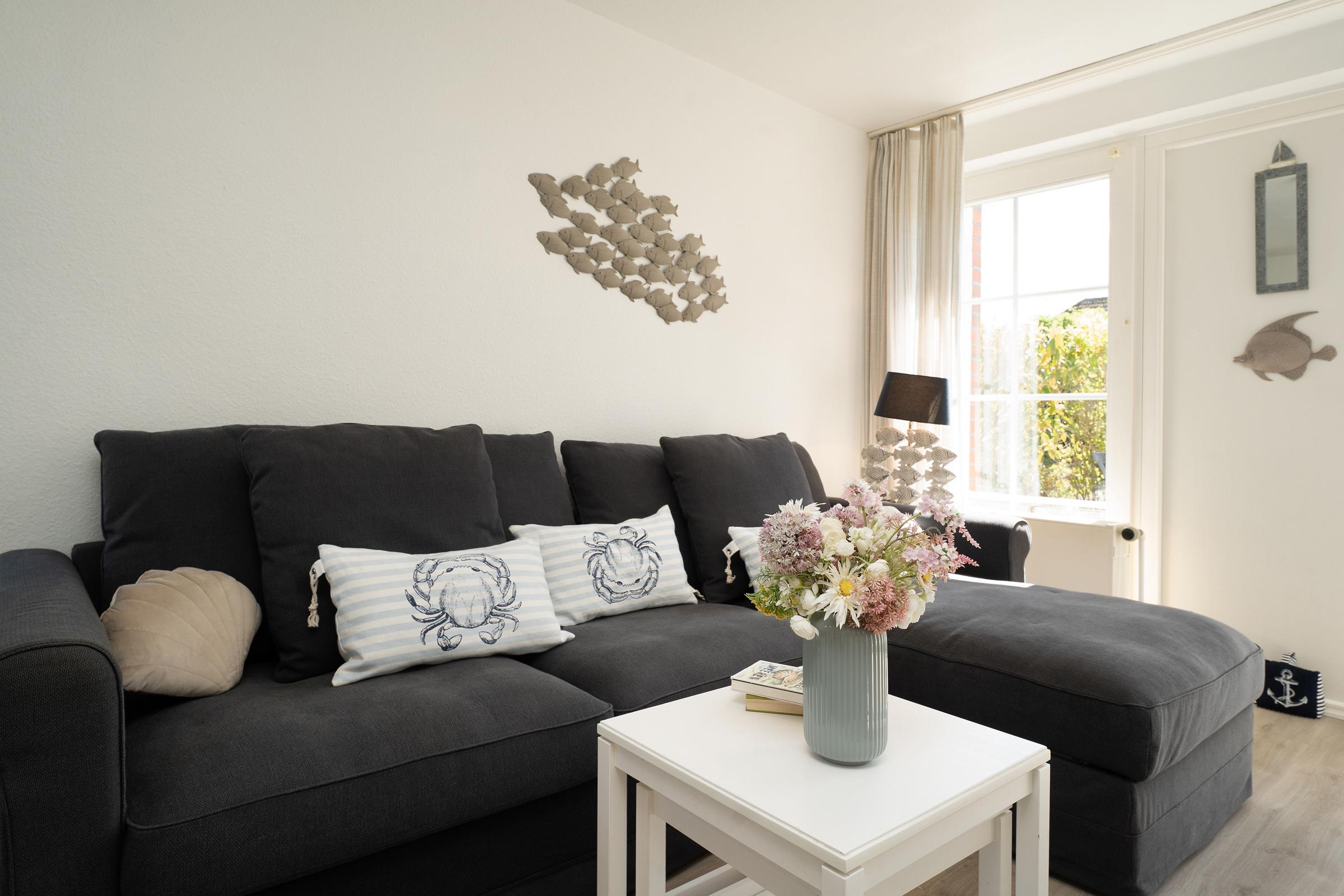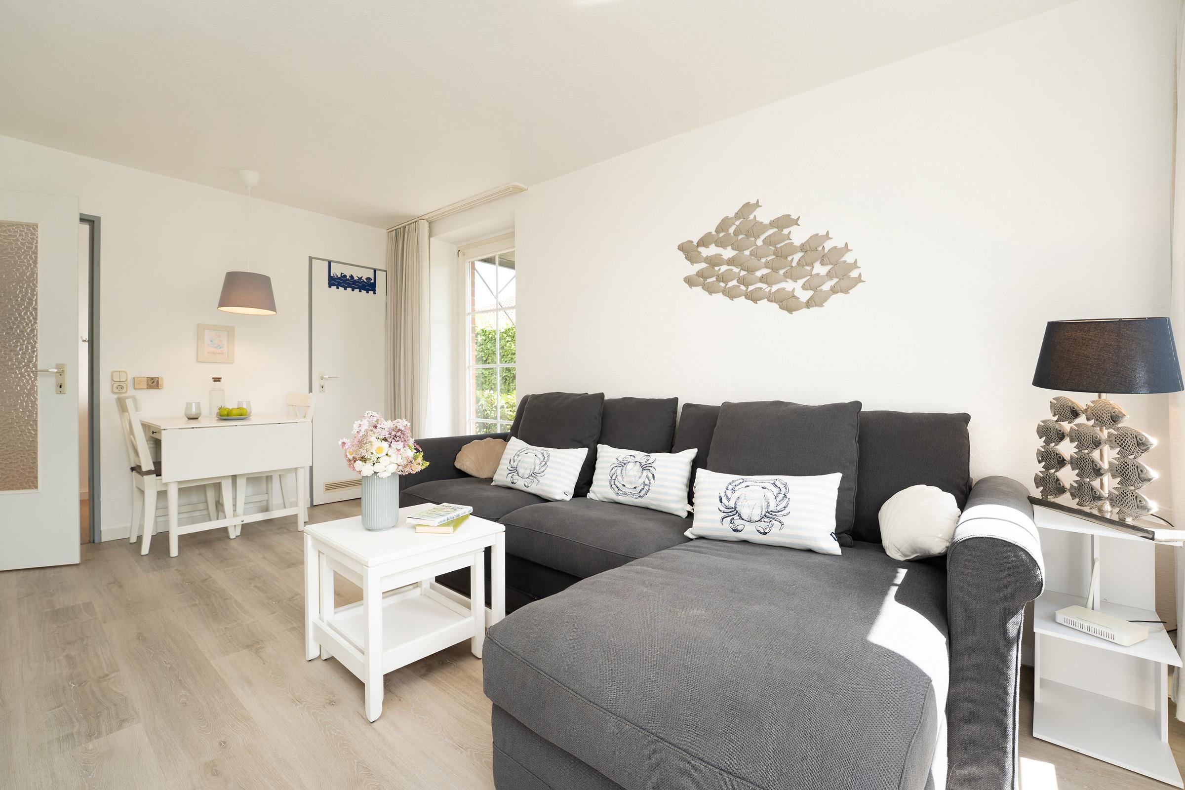 Der Wohnbereich ist einladend gestaltet und lädt mit komfortabler Sitzecke und TV zu entspannten Stunden ein. Von hier aus gelangen Sie direkt auf die möblierte Terrasse – ideal für sonnige Frühstücke oder laue Abende bei Kerzenschein.