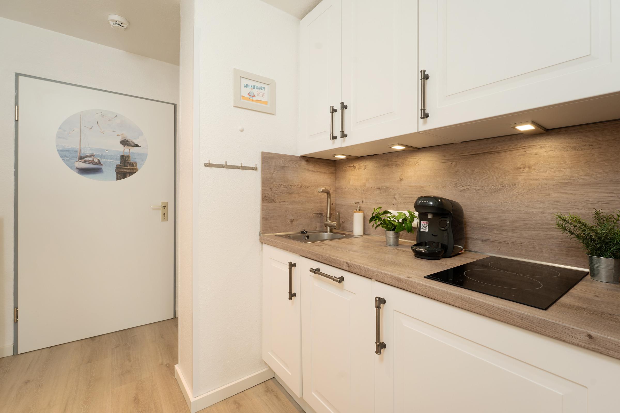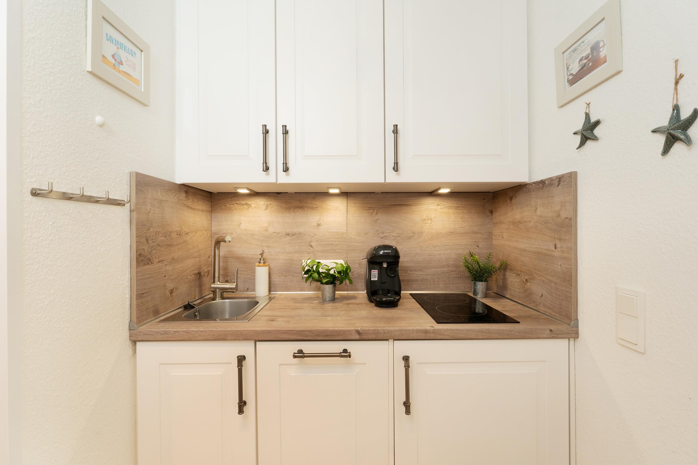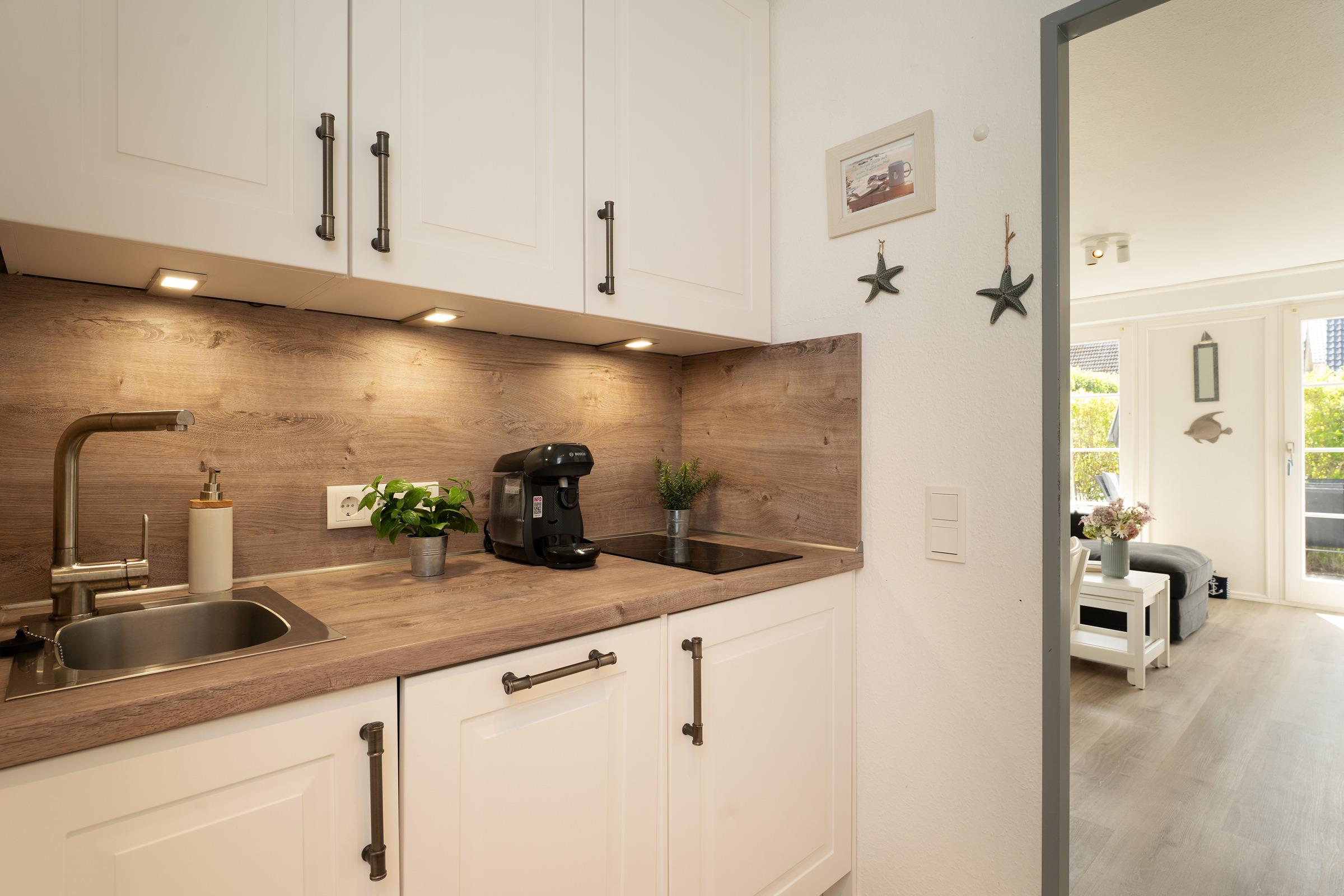 Die geschlossene Küche ist kompakt und funktional ausgestattet: Ein 2-Platten-Herd, ein extra Gefrierschrank, eine Tassimo-Kaffeemaschine, Toaster sowie eine Spülmaschine stehen Ihnen zur Verfügung.