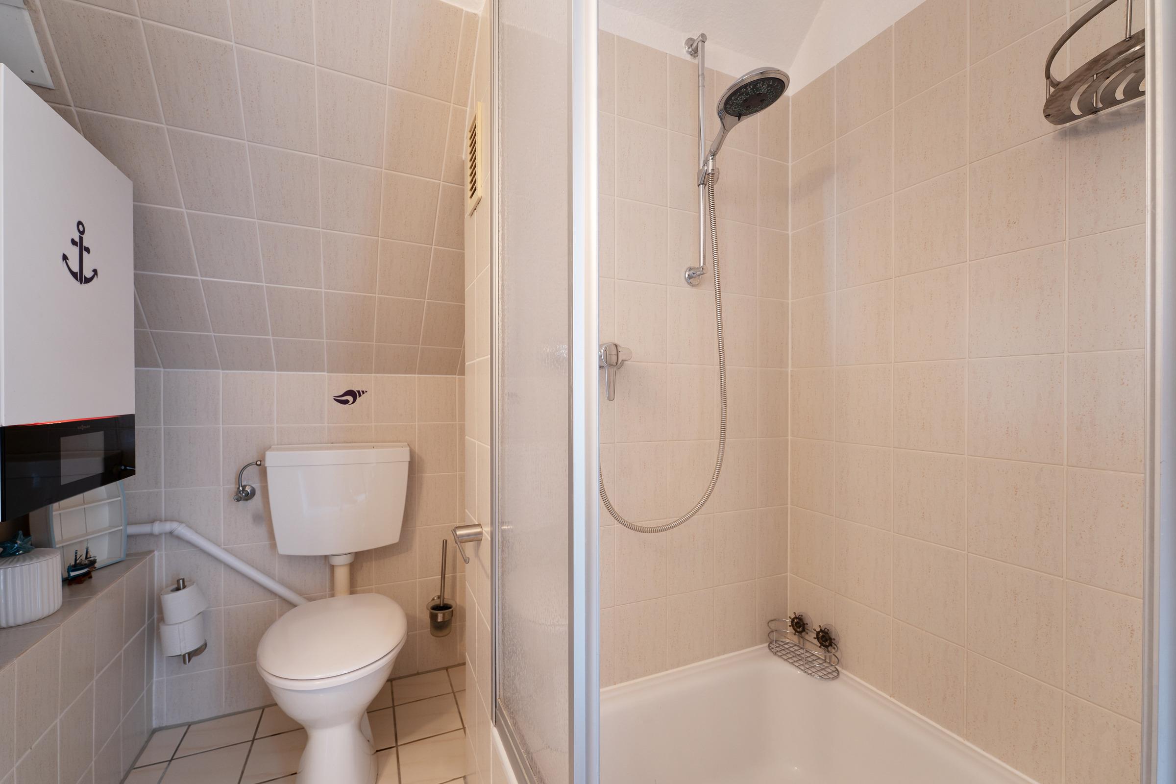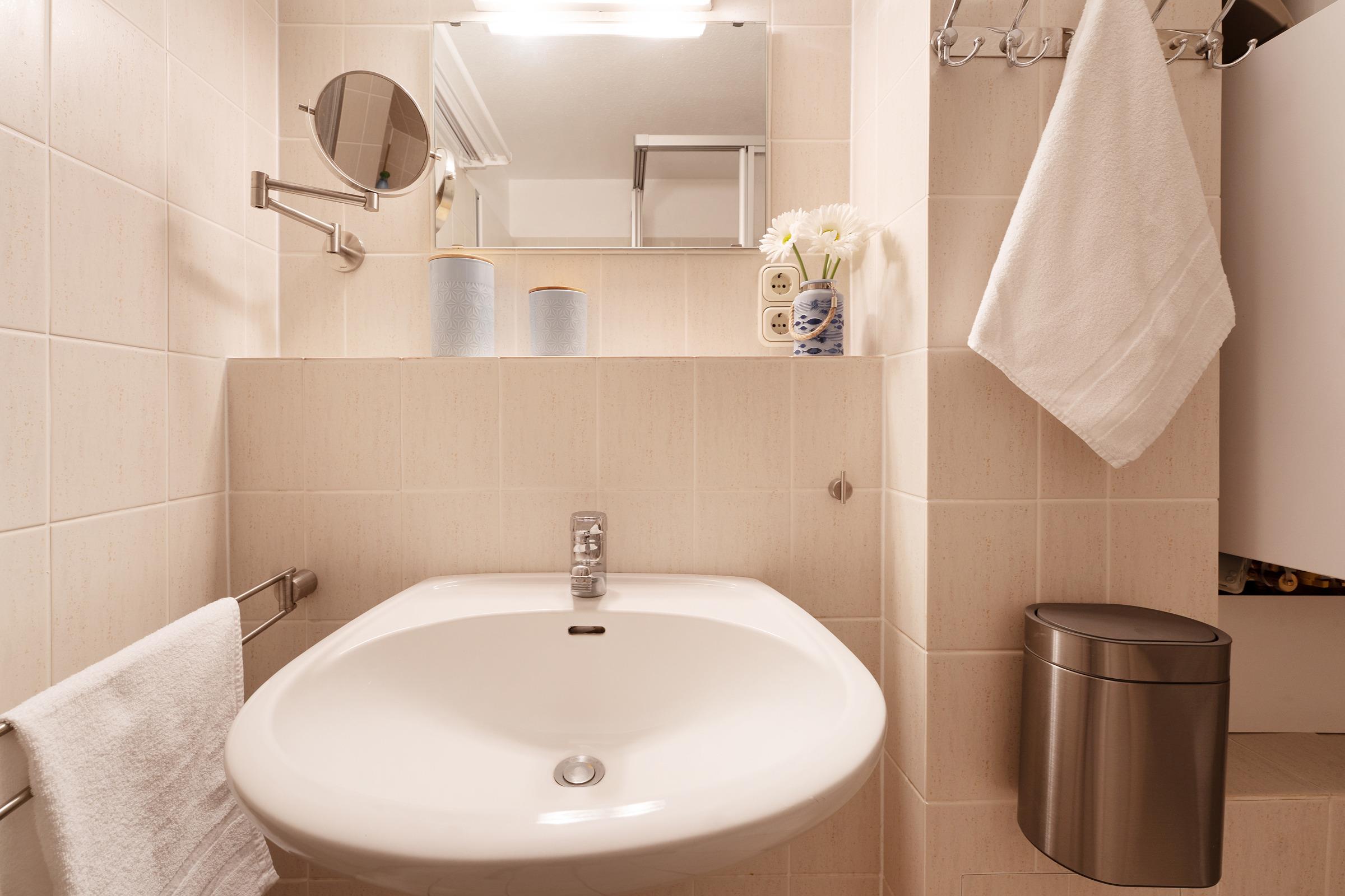 Im hell gefliesten Badezimmer starten Sie erfrischt in Ihren Urlaubstag.