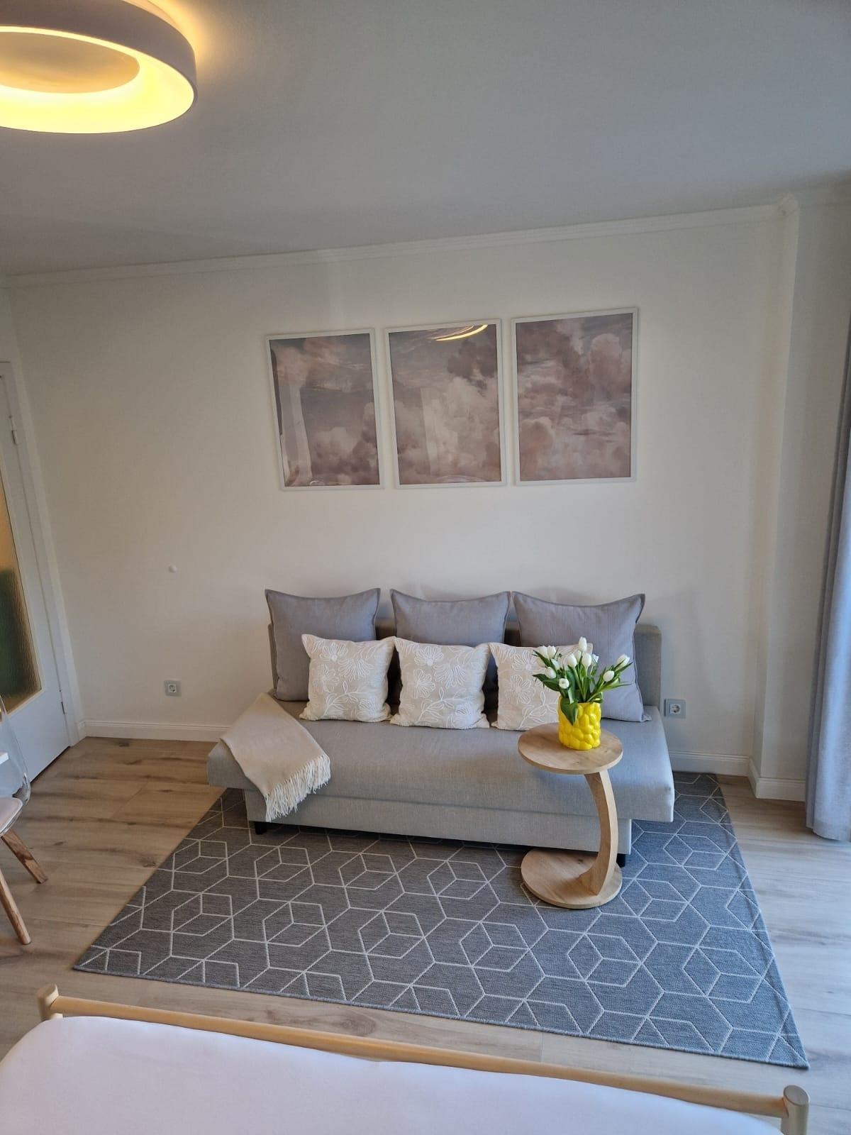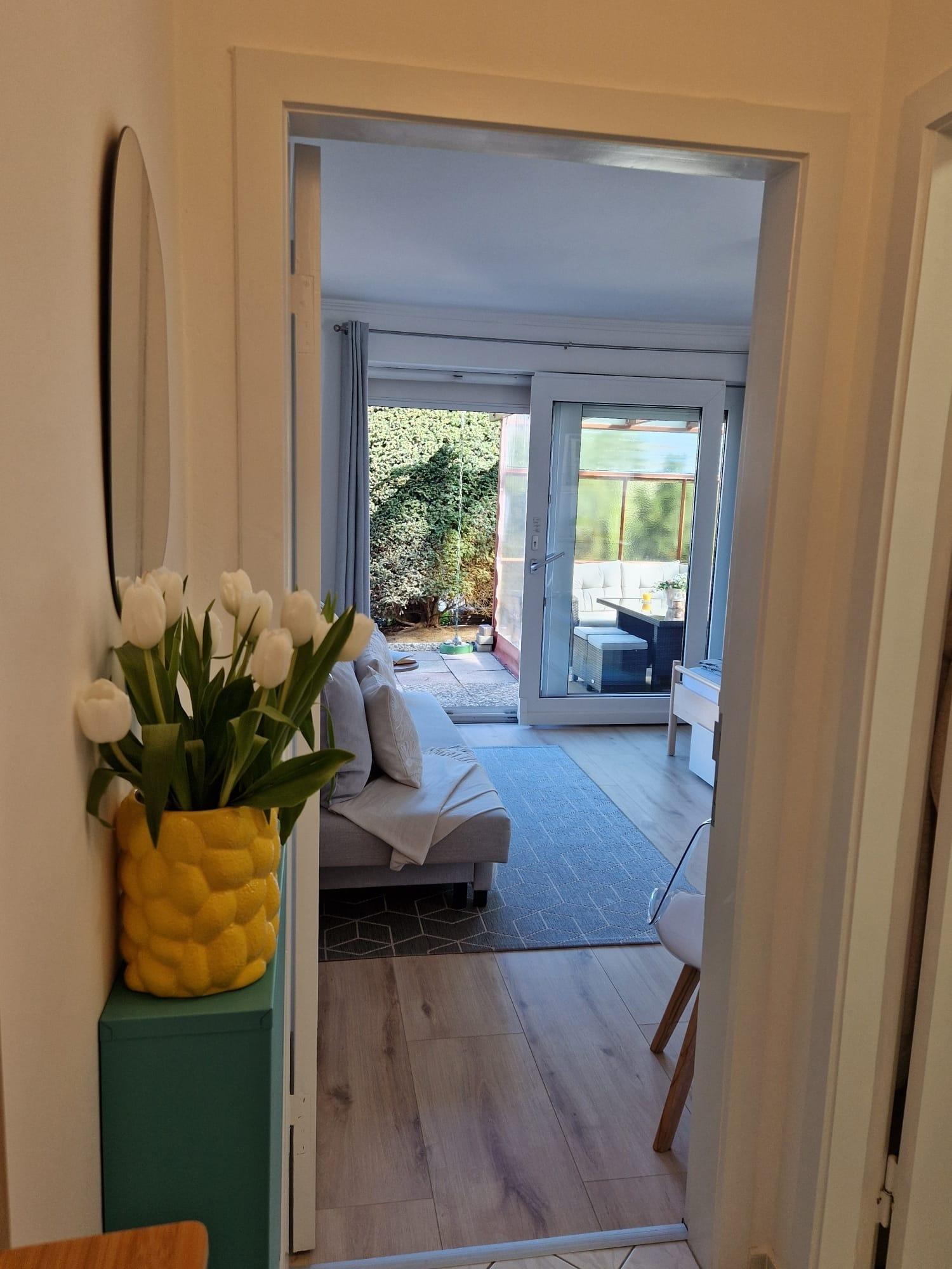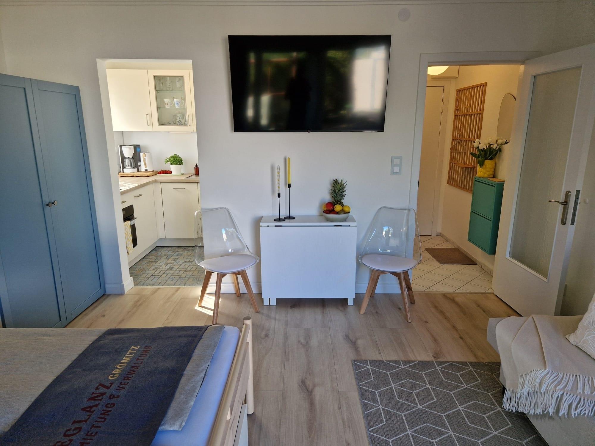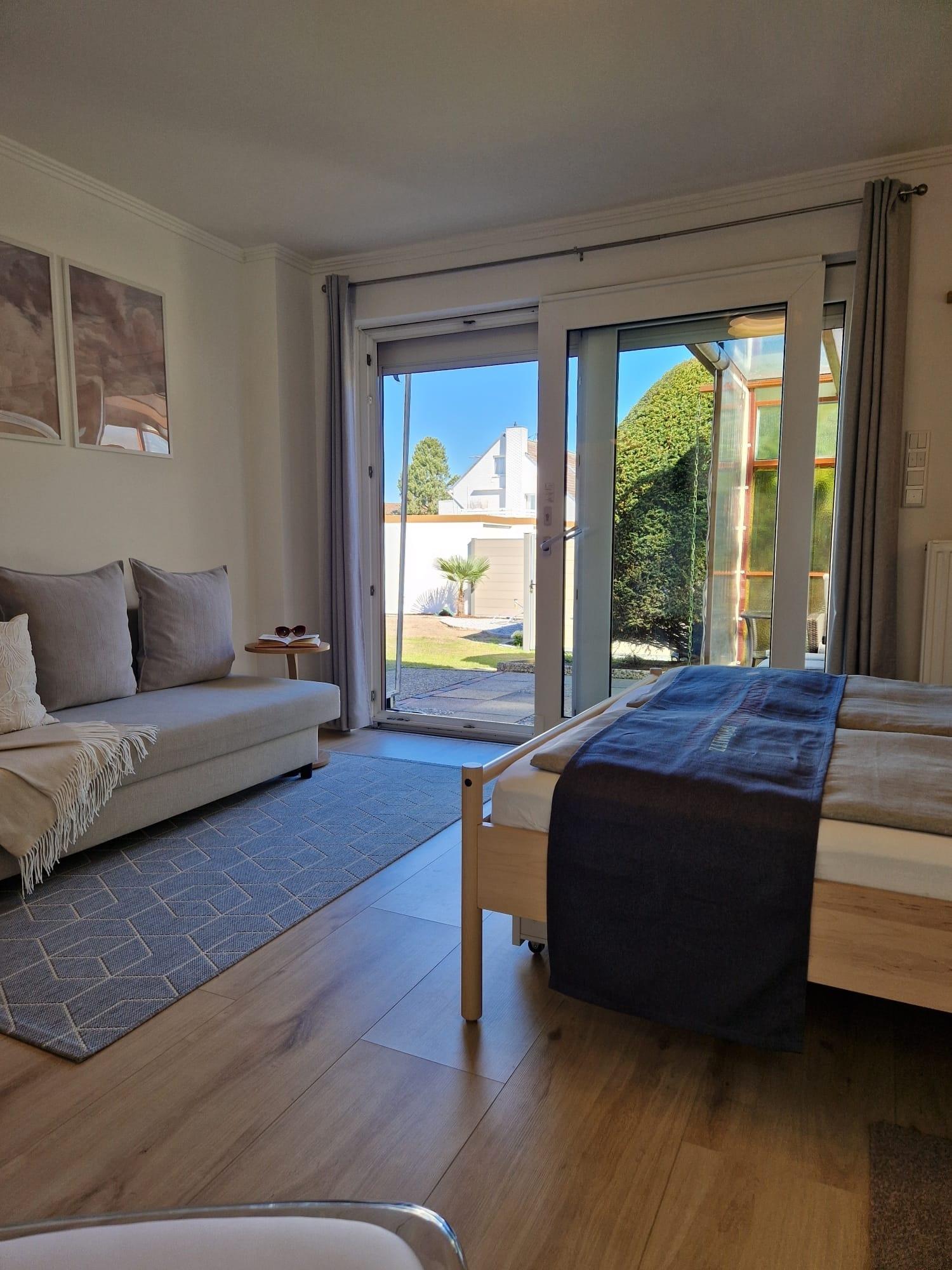 Die stilvoll eingerichtete 1-Zimmer-Ferienwohnung befindet sich im Erdgeschoss und bietet Platz für max. 3 Personen. Die Wohnfläche der ca. 26 m² großen Unterkunft verteilt sich auf ein Wohn-/Schlafzimmer sowie auf eine separate Küche, dem Badezimmer und einem Flur. Das Wohn- / Schlafzimmer ist mit einem Doppelbett 160 x 200 cm und einem gemütlichen Sofa ausgestattet, das man auch zum Bett ausziehen kann (Schlafgröße 140 x 190 cm) , auch ein Kleiderschrank und der Esstisch finden hier Platz. Vom Hauptraum aus, gelangt man auch in den traumhaften und geschmackvoll gestalteten Garten (280 m2), dem Bereich zum Relaxen und der Überdachten Terrasse (7 m2) mit gemütlichen Loungemöbeln. Die separate Küche ist u.a. mit 2 Kochfeldern, Backofen, Kühlschrank, Gefrierfach, Mikrowelle, Toaster und Kaffeemaschine ausgestattet.