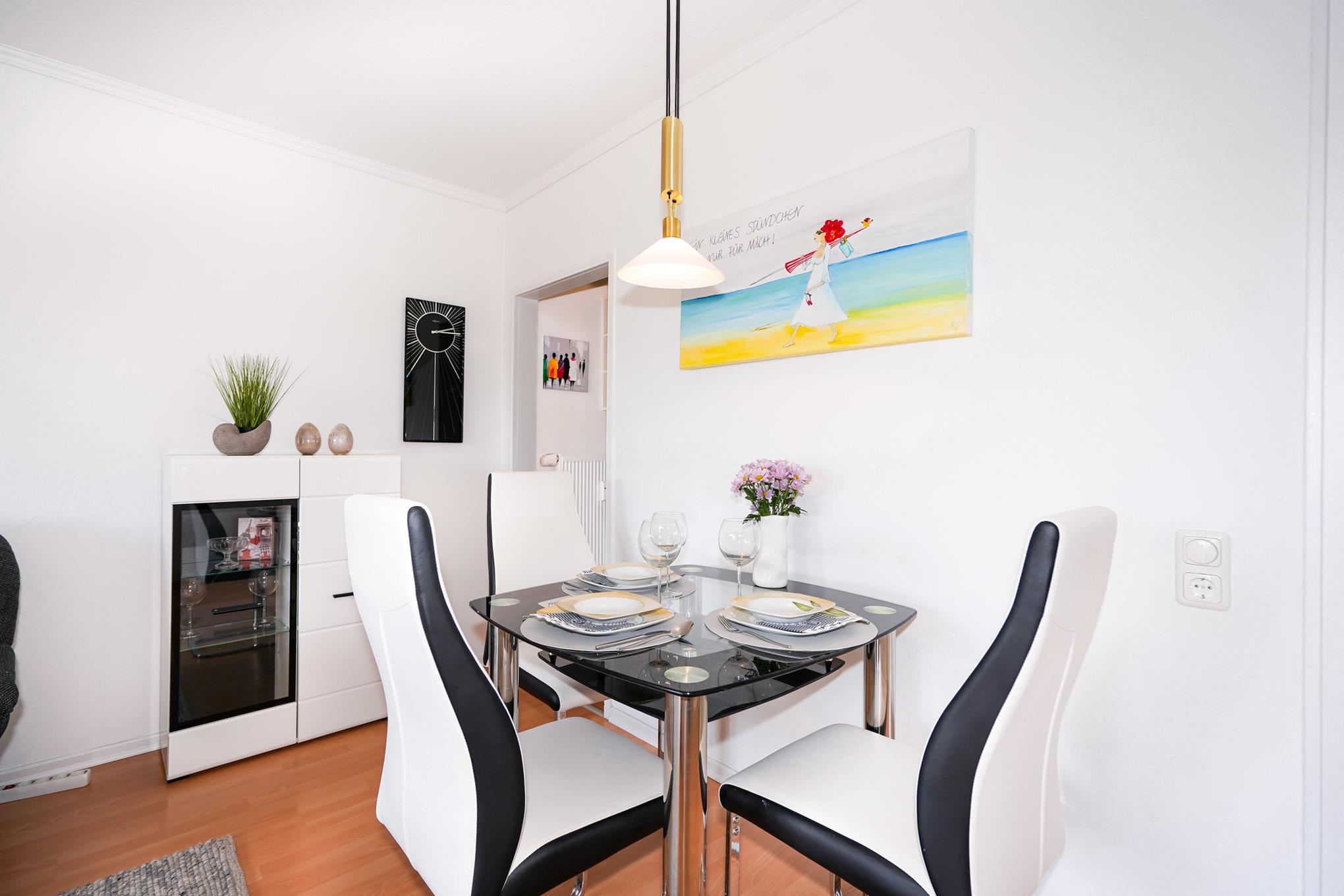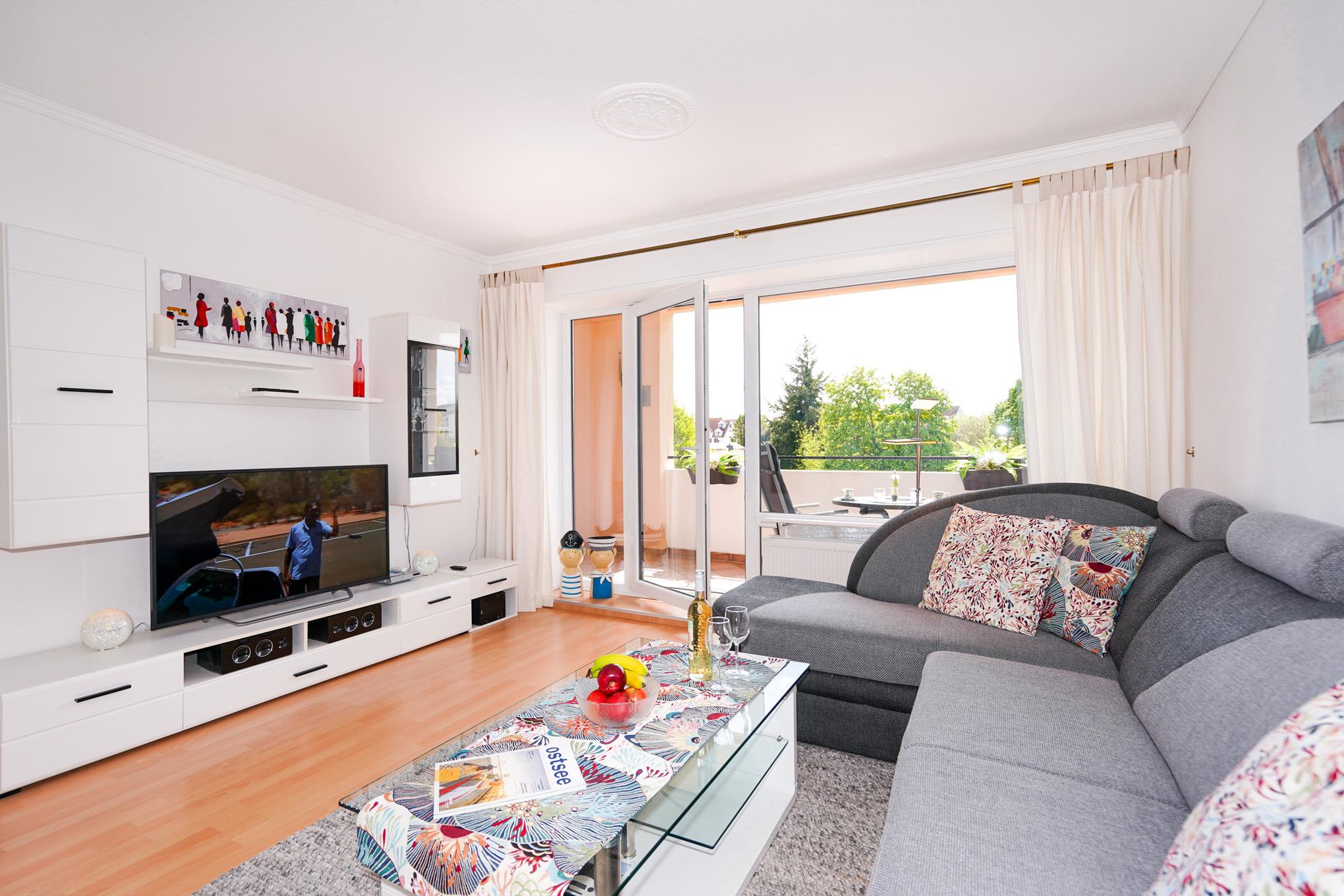 Diese gemütliche 2-Zimmer-Ferienwohnung verfügt über ein helles Wohnzimmer mit einem großen bequemen Schlafsofa (140x200), einem Esstisch für drei Personen und einem Fernseher. Kostenloses W-LAN ist hier selbstverständlich auch vorhanden. Angrenzend erreichen Sie den überdachten Balkon, auf dem Sie von mittags bis abends die Sonne genießen können.