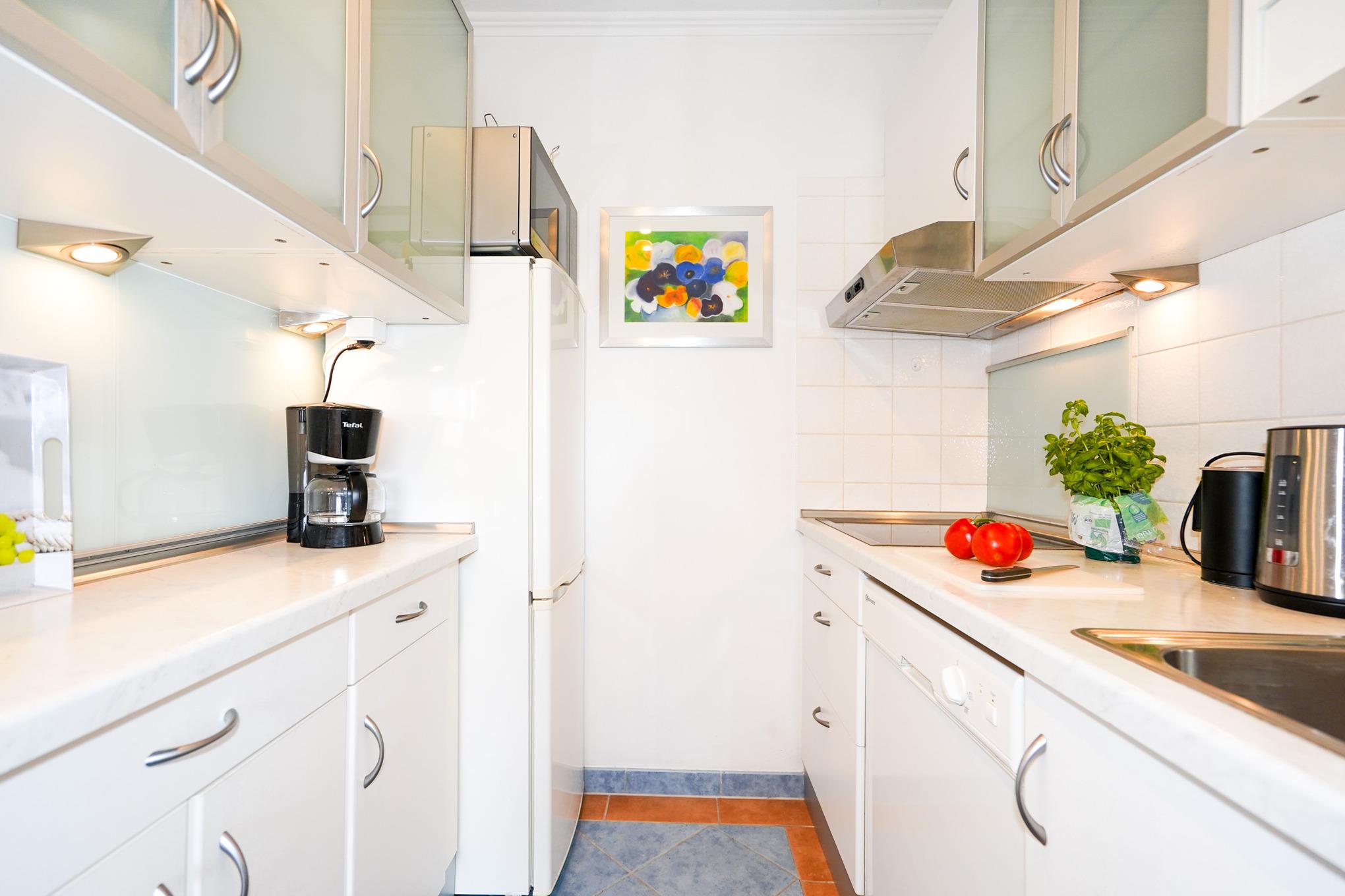 Die separate Küche verfügt über einen Geschirrspüler, Cerankochfeld, Kühlschrank, einen separaten Gefrierschrank und Mikrowelle mit Backfunktion. Im Badezimmer finden Sie eine Eckdusche, Waschbecken, WC und Handtuchheizkörper vor.