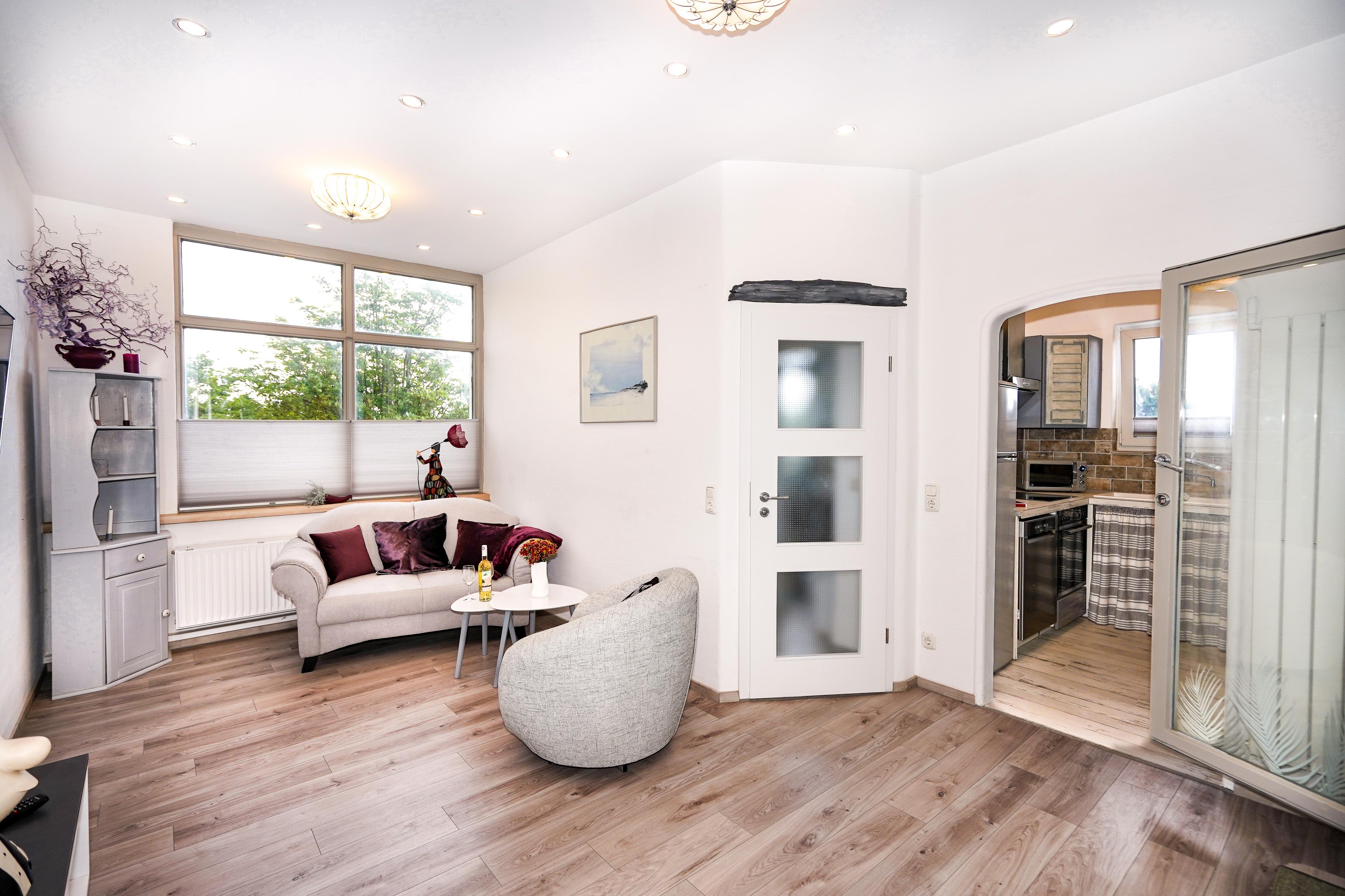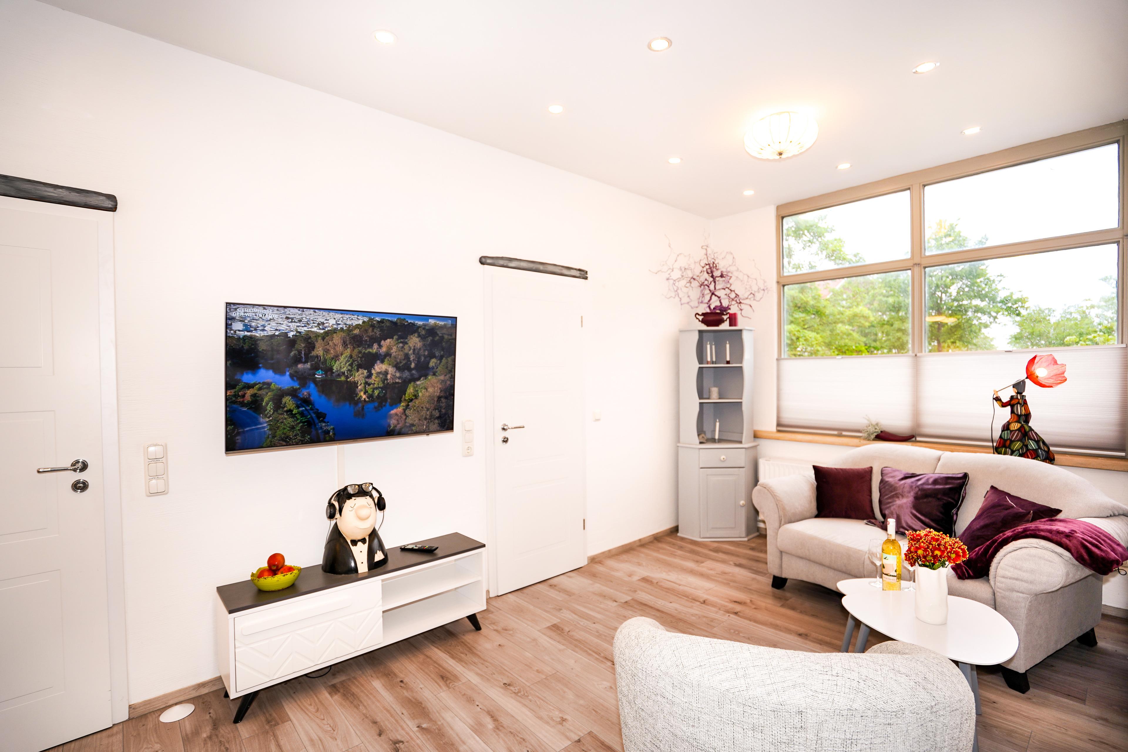 Der offene Wohnzimmerbereich ist lichtdurchflutet und lädt zum Entspannen ein. Hier stehen Ihnen ein gemütliches Zwei-Sitzer-Sofa und ein Sessel zur Verfügung, perfekt für gesellige Abende vor dem Fernseher. Plissees sorgen für einen individuellen Lichteinfall.