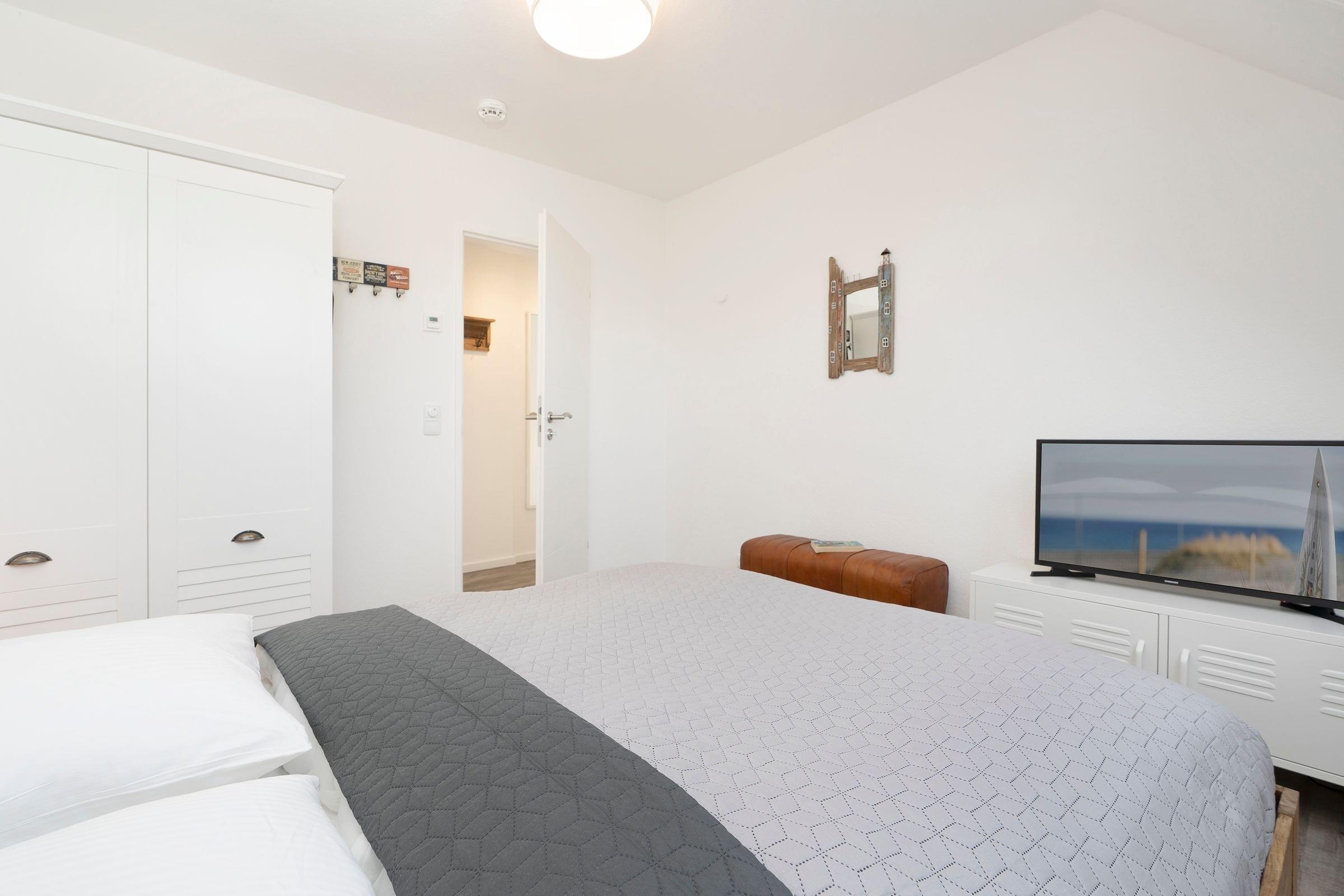 Schlafzimmer 1: Doppelbett (ca. 160x200cm), Kleiderschrank, TV, Verdunkelung (Rollo), kein Platz für Kinderreisebett vorhanden