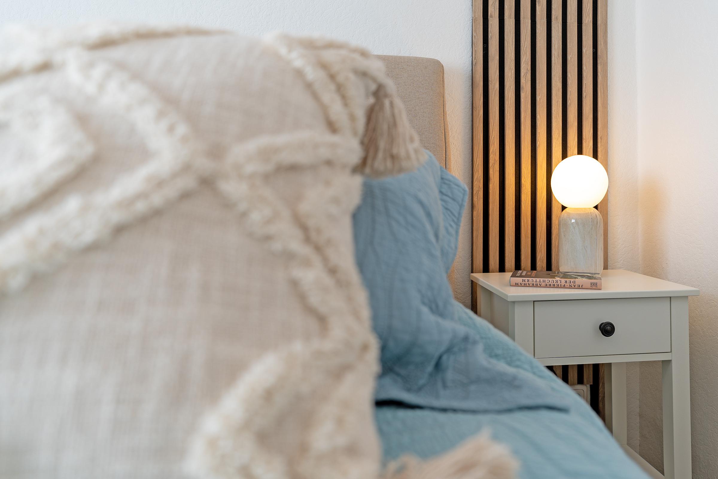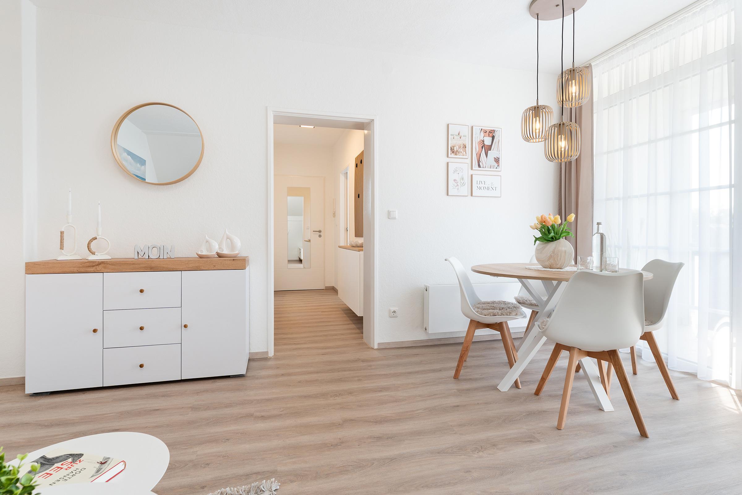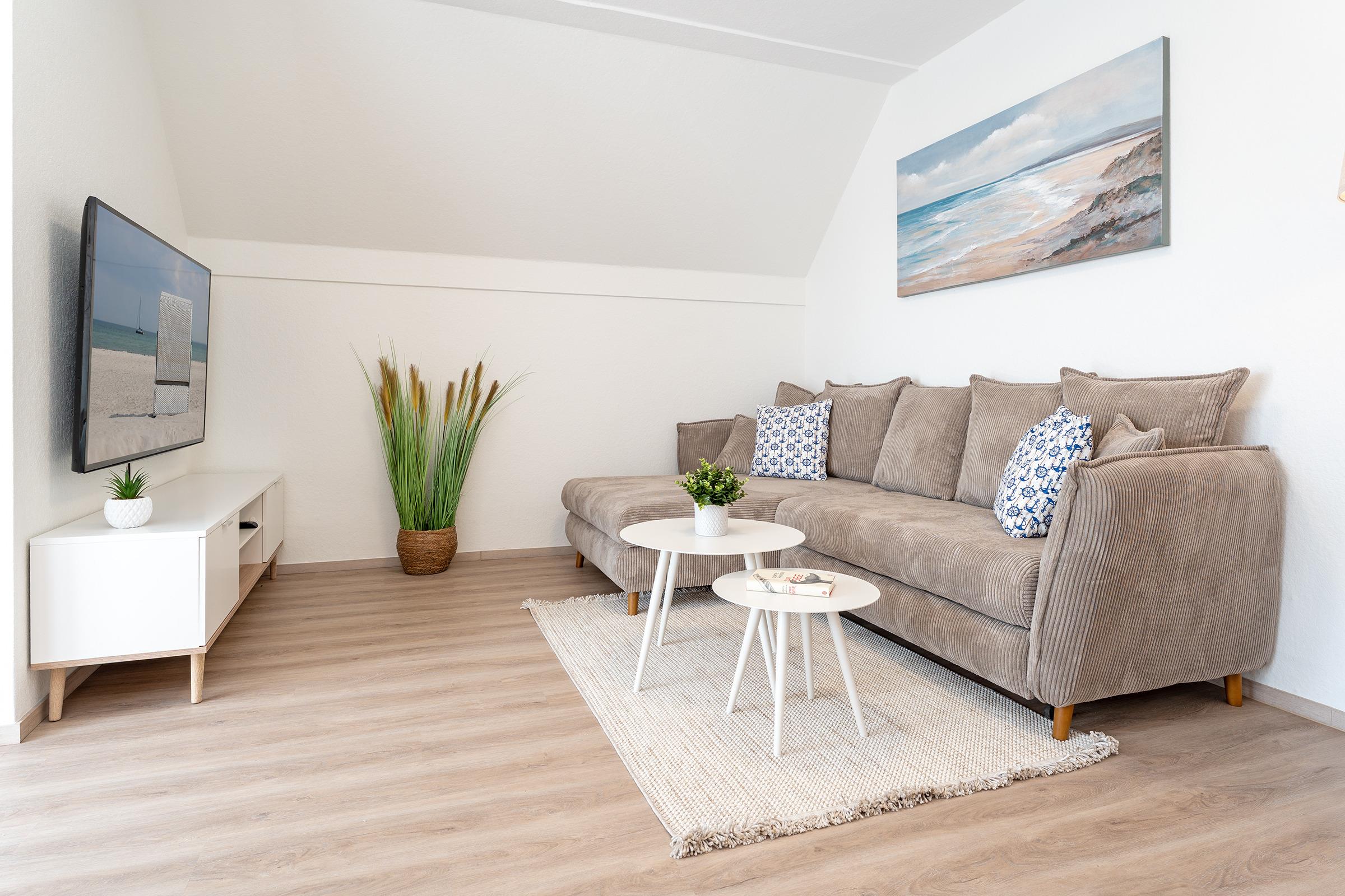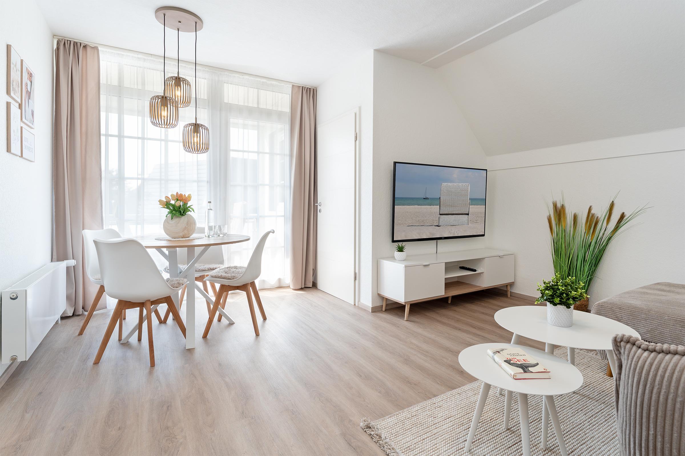 Die Wohnung überzeugt mit einem hellen Wohnbereich, der durch seine moderne Einrichtung und das bequeme Schlafsofa (145x235 cm) zum Verweilen einlädt. Ein Fernseher sorgt für Unterhaltung am Abend. Der möblierte Balkon lädt dazu ein, die frische Ostseeluft zu genießen und den Urlaubstag entspannt ausklingen zu lassen. Die gut ausgestattete Küchenzeile bietet Ihnen alle Annehmlichkeiten, darunter ein Backofen, Kühlschrank mit Gefrierfach, Wasserkocher und Toaster – perfekt für die Zubereitung kleiner Mahlzeiten. Der Essbereich schafft eine angenehme Atmosphäre für gemeinsame Stunden. Im Schlafzimmer erwartet Sie ein komfortables Doppelbett (2x 90x200 cm) für erholsamen Schlaf. Ein weiterer kleiner Raum mit Arbeitsplatz kann bei Bedarf als Home Office-Möglichkeit oder als ruhiger Rückzugsort für ein Kinderreisebett genutzt werden. Das Badezimmer ist mit WC und Dusche sowie einem beheizbaren Handtuchhalter und einem Haartrockner ausgestattet - so starten Sie gut in den Tag.