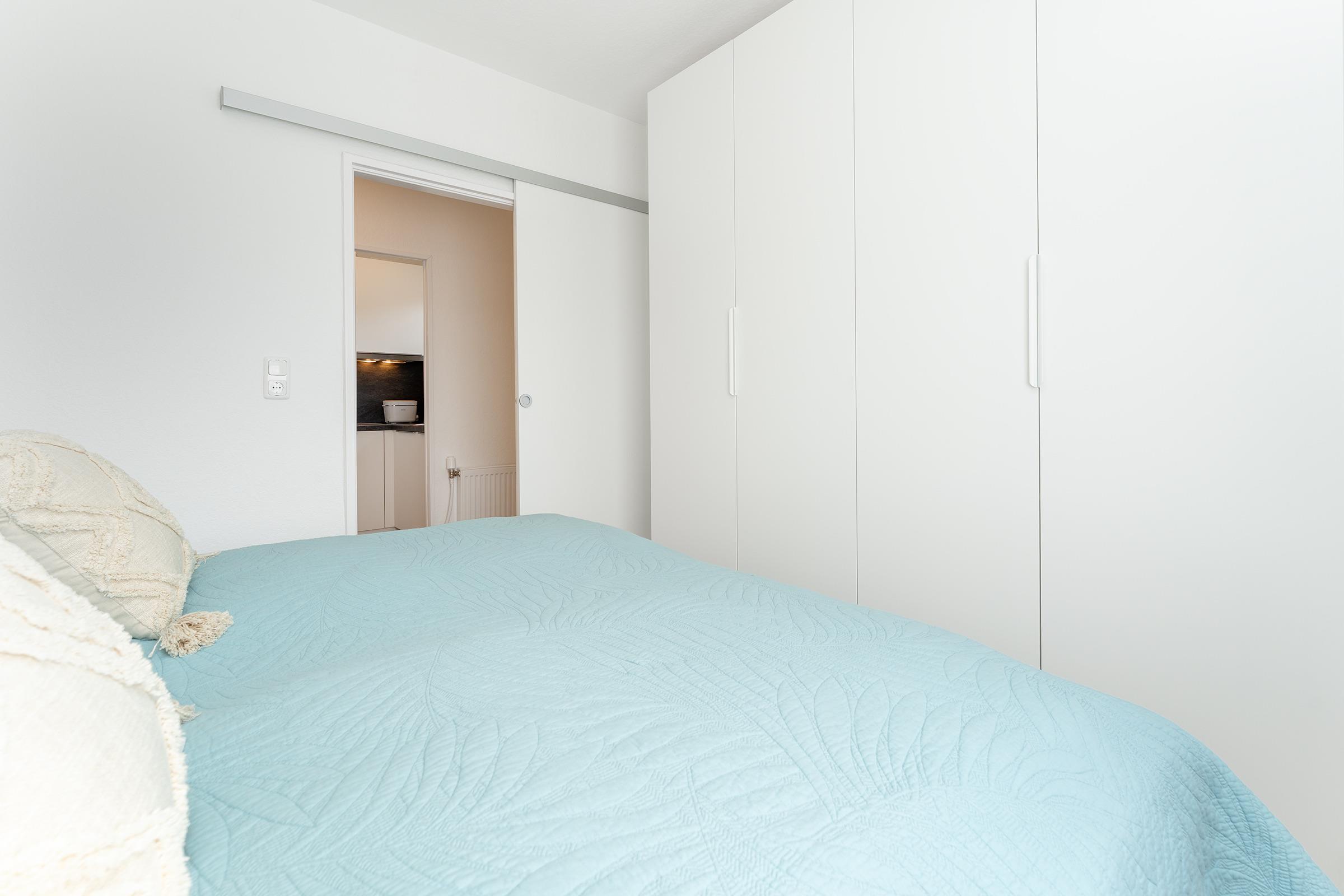 Schlafzimmer: 1 Doppelbett (2x 9x200 cm), Kleiderschrank, Verdunkelung: Rollläden/Gardine, kein Platz für ein Babybett