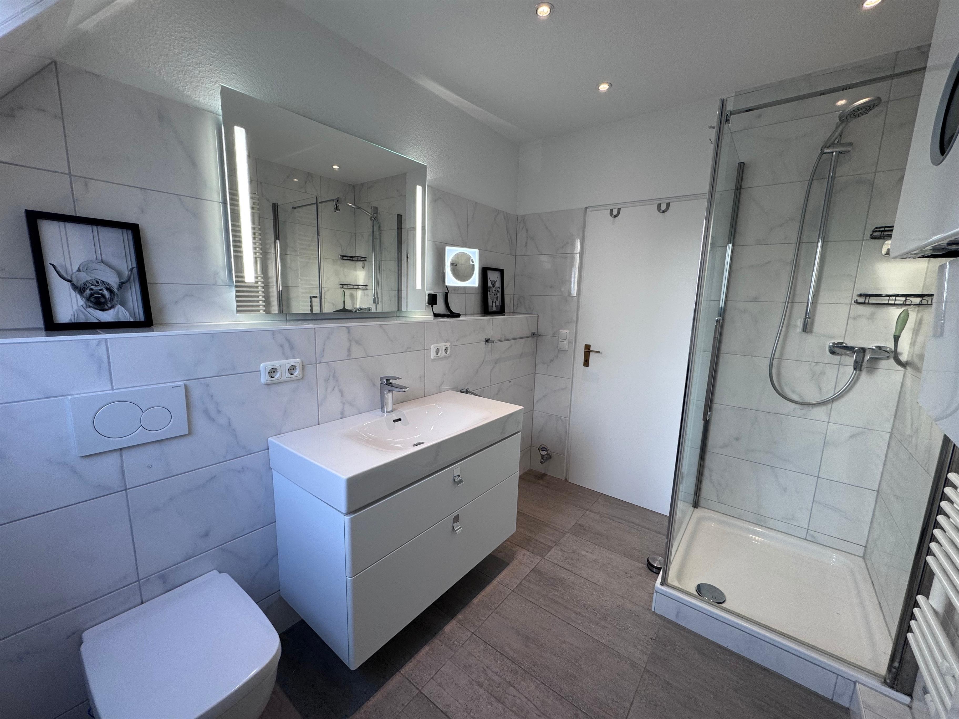 Das hell geflieste Tageslichtbad mit Duschkabine, Waschtisch und WC sowie einem beleuchteten Kosmetikspiegel rundet das Wohlfühlambiente ab.