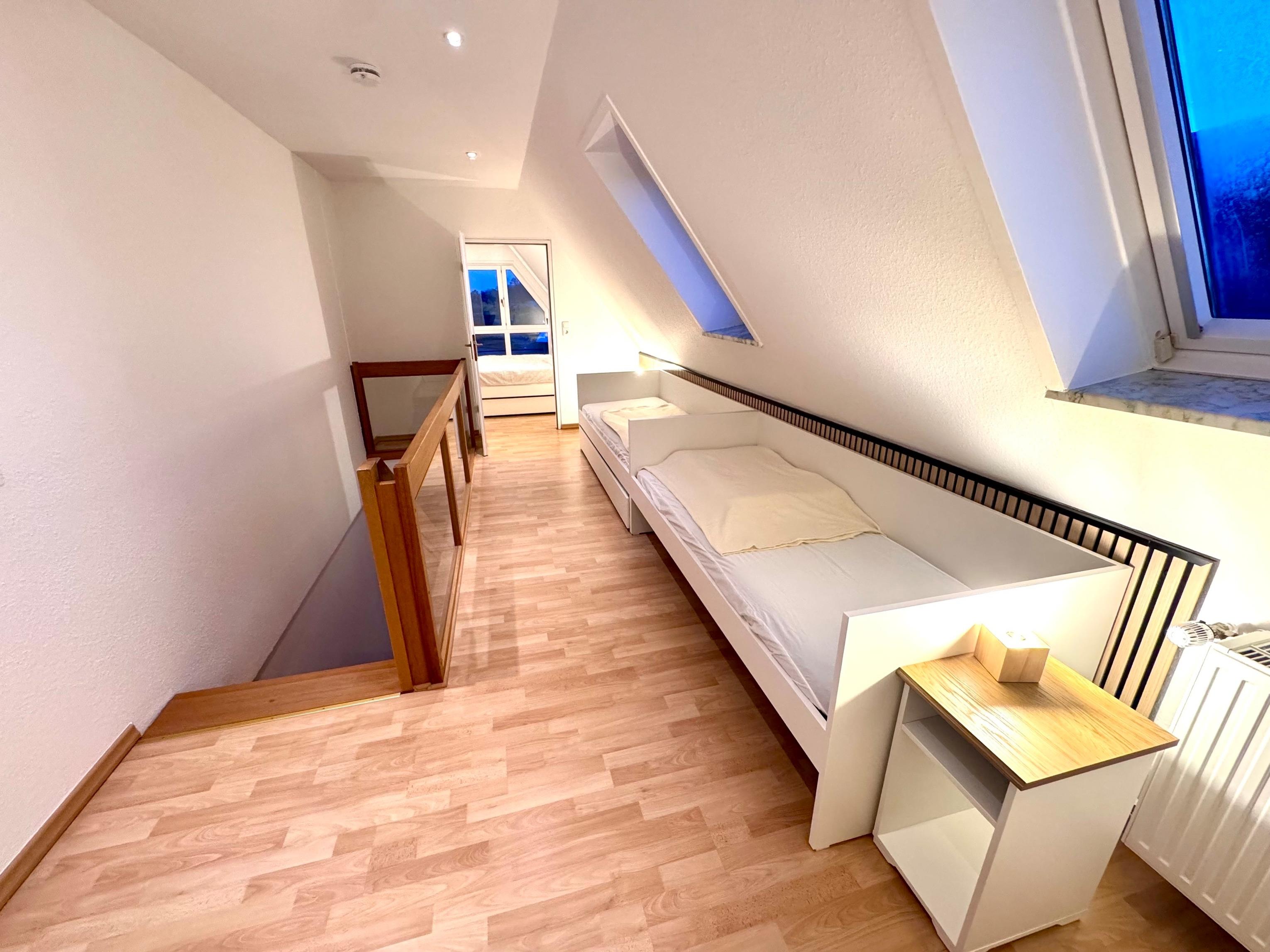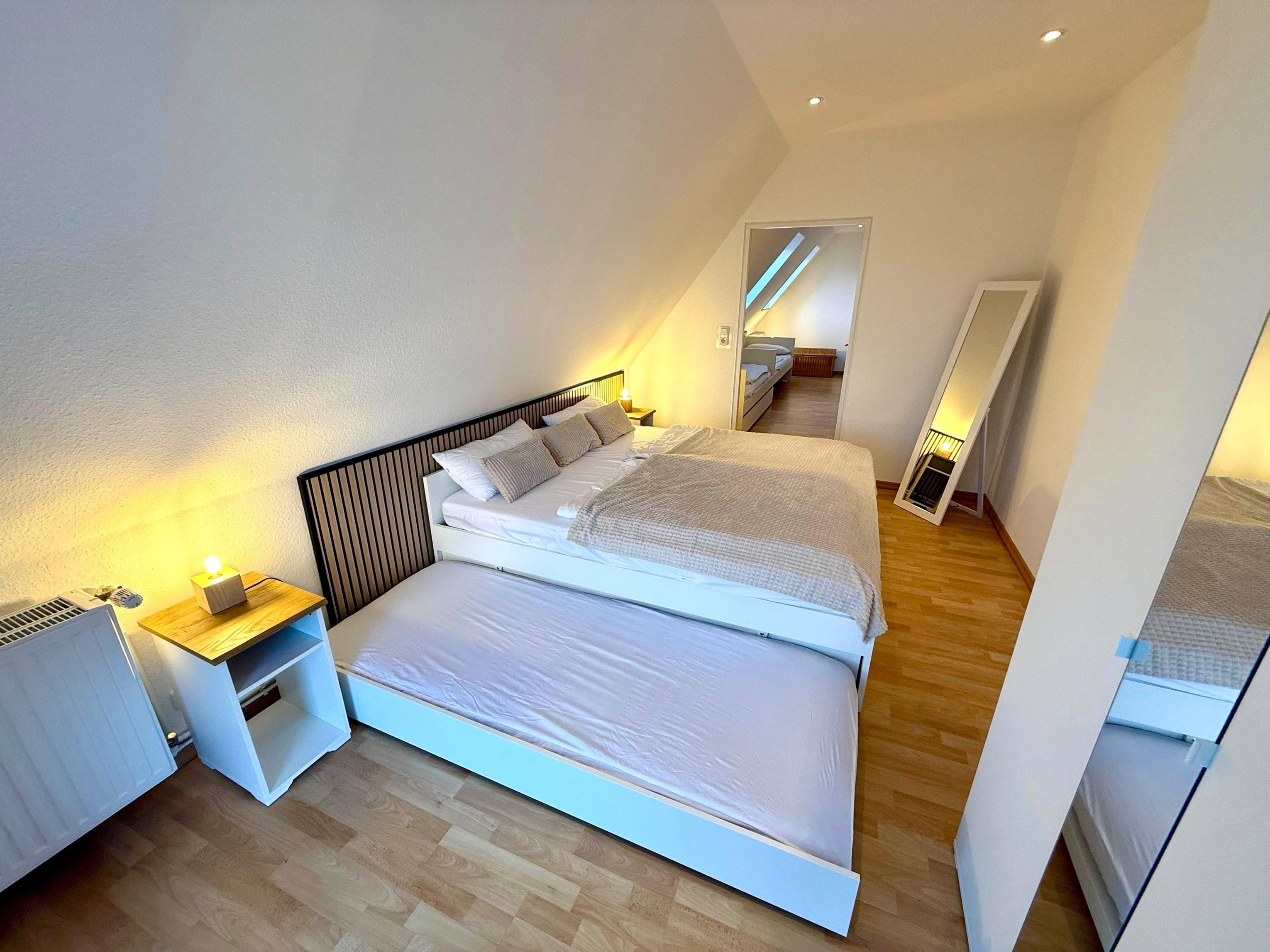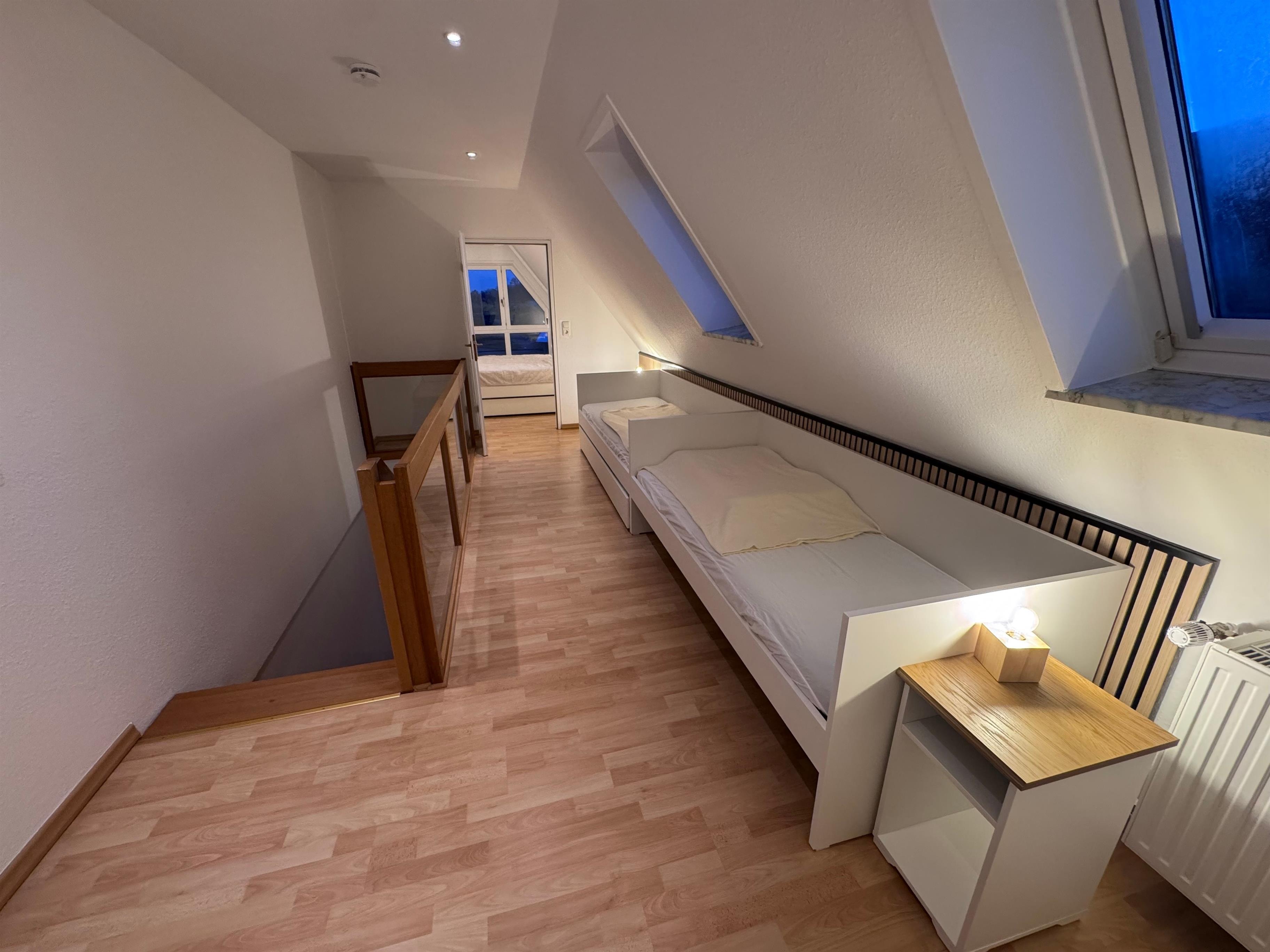 Über eine Treppe gelangen Sie vom Wohnzimmer auf die offene Empore des Dachgeschosses. Hier finden sich zwei Einzelbetten und ein geräumiger Kleiderschrank. Unmittelbar daneben finden Sie das Schlafzimmer mit großem Doppelbett und Kleiderschrank. Ein besonderes Highlight ist eine weitere Schlafoption für die kleinsten Gäste: unter dem Ehebett befinden sich zwei ausziehbare Unterbetten.