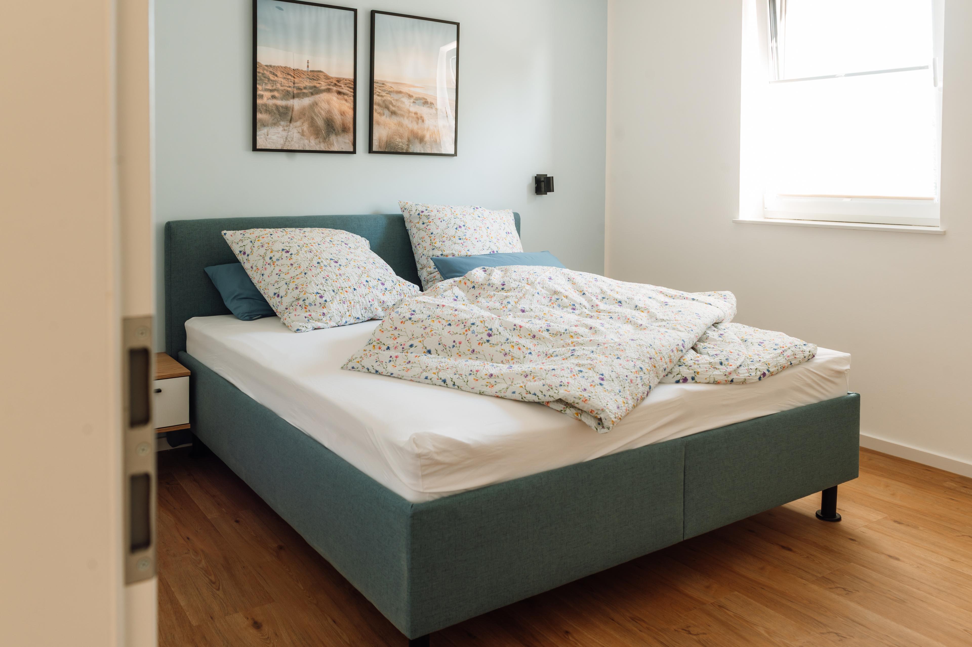 Im Schlafzimmer wartet ein gemütliches Bett auf dich – perfekt, um neue Energie zu tanken.