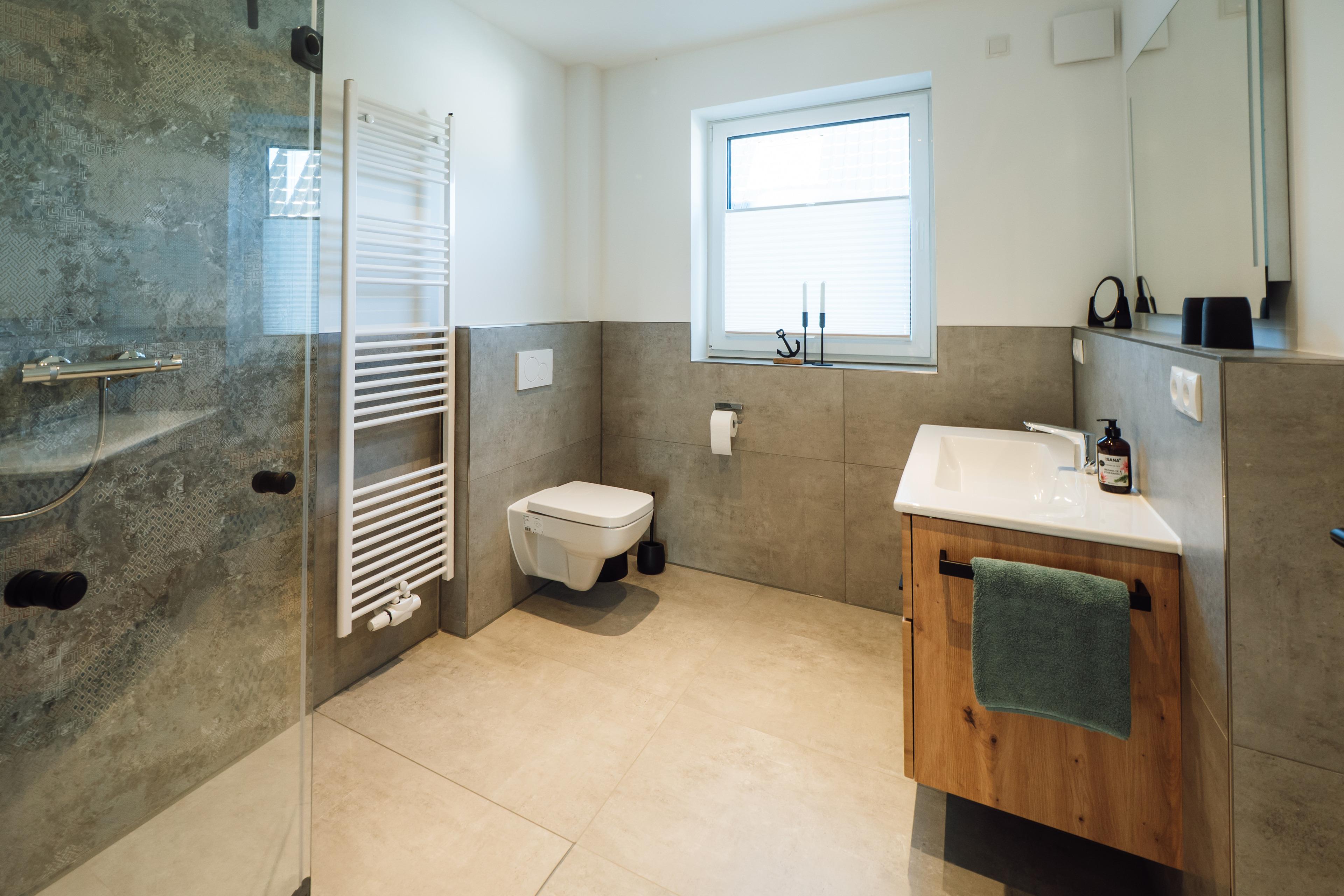 Das Bad mit bodengleicher Dusche ist modern, klar und angenehm großzügig.